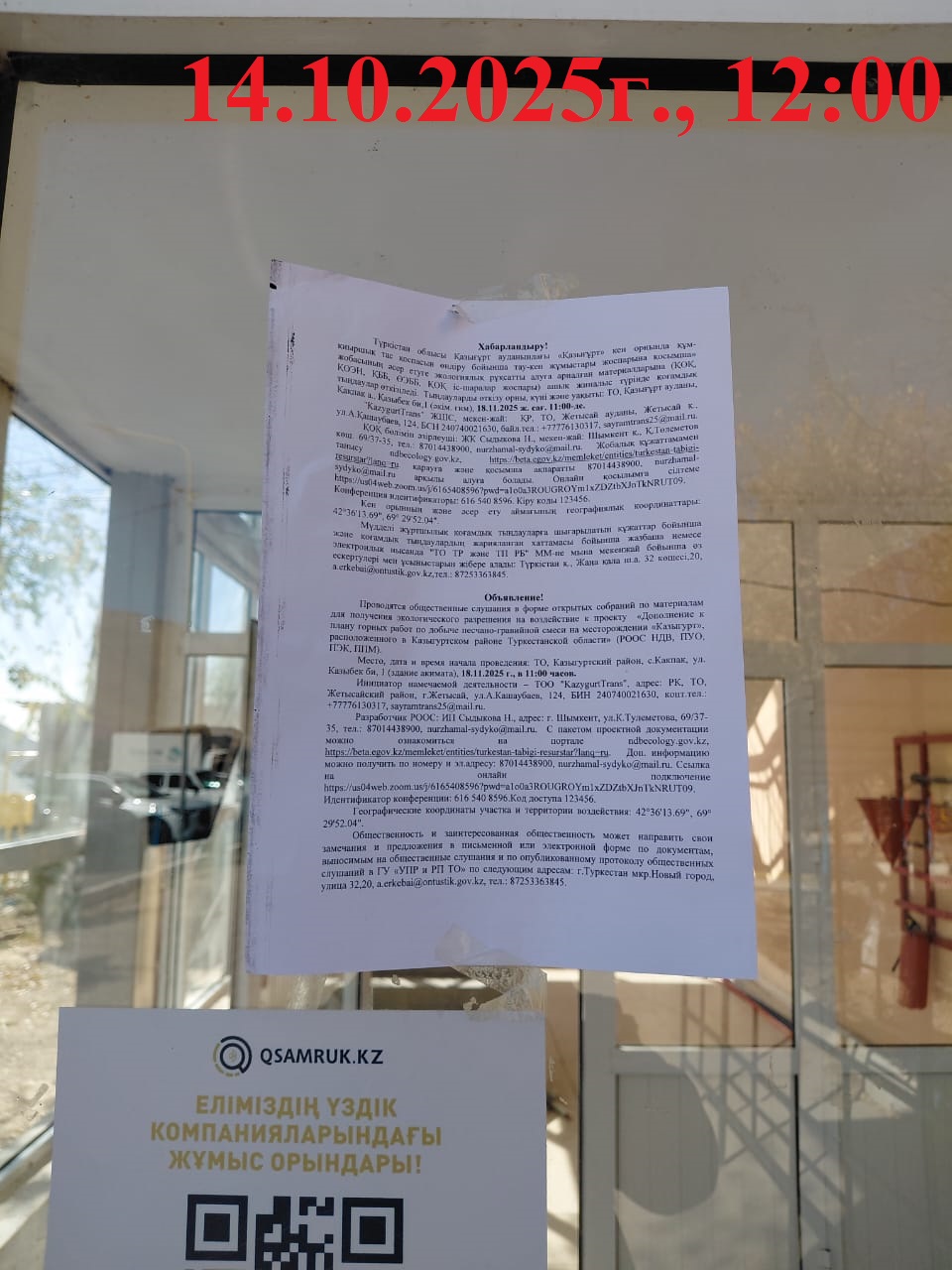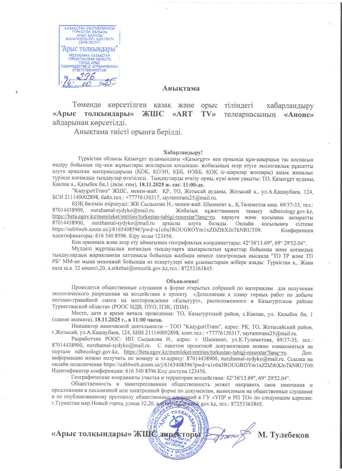 3. Общественные слушания организованны: Управление природных ресурсов и регулирования природопользования Туркестанской области, a.erkebai@ontustik.gov.kz,