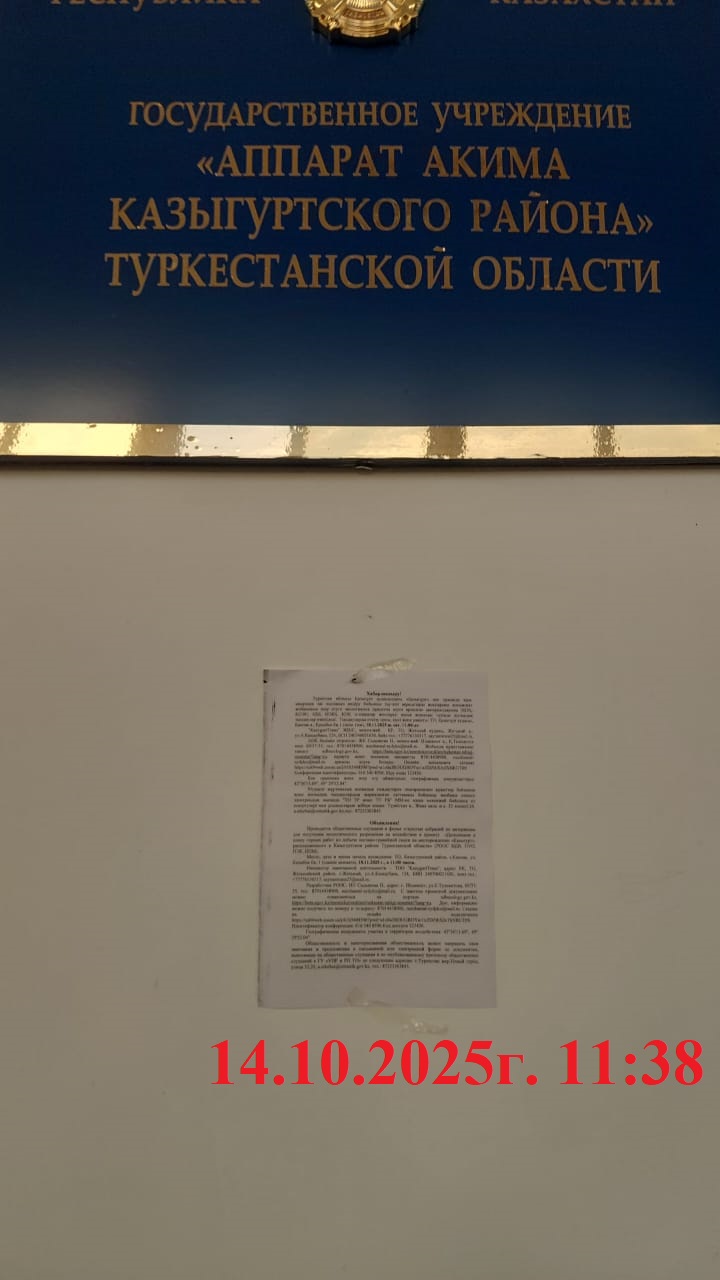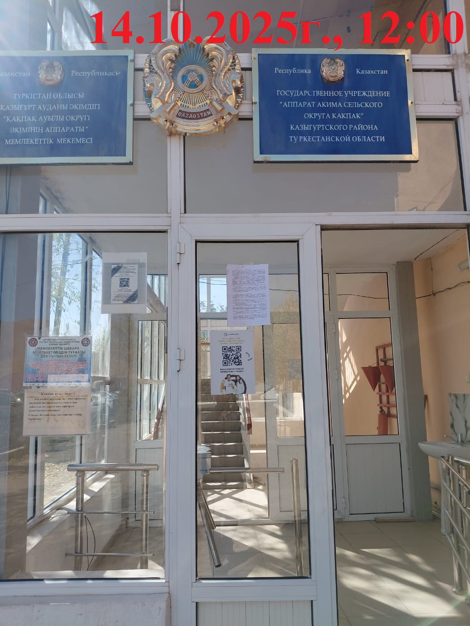 6.3. расположение мест, специально предназначенных для Размещения печатных объявлений (доски объявлений): Туркестанская область, Казыгуртский район, Какпакский с.о., с.Какпак, ул. Казыбек би, 1 (здание акимата)
