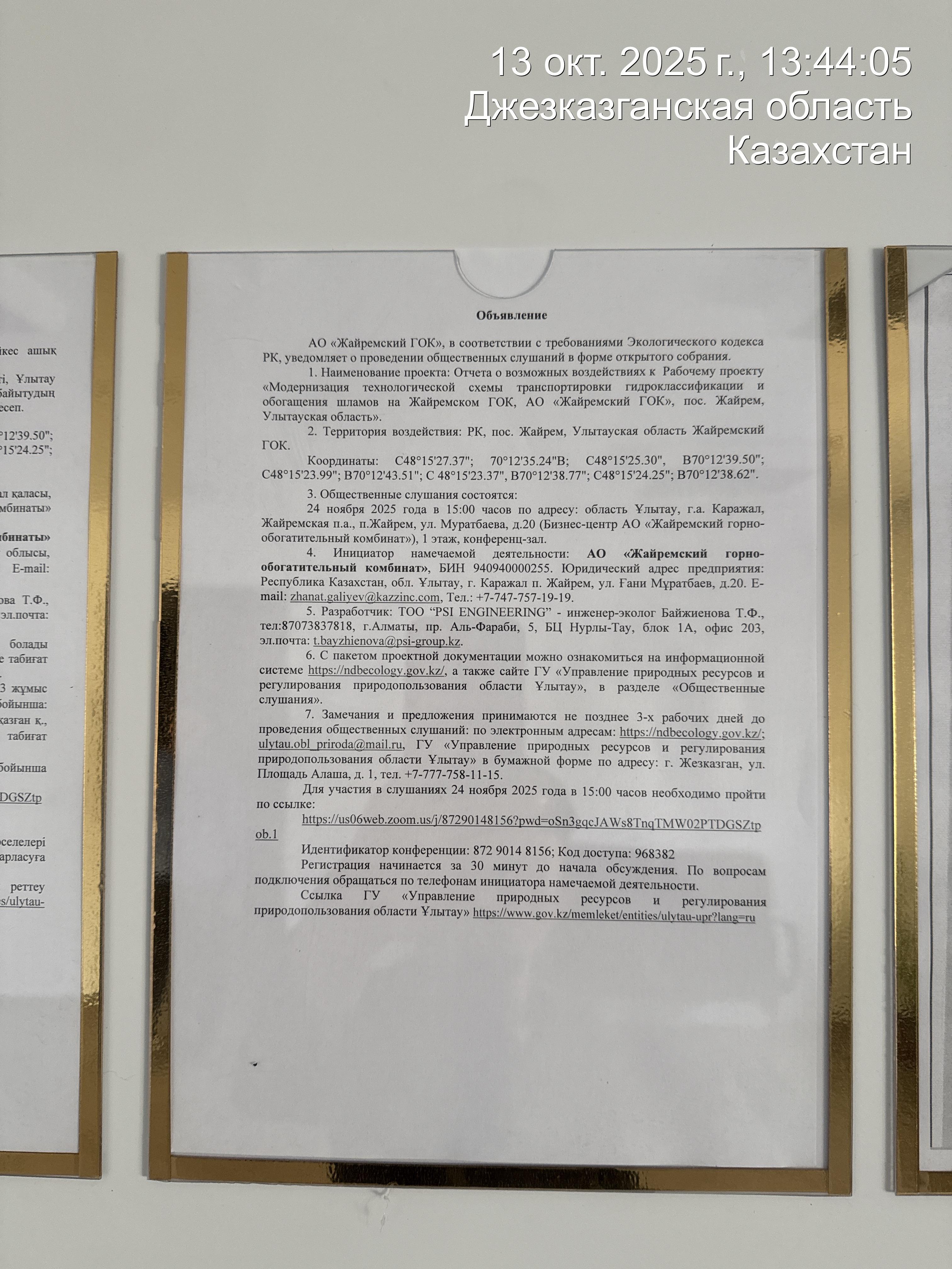 1.4. Описание для подключения к онлайн трансляции при прохождении общественного слушания: в соответствии с пп.4, п.11 прил. 3 Правил, информация о проведении общественных слушаний должна быть распространена на государственном и русском языках на досках объявлений местных исполнительных органов административно-территориальных единиц и в местах, специально предназначенных для размещения объявлений. В связи с чем необходимо дополнительно разместить печатные объявления на досках объявлений в акимате и в местах, специально предназначенных для размещения объявлений.