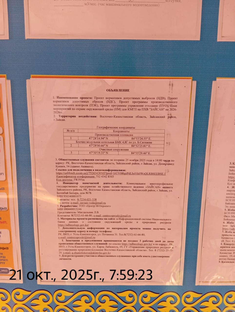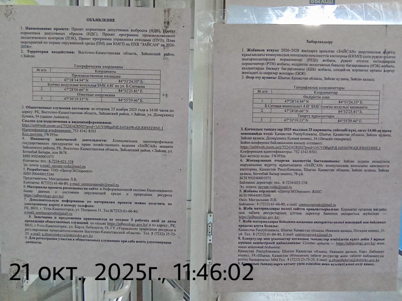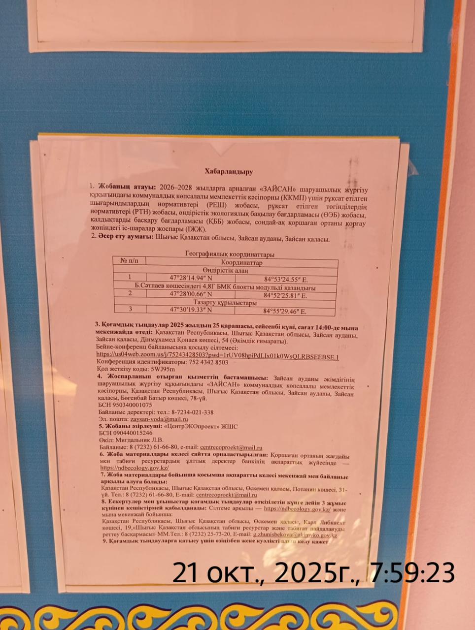 3. Общественные слушания организованны: Управление природных ресурсов и регулирования природопользования Восточно-Казахстанской области, g.zhunisbekova@akimvko.gov.kz,