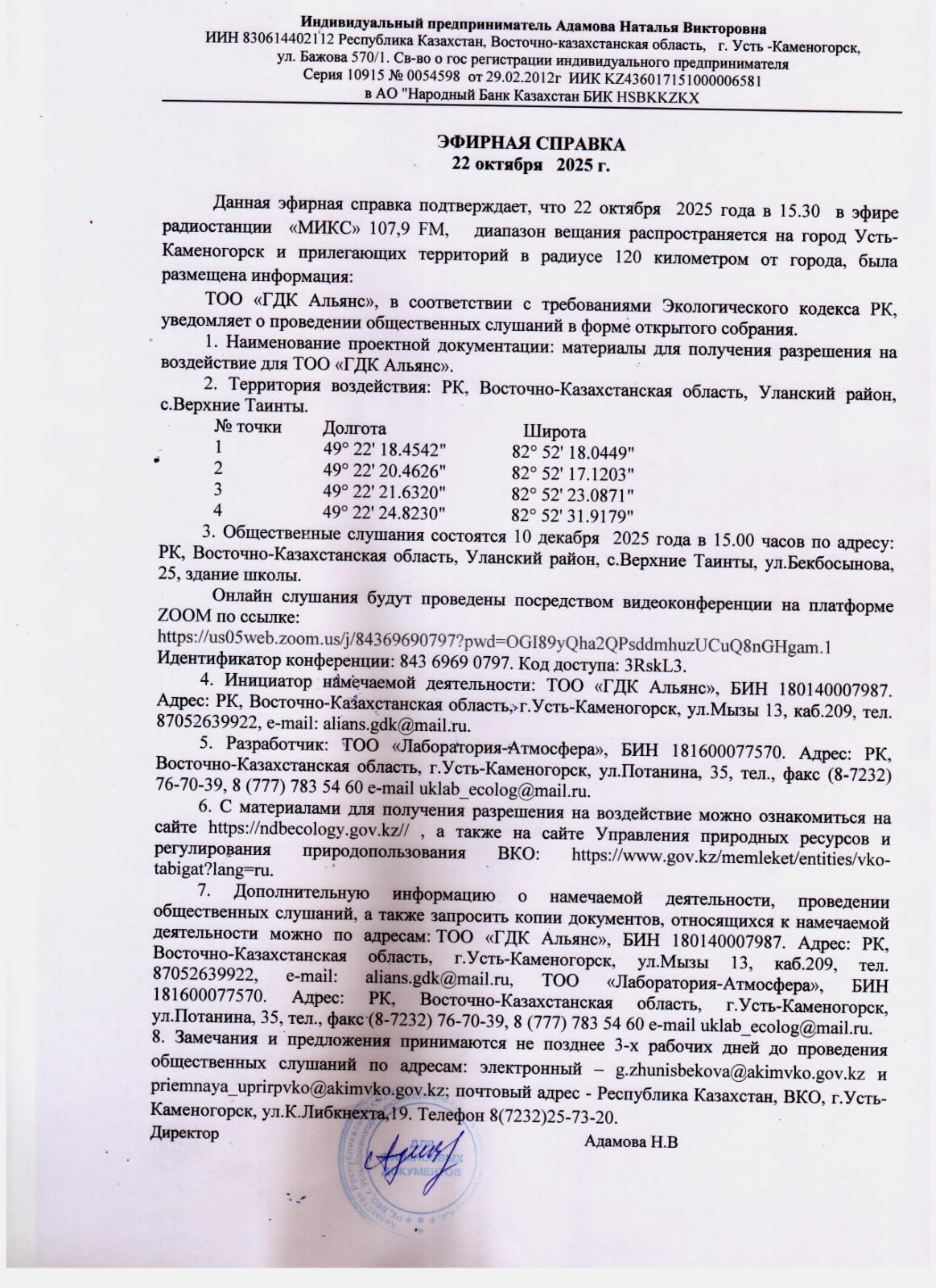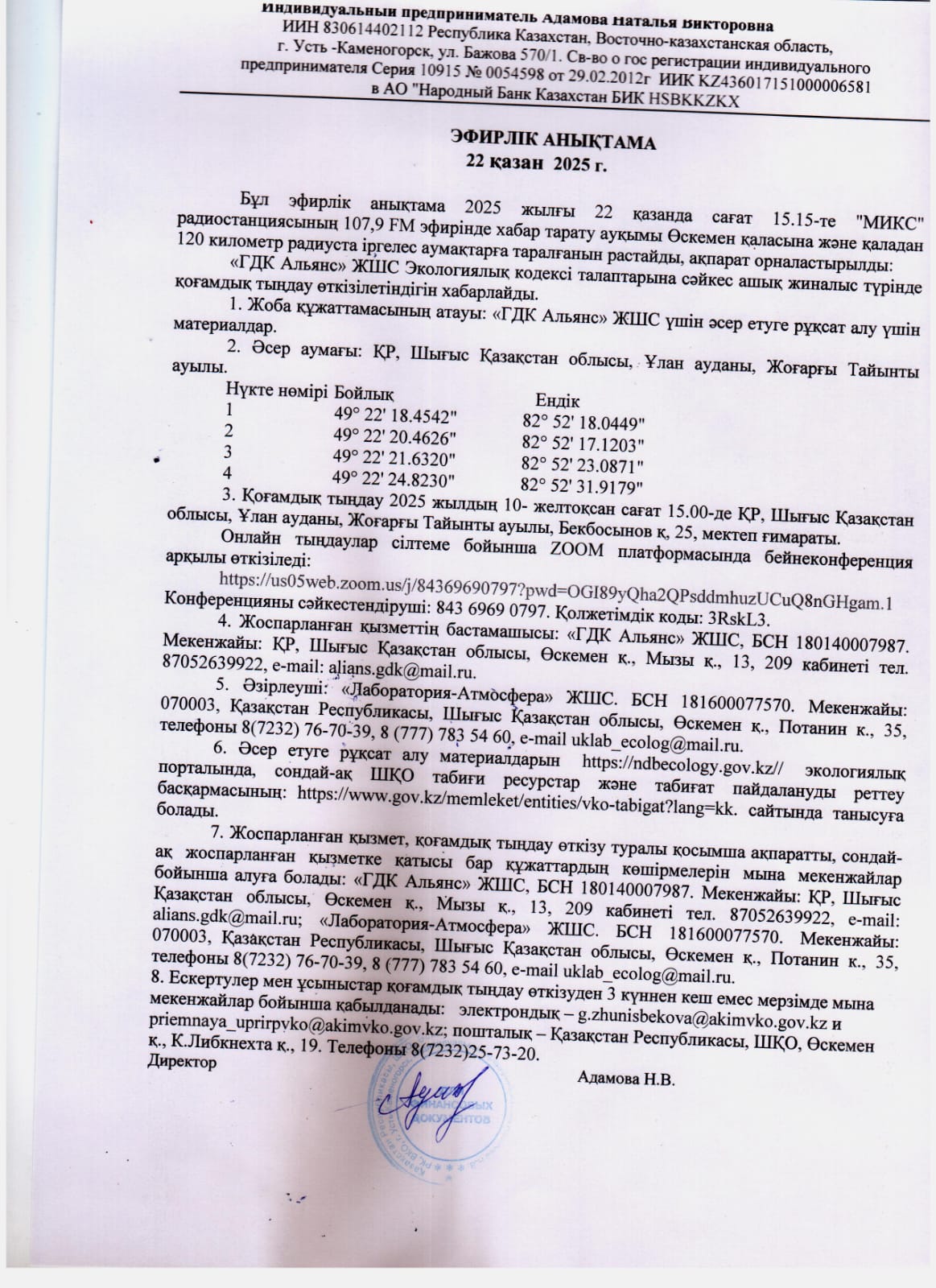 3. Общественные слушания организованны: Управление природных ресурсов и регулирования природопользования Восточно-Казахстанской области, g.zhunisbekova@akimvko.gov.kz,