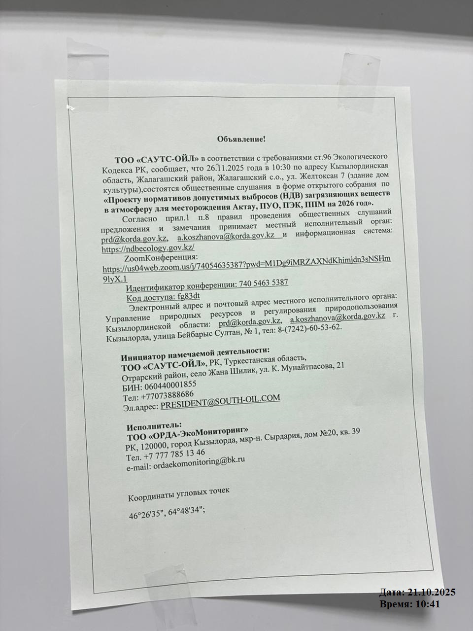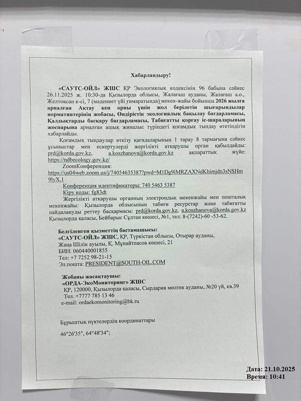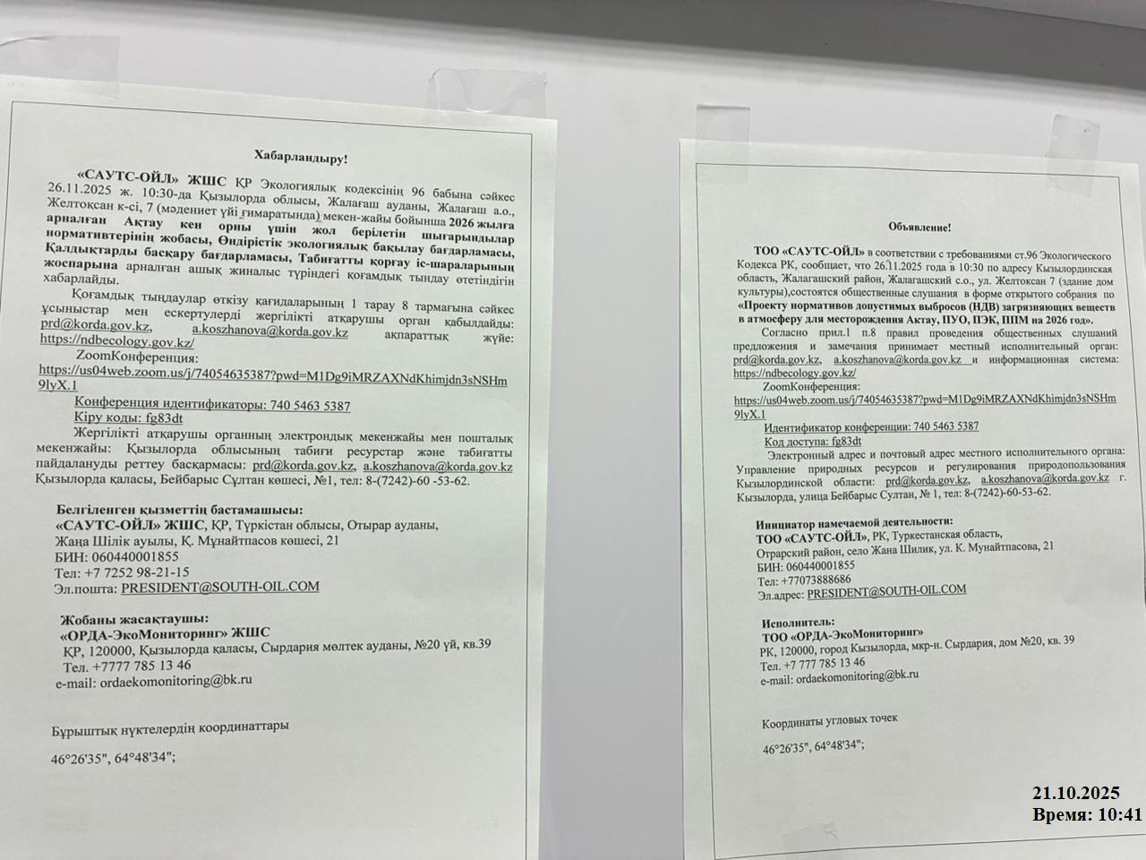 3. Общественные слушания организованны: Управление природных ресурсов и регулирования природопользования Кызылординской области, prd@korda.gov.kz 87242605362, 605369,