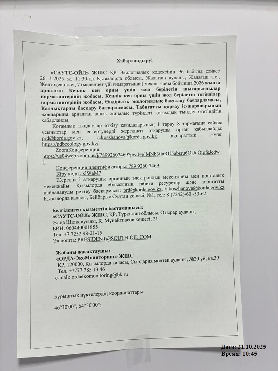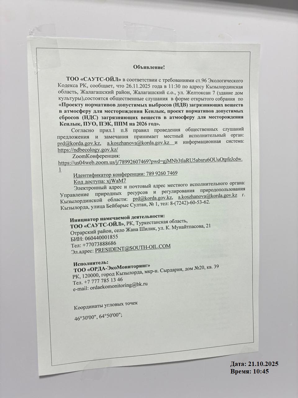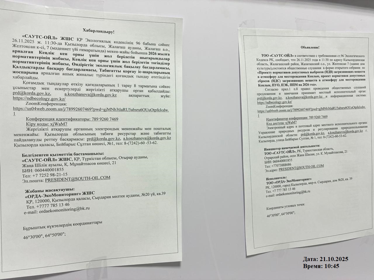3. Общественные слушания организованны: Управление природных ресурсов и регулирования природопользования Кызылординской области, prd@korda.gov.kz 87242605362, 605369,
