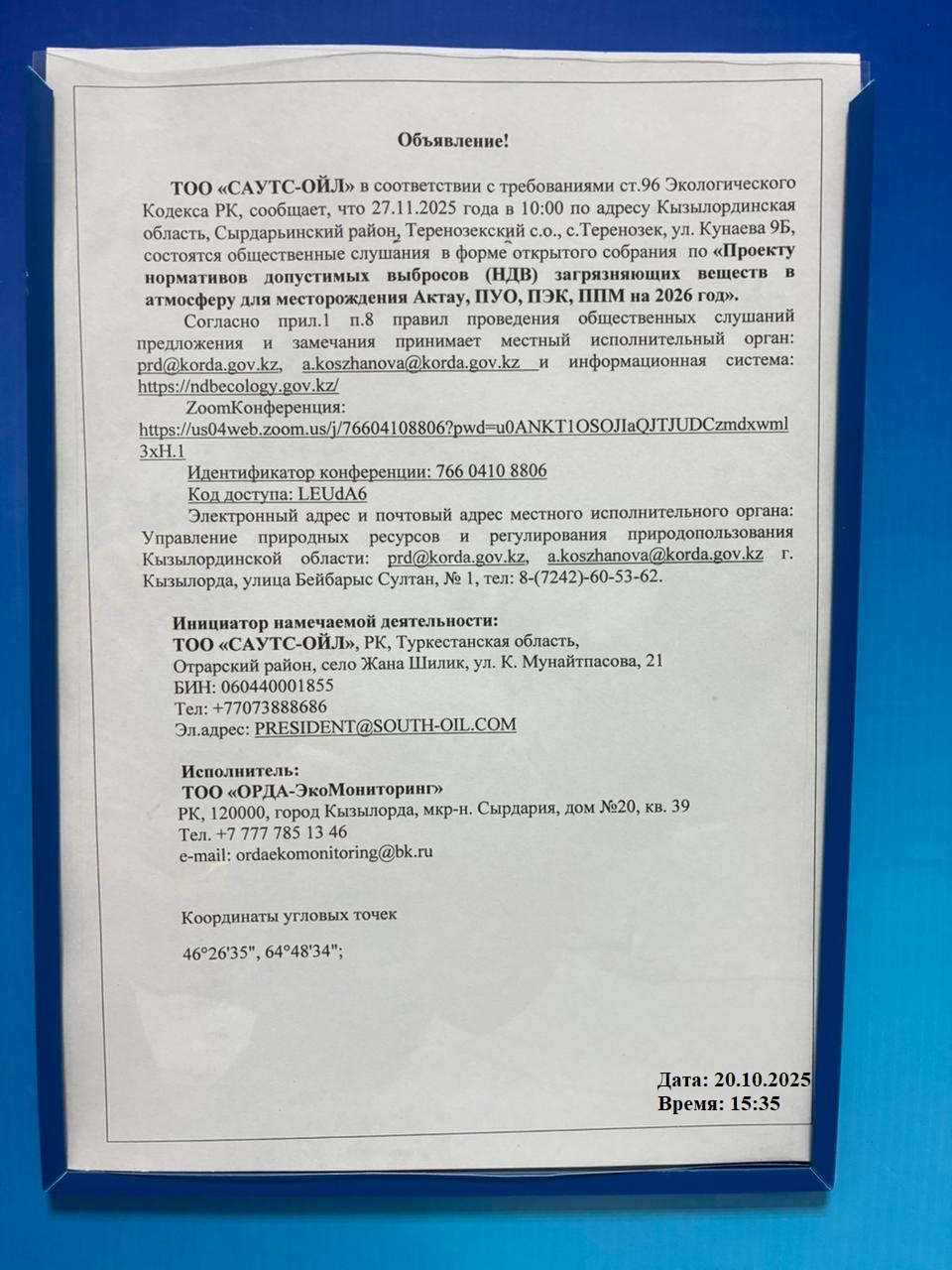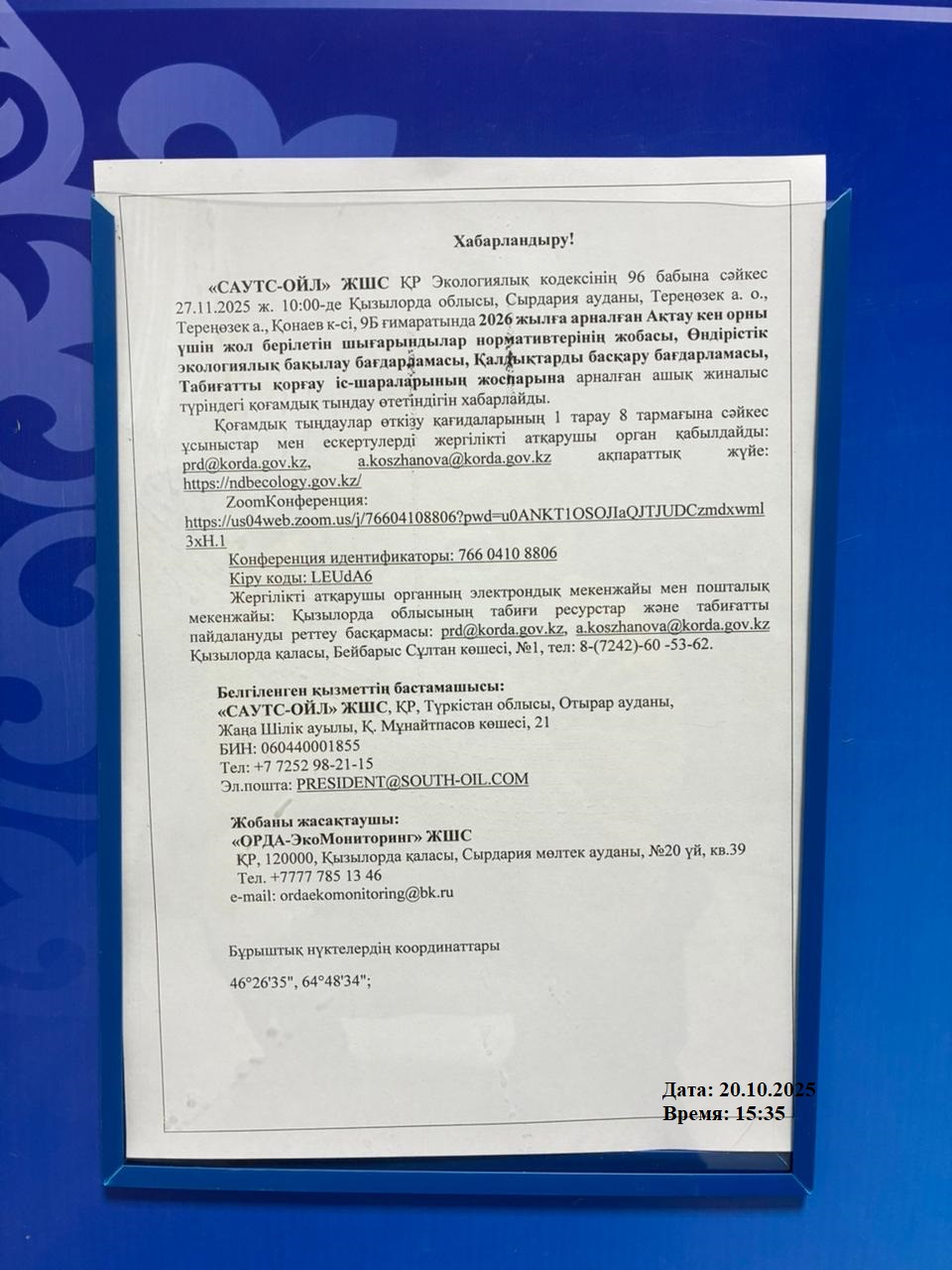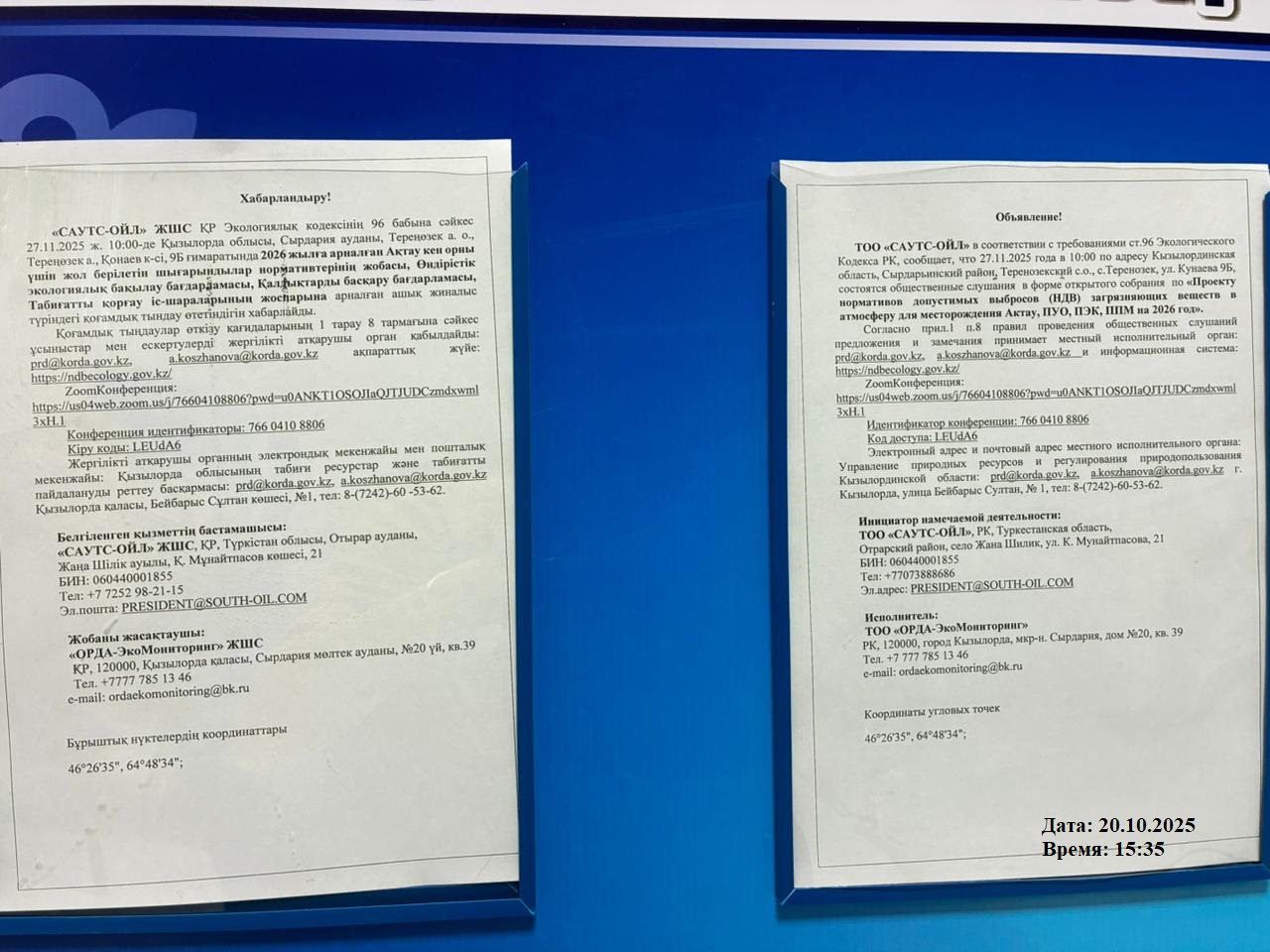 3. Общественные слушания организованны: Управление природных ресурсов и регулирования природопользования Кызылординской области, prd@korda.gov.kz 87242605362, 605369,