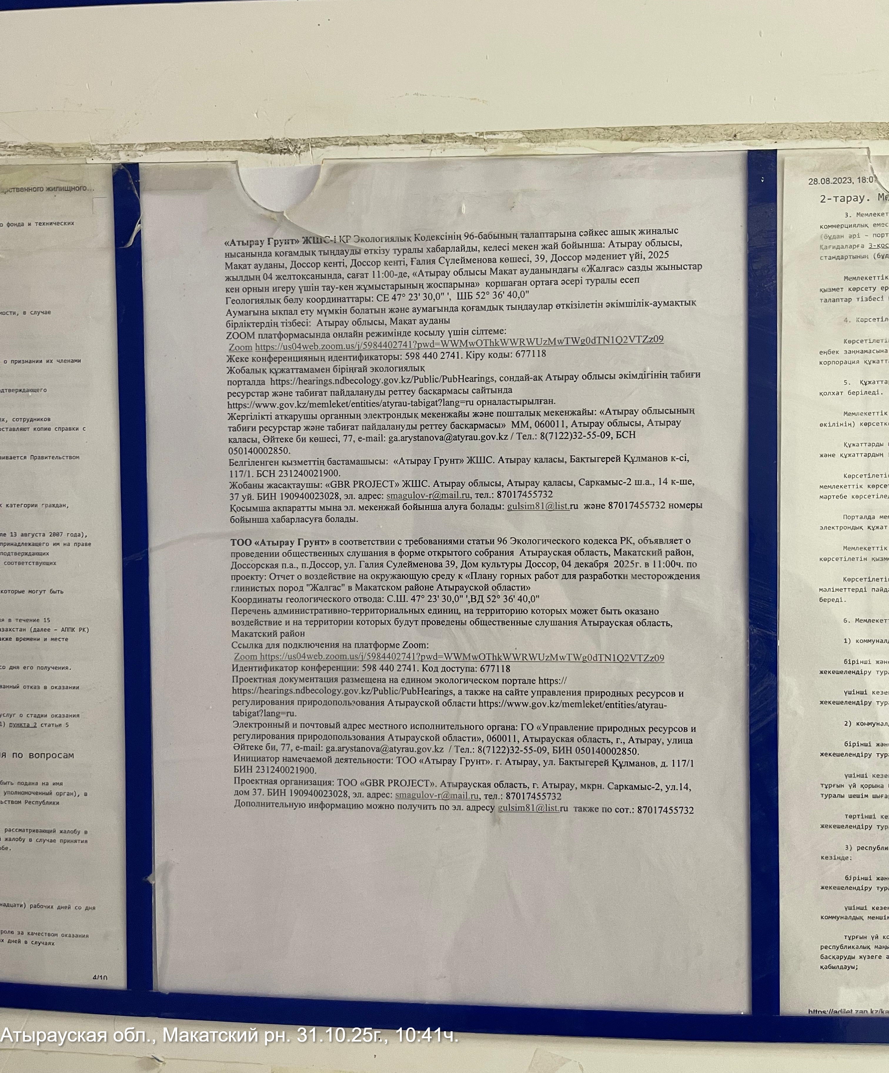3. Общественные слушания организованны: Управление природных ресурсов и регулирования природопользования Атырауской области, atr.priroda@atyrau.gov.kz,