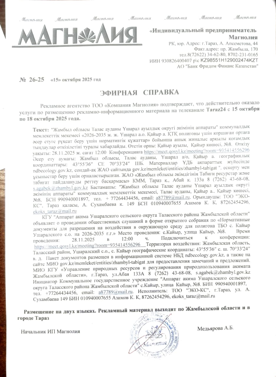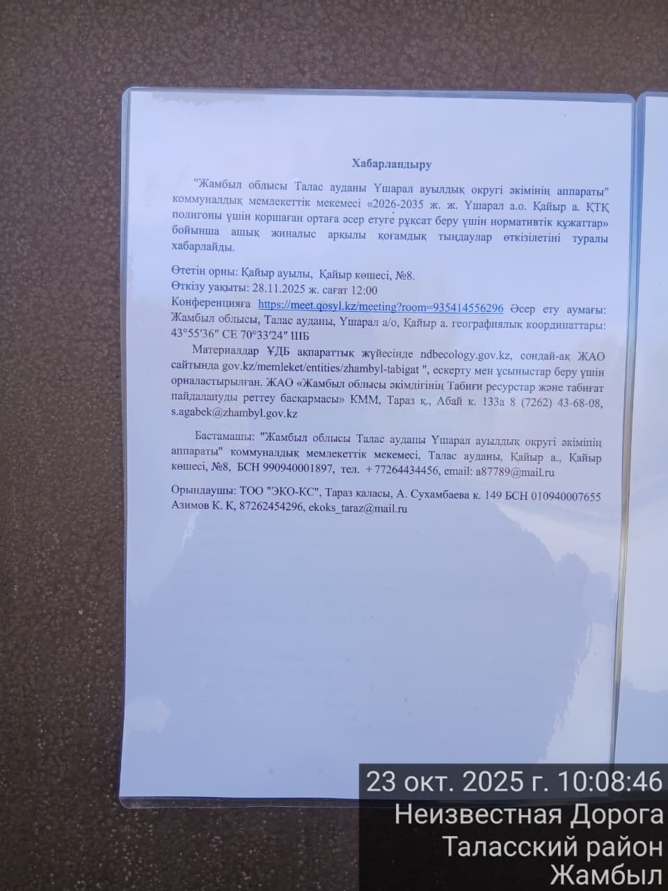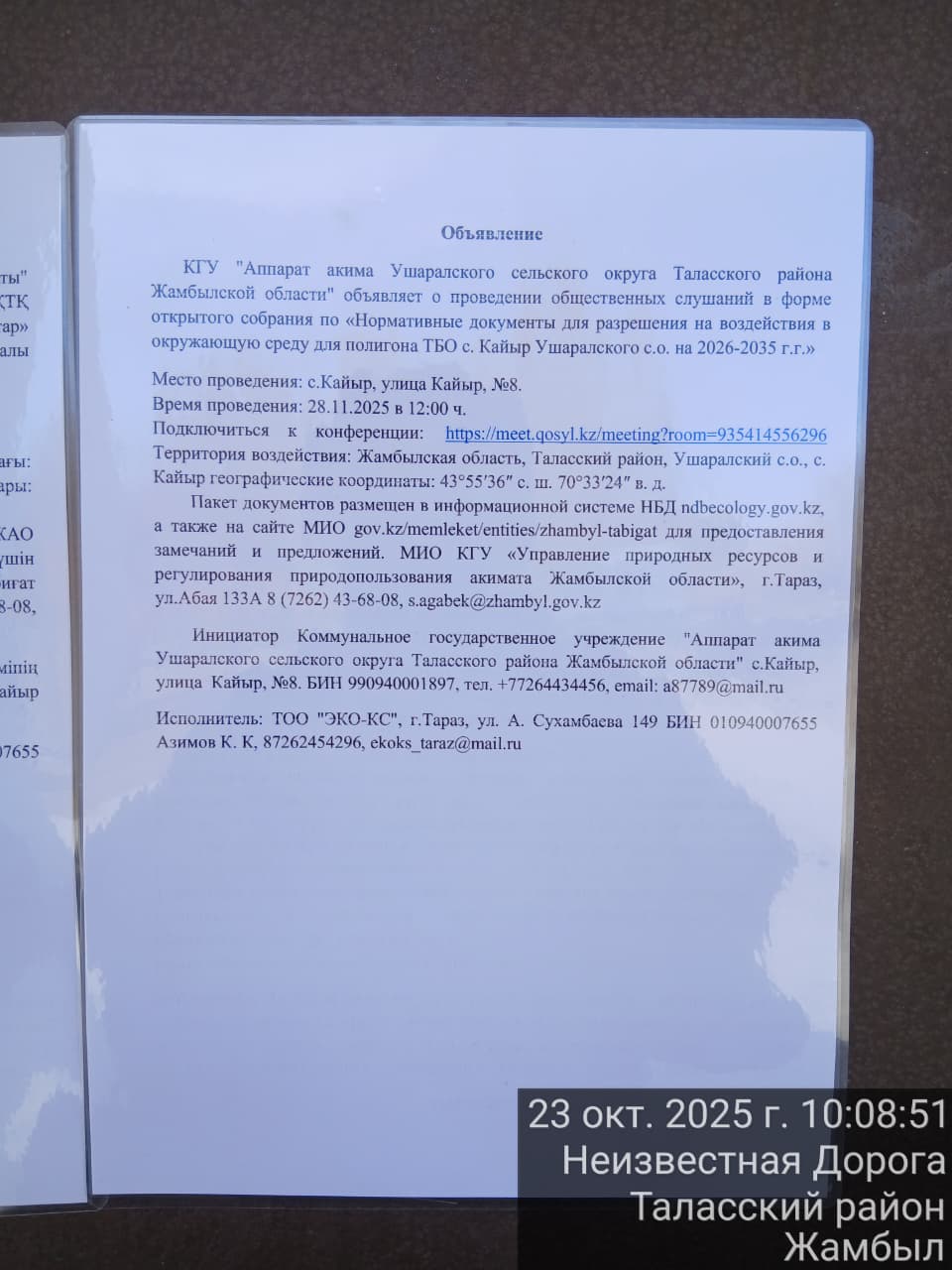 3. Общественные слушания организованны: Управление природных ресурсов и регулирования природопользования Жамбылской области, s.agabek@zhambyl.gov.kz,