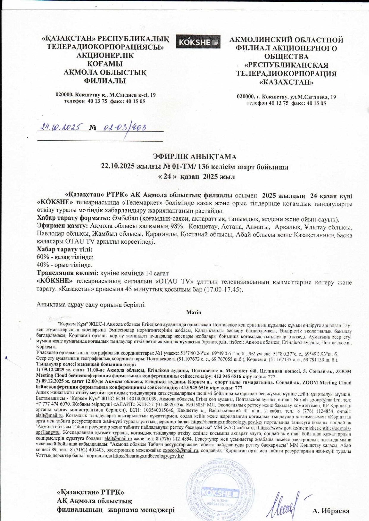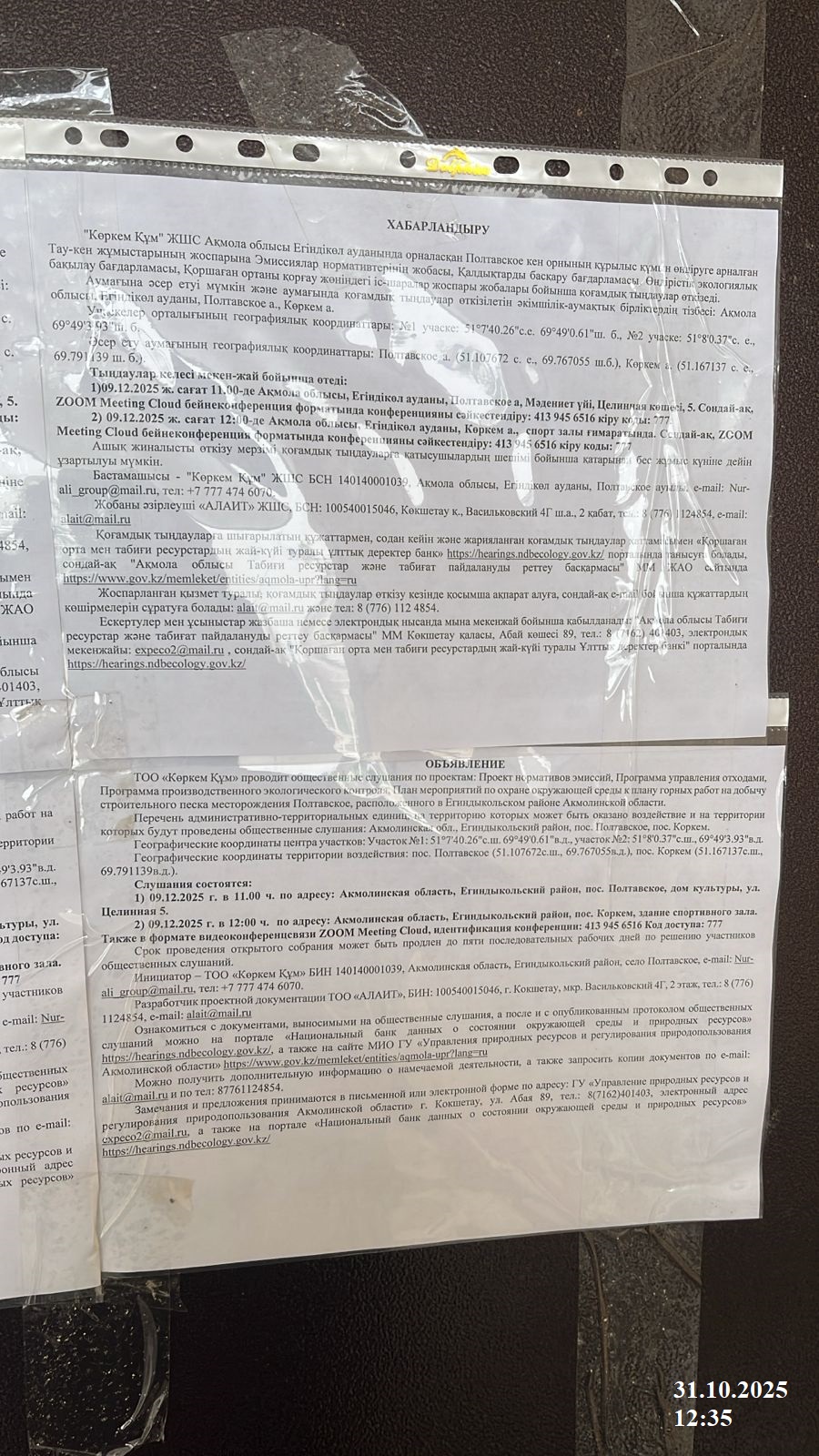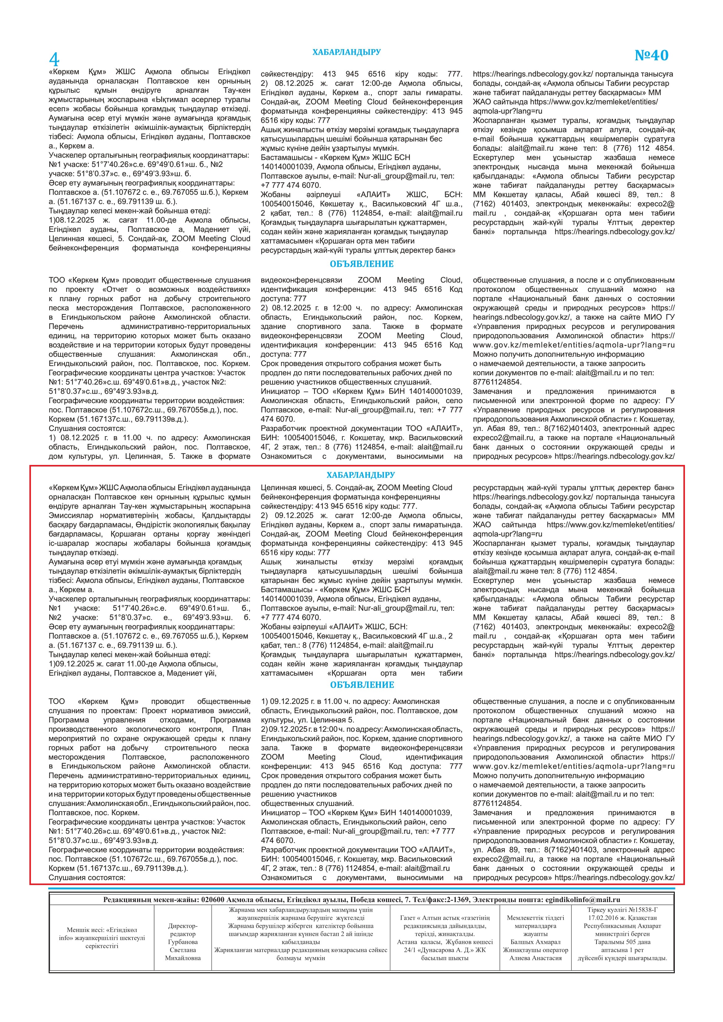 3. Общественные слушания организованны: Управление природных ресурсов и регулирования природопользования Акмолинской области, expeco@mail.ru,