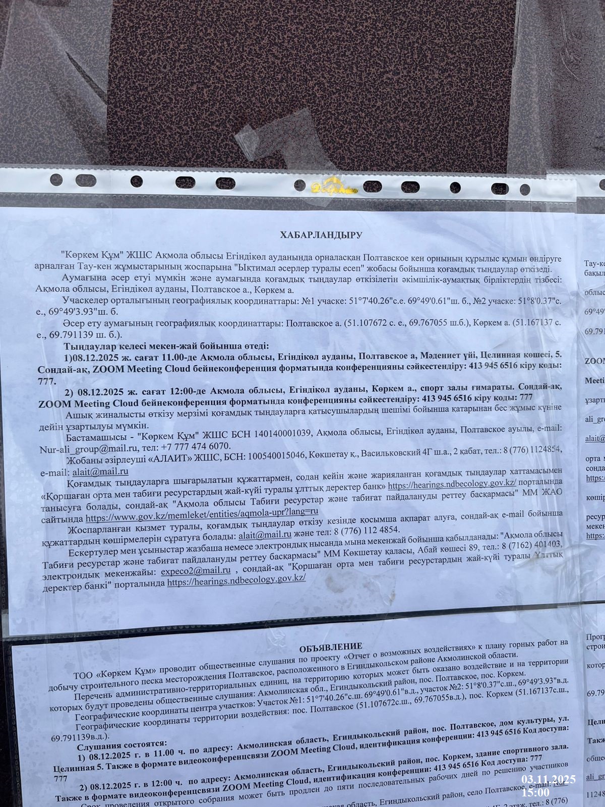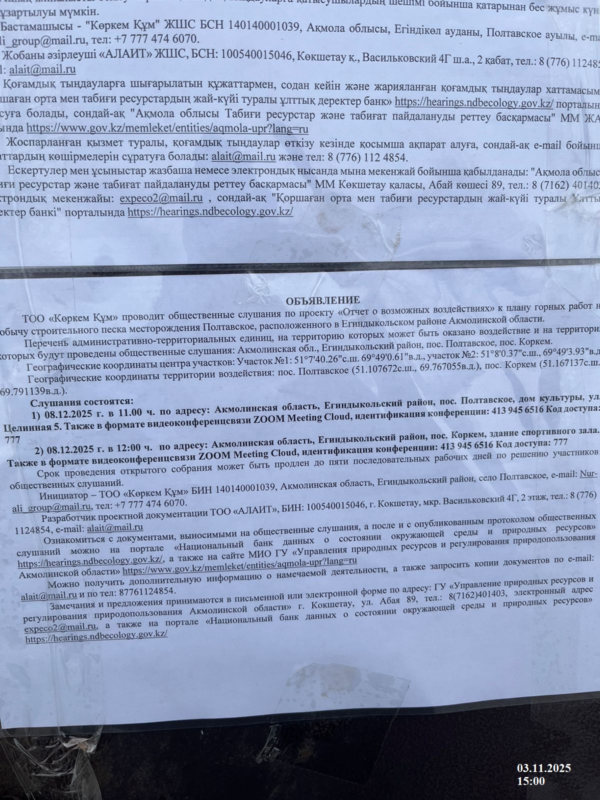 3. Общественные слушания организованны: Управление природных ресурсов и регулирования природопользования Акмолинской области, expeco@mail.ru,