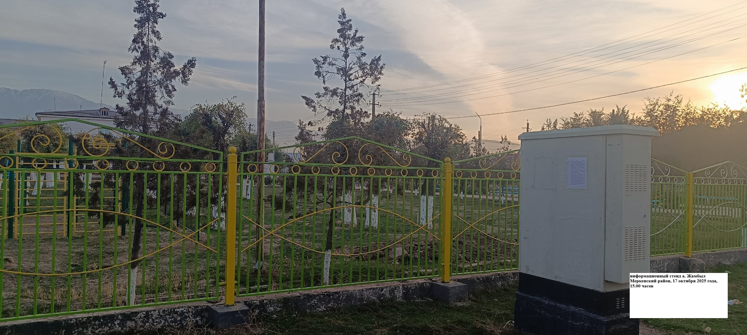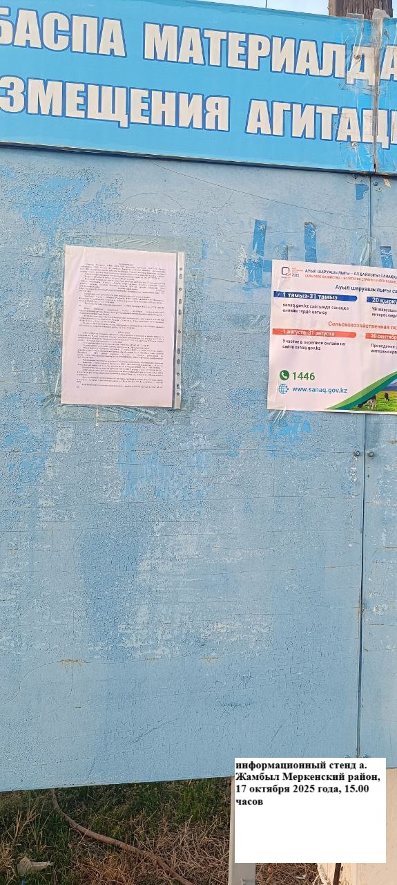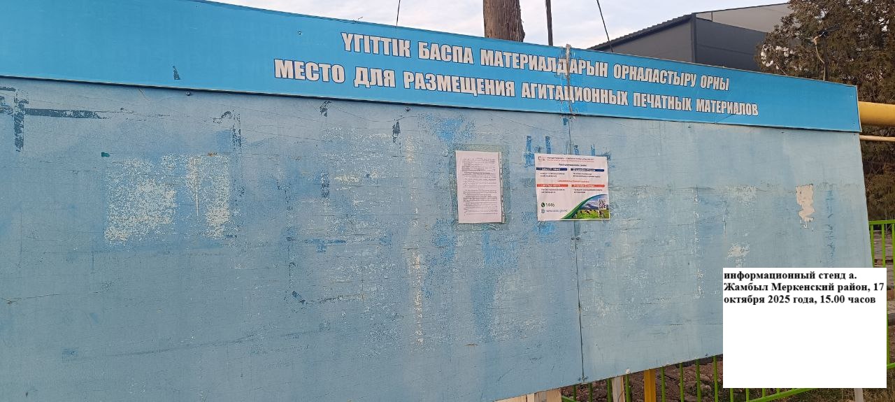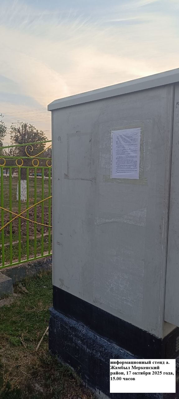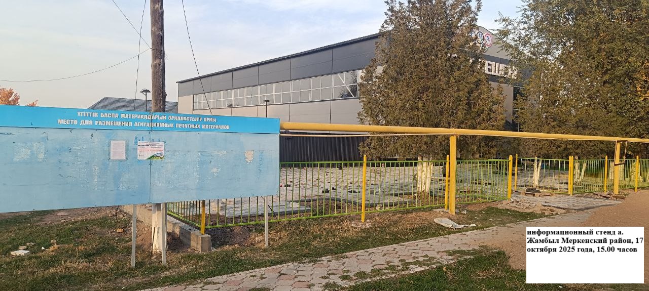 6.3. расположение мест, специально предназначенных для Размещения печатных объявлений (доски объявлений): Жамбылская область, Меркенский район, Жамбылский с.о., с.Жамбыл, Әзімбай Исмайыл көшесі - 119, ауылдық әкімшілік ғимараты, информационные стенды поселка