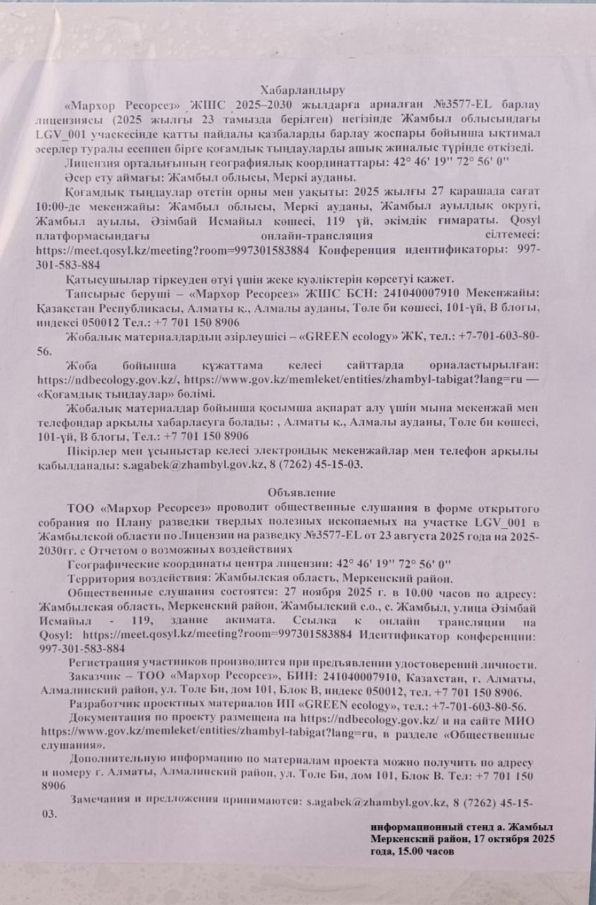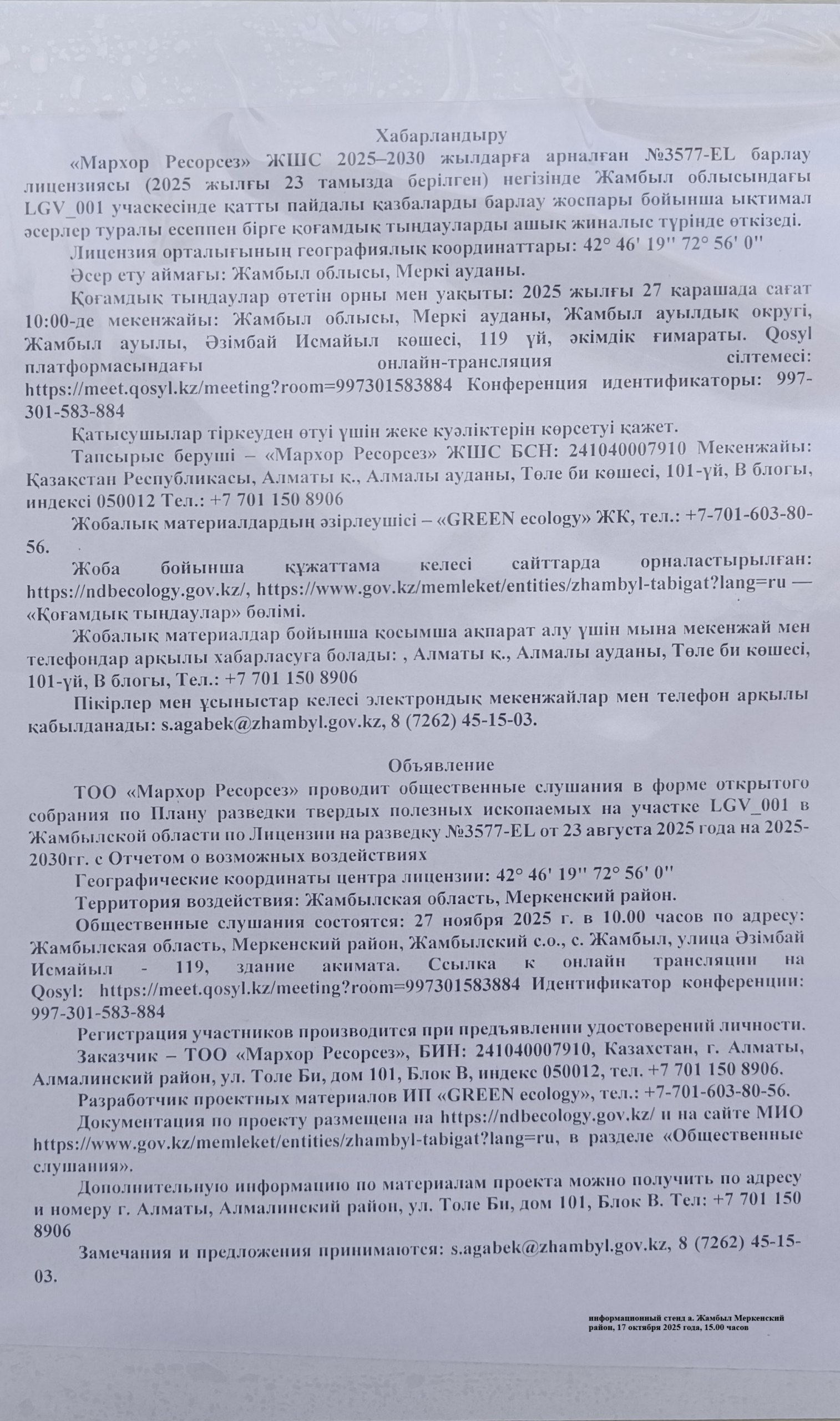 4. Повестка дня общественных слушаний: ТОО «Мархор Ресорсез» предусматривает разведку твердых полезных ископаемых на участке LGV_001 в Жамбылской области по Лицензии на разведку №3577-EL от 23 августа 2025 года Планом разведки на лицензионной площади предусматривается проведение аэрогеофизических методов исследований. Работы по разведке проводятся без бурения и без извлечения горной массы, намечаемая деятельность не окажет негативное воздействие на окружающую среду района расположения лицензии. Участок расположен в Меркенском и Рыскуловском районах Жамбылской области Республики Казахстан. Участок находится в 130 км к востоку от областного центра города Тараз, в 15 км на ЮЗ от районного центра г. Мерке и в 25 км на ЮВ от районного центра села Кулан. Наиболее крупные близлежащие населённые пункты г.Мерке и с.Кулан. Ближайшие населенные пункты: с. Талдыбулак в 1,2 км, с. Кызылсай в 1,5 км, с. Тескетоган в 2,7 км, с. Акканаяр в 2,8 км. Ближайшие зоны отдыха располагаются в 2 км к западу от лицензии. Целью намечаемой деятельности является выявление проявления руд Au, Cu и Ag, современными методами разведки, определение целесообразности дальнейшего изучения территории. Основанием проведения разведки является Лицензия на разведку №3577-EL от 23 августа 2025 года Площадь Лицензионной территории составляет 42 976,014 Га. Геологоразведочные работы планируется провести в течении 3 полевых сезонов с 2025 г. по 2027 г.