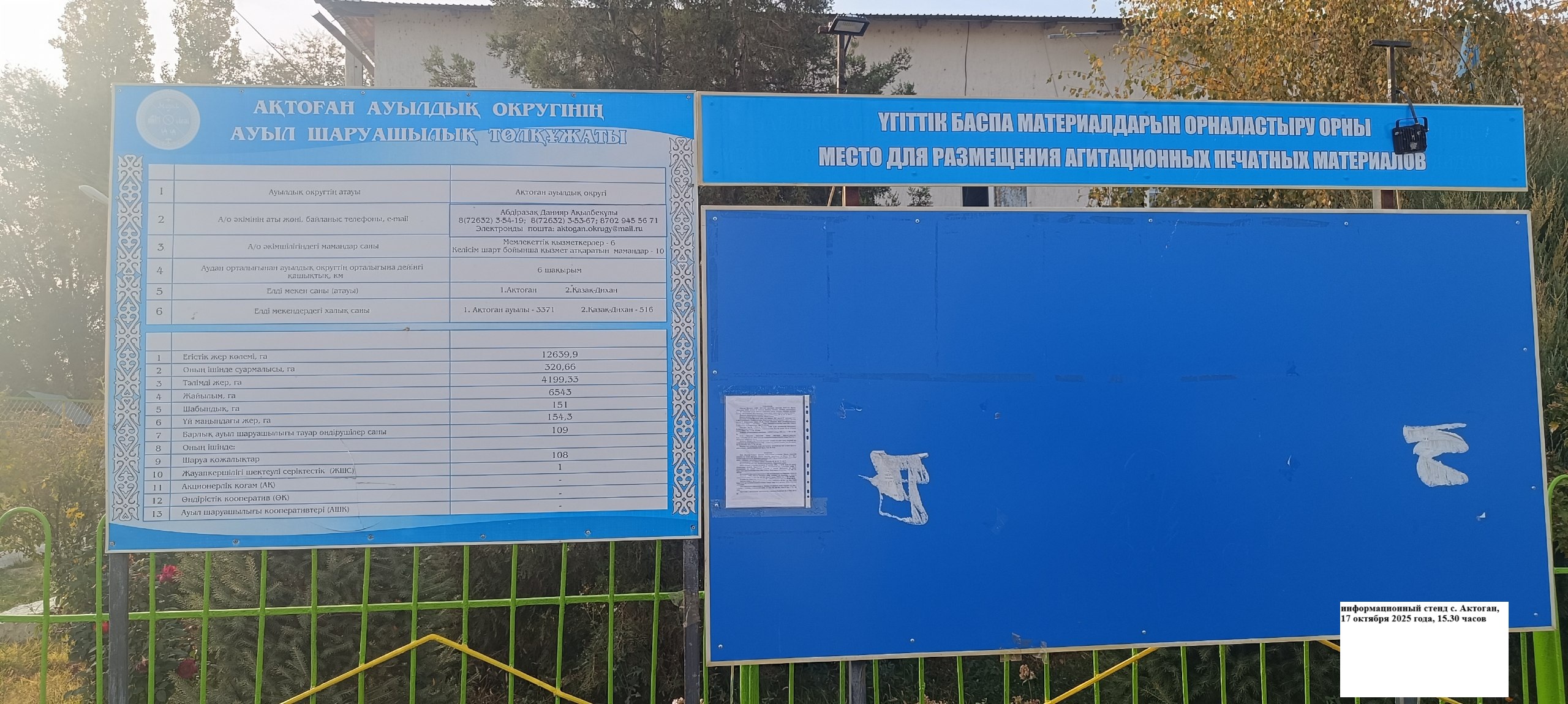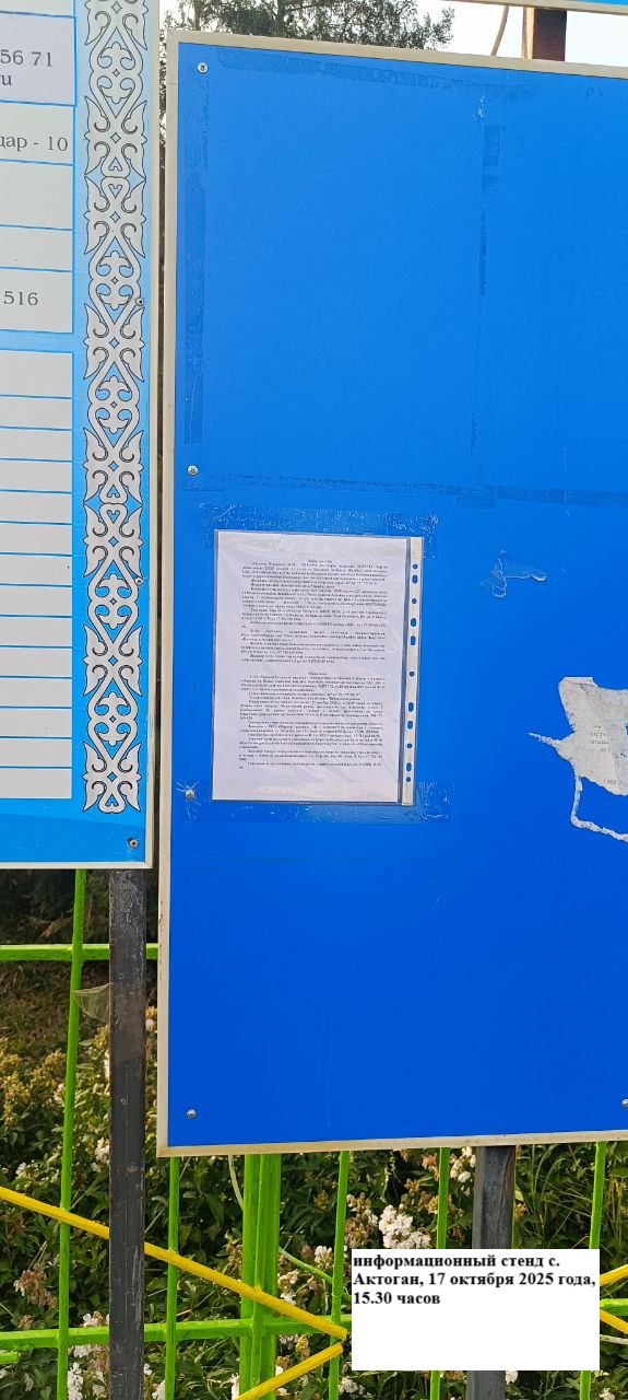 6.3. расположение мест, специально предназначенных для Размещения печатных объявлений (доски объявлений): Жамбылская область, Меркенский район, Актоганский с.о., а.Актоган, Т. Қосбармақов көшесі 26, ауылдық әкімшілік ғимараты, информационные стенды поселка