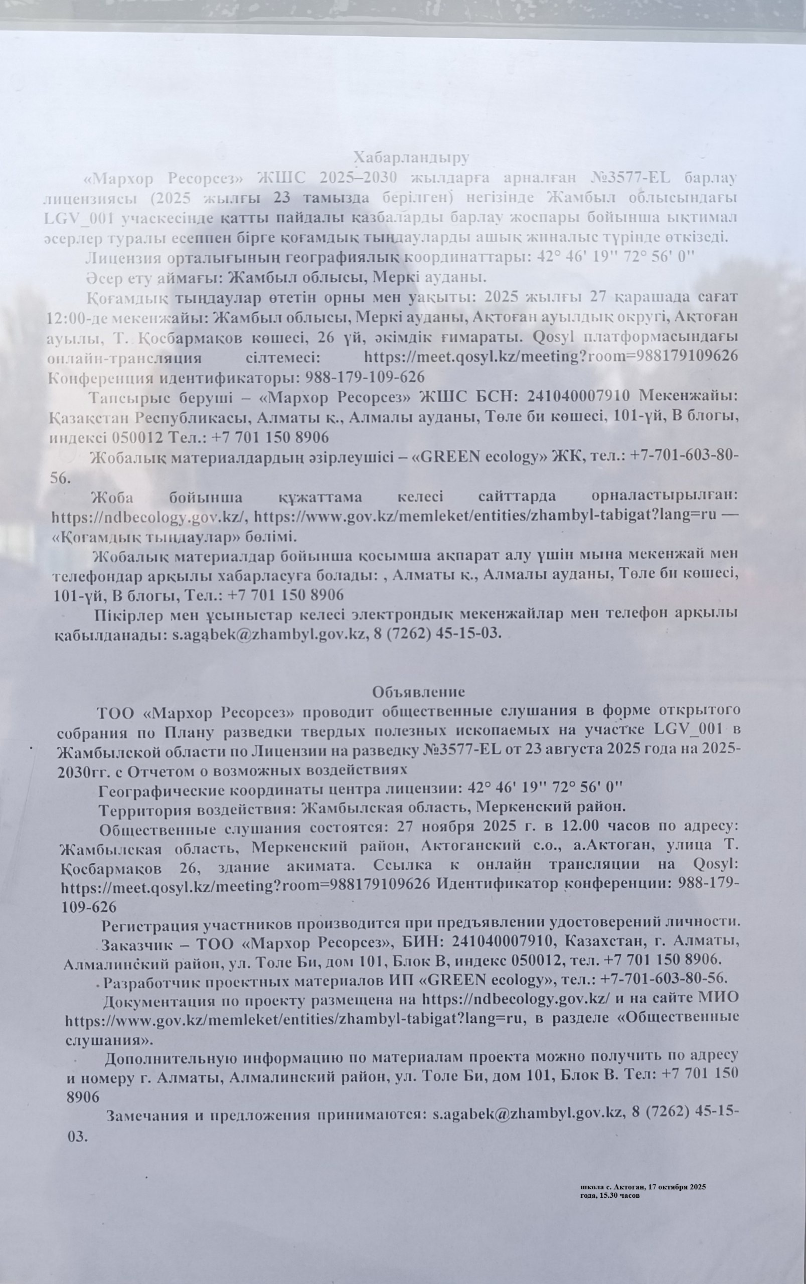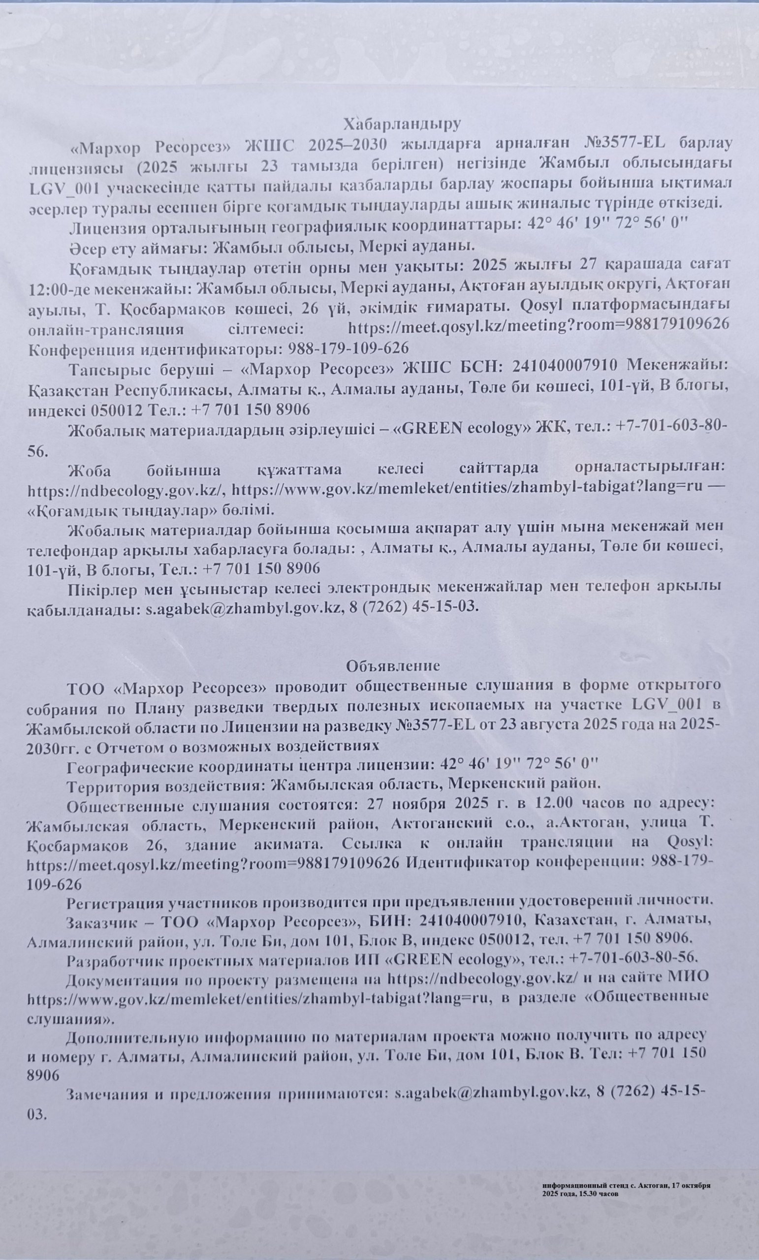 1.4. Описание для подключения к онлайн трансляции при прохождении общественного слушания: Приглашение на запланированную встречу в Qosyl Тема встречи: Товарищество с ограниченной ответственностью ""Мархор Ресорсез"" Время встречи: 27.11.2025 12:00 Длительность встречи: 01 час. Идентификатор встречи: 988-179-109-626 Подключиться к встрече в Qosyl: https://meet.qosyl.kz/meeting?room=988179109626