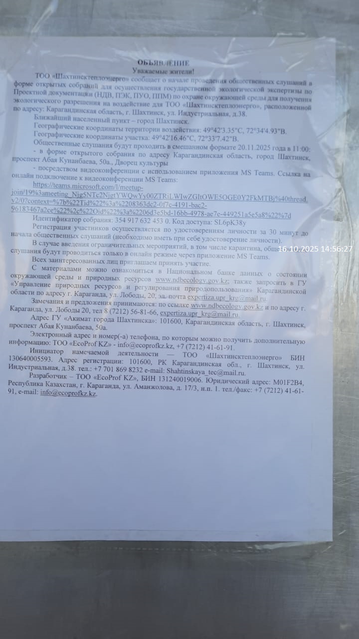 4. Повестка дня общественных слушаний: ТОО «Шахтинсктеплоэнерго» расположено на северозападной окраине г. Шахтинска Основным назначением ТОО «Шахтинсктеплоэнерго» является: - производство, передача, распределение и снабжение тепловой энергии; - производство электроэнергии, реализация электрической энергии с шин. Установленная тепловая мощность ТЭС на имеющийся состав оборудования составляет 141,6 Гкал/час, располагаемая тепловая мощность для нужд внешнего потребителя 113,9 Гкал/ч. Установленная электрическая мощность составляет 18 МВт, располагаемая электрическая мощность – 12 МВт. Тепловая энергия поставляется для покрытия тепловых нагрузок, обусловленных коммунально-бытовыми и социальными нуждами г. Шахтинска. Вырабатываемая электроэнергия идет на удовлетворение, как собственных нужд и нужд потребителей. ТОО «Шахтинсктеплоэнерго» в настоящее время является единственным централизованным источником теплоснабжения жилого фонда г. Шахтинска и его промышленных предприятий. В районе размещения предприятия отсутствуют заповедники, памятники архитектуры, санитарно-профилактические учреждения, зоны отдыха и другие природоохранные объекты. Расстояние от территории предприятия до ближайшей жилой застройки, представленной одноэтажным частным сектором, составляет 1470метров, 1320метров, 1195метров. Расстояние от границы санитарно-защитной зоны (500м) до ближайшей жилой зоны составляет 970м, 820м, 695м. Географические координаты территории воздействия: 49°42'3.35"С, 72°34'4.93"В. Географические координаты участка: 49°42'16.46"С, 72°33'7.42"В. Общественные слушания будут проходить в смешанном формате 20.11.2025 года в 11:00: - в форме открытого собрания по адресу Карагандинская область, город Шахтинск, проспект Абая Кунанбаева, 50а., Дворец культуры - посредством видеоконференции с использованием приложения MS Teams. Ссылка на онлайн подключение к видеоконференции MS Teams: https://teams.microsoft.com/l/meetupjoin/19%3ameeting_NjE4YTU0NTMtMTQ1NC00MDQxLTg3YjYtZTZkODJjOTgzODMz%40thread.v2/0?context=%7b%22Tid%22%3a%2208363dc2-0f7c-4191-bac2-96183467a2ce%22%2c%22Oid%22%3a%2206d3e5bd-16bb-4978-ae7e-449251a5e5a8%22%7d Идентификатор собрания: 447 273 642 856 8. Код доступа: 5tC3ZU3K На территории промплощадки ТОО «Шахтинсктеплоэнерго» находятся следующие здания и сооружения: - проходная; - административно-бытовой комплекс (АБК); - главный производственный корпус, включающий в себя котельный и турбинный цеха; - релейный щит; - здание багерной насосной; - склады сыпучих материалов (в настоящее время не эксплуатируются); - склад оборудования; - склад соли (в настоящее время не эксплуатируется); - химводоочистка (ХВО); - противопожарные резервные емкости воды и насосная; - бульдозерный бокс; - насосная осветленной воды; - здание топливоподачи; - здание мастерской по ремонту ртутных приборов; - мазутохозяйство с подземными резервуарами; - мазутонасосная №2 (в настоящее время не эксплуатируется); - здание ЦКЭР; - временный бытовой корпус персонала; - столовая; - здание пиковой котельной; - здание насосной промстоков; - пеногенераторная; - здание вакуумно-деаэраторной установки с двумя баками-аккумуляторами; - транзитная подстанция; - гаражи АТЦ; - гаражи технологического транспорта (ГТЦ); - коллекторная; - механическая мастерская; - столярная мастерская; - склад угля открытого типа; - брызгальный бассейн; - золонакопитель. Из всех вышеперечисленных объектов, в качестве источников выбросов загрязняющих веществ в