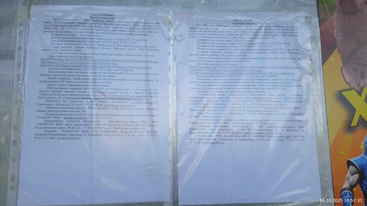 5.4. Дополнительная информация о административно-территориальных единиц: Общественные слушания будут проходить в смешанном формате 20.11.2025 года в 11:00: - в форме открытого собрания по адресу Карагандинская область, город Шахтинск, проспект Абая Кунанбаева, 50а., Дворец культуры - посредством видеоконференции с использованием приложения MS Teams. Ссылка на онлайн подключение к видеоконференции MS Teams: https://teams.microsoft.com/l/meetupjoin/19%3ameeting_NjE4YTU0NTMtMTQ1NC00MDQxLTg3YjYtZTZkODJjOTgzODMz%40thread.v2/0?context=%7b%22Tid%22%3a%2208363dc2-0f7c-4191-bac2-96183467a2ce%22%2c%22Oid%22%3a%2206d3e5bd-16bb-4978-ae7e-449251a5e5a8%22%7d Идентификатор собрания: 447 273 642 856 8. Код доступа: 5tC3ZU3K