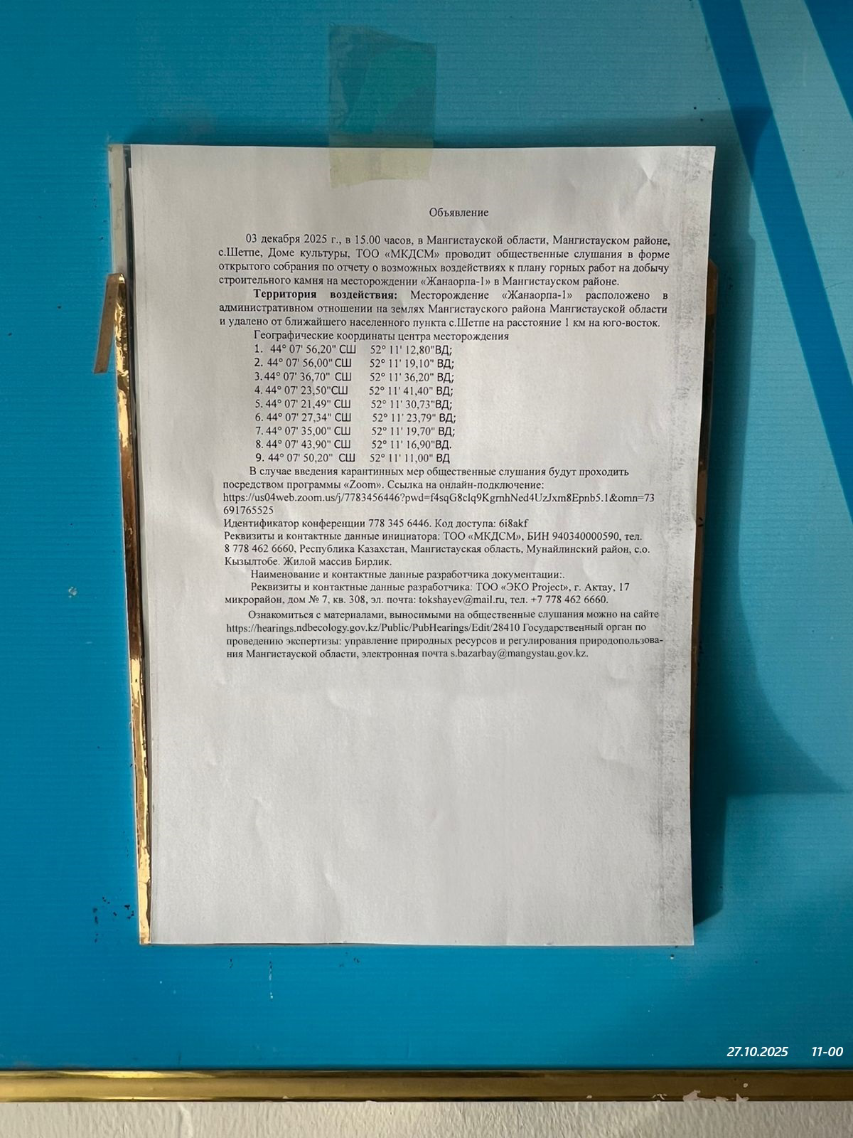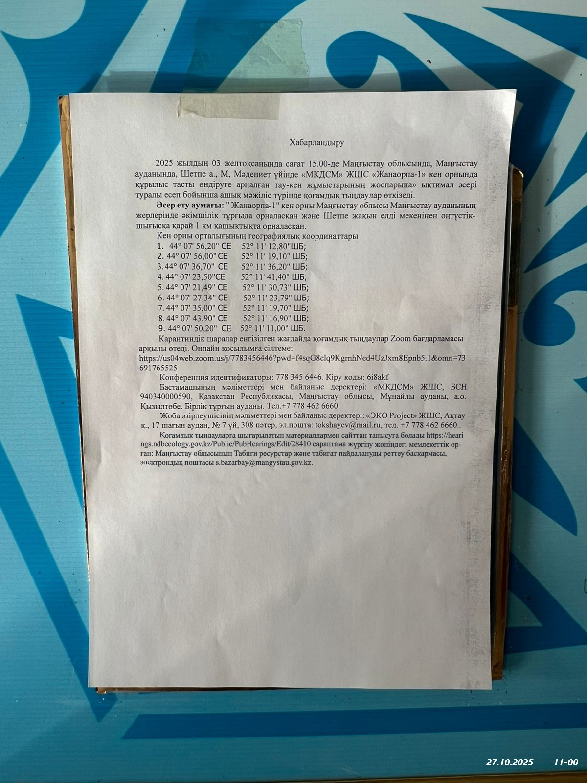 3. Общественные слушания организованны: Управление природных ресурсов и регулирования природопользования Мангистауской области, s.bazarbay@mangystau.gov.kz,