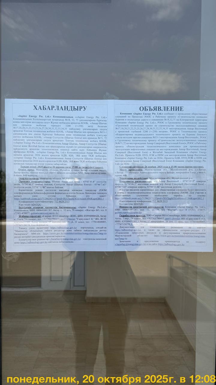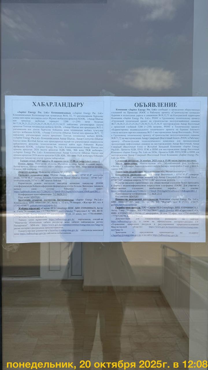 4. Повестка дня общественных слушаний: Время: 26 ноября 2025 15:00 PM Asia/Aqtau Войти Zoom Конференция https://us04web.zoom.us/j/71286282113?pwd=fXS2lpg8ZX1slAxiexCObiKtqmGBl2.1 Идентификатор конференции: 712 8628 2113 Код доступа: hD4TQG Месторождения Аккар Восточный и Аккар Северный (Восточный блок) входят в контрактную территорию Компании «Jupiter Energy Pte. Ltd» и в административно-территориальном отношении находится в Мунайлинском районе Мангистауской области Республики Казахстан. 1.РООС к Рабочему проекту «Строительство площадки бурения и подъездные дороги к скважинам №18,32,71 на Контрактной территории Компании «Jupiter Energy Pte. Ltd.», 2.РООС к Групповому техническому проекту «Групповой технический проект на строительство эксплуатационных скважин №17,18,20,21,22,23,25,26,27,28,30,31,32,33,34,35 месторождения Аккар Восточный с проектной глубиной 3200 (+-250) метров», 3.РООС к Техническому проекту «Корректировка индивидуального технического проекта на бурение бокового ствола методом зарезки скважины №53-1 месторождения Аккар Восточный», 4.РООС к Групповому техническому проекту «Строительство эксплуатационных скважин №№71,72 на месторождении Аккар Северный (Восточный блок)», 5.РООС к Рабочему проекту «Реконструкция технологического комплекса для промышленной эксплуатации нефтегазовых скважин на месторождениях Аккар Восточный, Аккар Северный (Восточный блок) и Жетыбай Западный Компании «Jupiter Energy Pte.Ltd», 6.Проекты НДВ, ПУО, ПЭК и ППМ для месторождения Аккар Восточный Компании «Jupiter Energy Pte. Ltd» на 2026г, 7.Проекты НДВ, ПУО, ПЭК и ППМ для месторождения Аккар Северный (Восточный блок) Компании «Jupiter Energy Pte. Ltd» на 2026г.