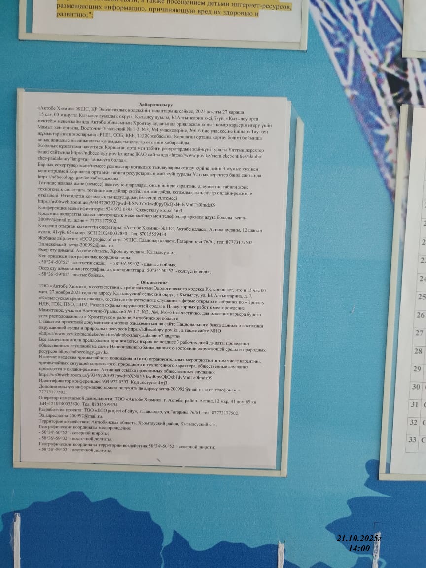 3. Общественные слушания организованны: Управление природных ресурсов и регулирования природопользования Актюбинской области, expert_oos@mail.ru,