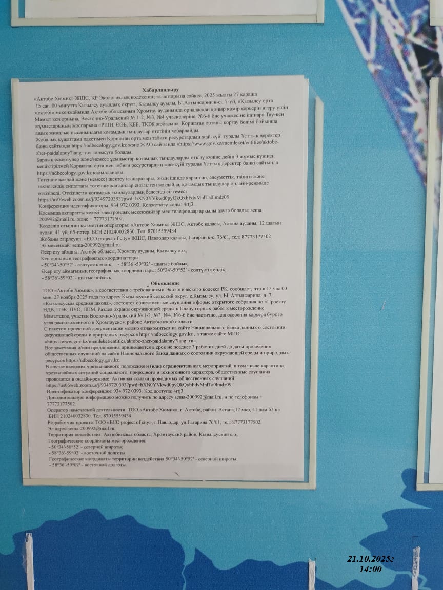 4. Повестка дня общественных слушаний: Раздел охраны окружающей среды выполнен к Плану горных работ ТОО «АКТОБЕ ХЮМИК».Месторождение Мамытское (Мамыт) располагается в Хромтауском районе Актюбинской области.Целью данного Плана горных работ является определение способа добычи бурого угля и разработки месторождения Мамытское.Месторождение бурого угля (лигнит) Мамытское расположено в Актюбинской области, Хромтауском Республики Казахстан.Месторождение расположено в 120 км к западу от города Актобе, в 34 км к востоку от железнодорожной станции Кемписай железнодорожной линии Кандагач-Орск и в 38 км к северо-северо-востоку от города Хромтау. Близлежащие села связаны с Хромтау автомобильными дорогами. В 5 км южнее угольного разреза проходит ЛЭП 110 кВ и железная дорога Кемписай-Хромтау. Ближайший населеный пункт с.Кызылсу, на расстоянии 18км. Восточно-Уральское буроугольное месторождение, ныне месторождение Мамытское, являющееся основным месторождением Орского бассейна, располагается на площади, ограниченной на юге р. Кызыл-Каин и на севере р. Шандаша. Географические координаты месторождения: - 50°34ʹ-50°52ʹ - северной широты; - 58°36ʹ-59°02ʹ - восточной долготы. Площадь горного отвода составляет 21,63 (двадцать одна целая шестьдесят три сотых) км2, абсолютные отметки поверхности 255-270 м. Глубина горного отвода – 105,9 м (до горизонта +150 м). На территории участка горного отвода месторождения Мамытское отсутствует промысловая инфраструктура или оборудование. Добыча на участке горного отвода месторождения Мамытское велась предыдущим (-ими) недропользователем (-ями) открытым карьерным методом из единственного открытого карьера, расположенного в южной части участка горного отвода месторождения бурого угля Мамытское. Источниками загрязнения атомсферного воздуха будут являтся : Снятие вскрыши,Погрузка вскрышных пород в автотранспорт,, Формирование склада вскрышных пород,Добычные работы,Пересыпка угля. Общий объем выбросов составляет 27,2184 тонн в год. В случае введения чрезвычайного положения и (или) ограничительных мероприятий, в том числе карантина, чрезвычайных ситуаций социального, природного и техногенного характера, общественные слушания проводятся в онлайн-режиме. Активная ссылка проводимых общественных слушаний https://us06web.zoom.us/j/9349720393?pwd=bXN0YVkwd0pyQkQxbFdvMnlTa0lmdz09 Идентификатор конференции: 934 972 0393 Код доступа: 4rtj3T