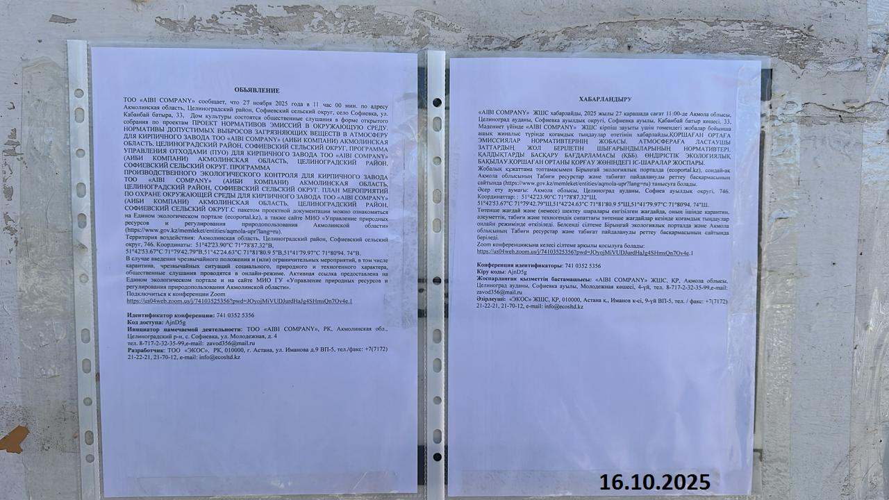 4. Повестка дня общественных слушаний: Кирпичный завод ТОО «AIBI Company» (Аиби Компани) – действующее предприятие, основной деятельностью которого является производство и реализация кирпича следующих видов: одинарный полнотелый, пустотелый полуторный, полнотелый полуторный. Кирпичный завод расположен на одной производственной площадке, которая расположена в границах Софиевского с/о, Целиноградского райна, Акмолинской области. Ближайшие населенные пункты – села Софиевка и Миновка, расположены юго-западнее от территории размещения кирпичного завода на расстоянии более 5 км (с. Софиевка) и юго-восточнее от территории размещения кирпичного завода на расстоянии более 4 км (с. Миновка). В зоне влияния объектов кирпичного завода ТОО «AIBI Company» (Аиби Компани) курортов, зон отдыха и объектов с повышенными требованиями к санитарному состоянию атмосферного воздуха не имеется. Постов наблюдений за загрязнением атмосферного воздуха на территории предприятия нет. Возможность выбора других мест, в данном случае является безальтернативным. Производительность завода с 2017 года была 80000 шт. кирпича в сутки, в год – 12000000 шт, на 2023-2033 года планируется выпуск 194445 шт в сутки (или 670,9 тонн в сутки) и 35 млн. шт. в год. Кирпичный завод расположен на одной производственной площадке, которая расположена в границах Софиевского с/о, Целиноградского райна, Акмолинской области. Ближайшие населенные пункты – села Софиевка и Миновка, расположены юго-западнее от территории размещения кирпичного завода на расстоянии более 5 км (с. Софиевка) и юго-восточнее от территории размещения кирпичного завода на расстоянии более 4 км (с. Миновка). Площадь земельного участка, отведенного для завода по производству кирпича составляет 2,5 га (Акт прилагается) Кирпичное производство представлено тремя заводами со следующими участками: склады сырья, подготовительно-формовочное отделение и сушильно-обжиговое отделение (два завода с кольцевой печью, другой с туннельной). Производительность кирпичного завода –– 35000000 шт. кирпича в год (по 11600000 шт./год на каждый завод). Режим работы завода сезонный – с апреля по октябрь месяц (180 дней) при 8 часовом рабочем дне. В зоне влияния объектов кирпичного завода ТОО «AIBI Company» (Аиби Компани) курортов, зон отдыха и объектов с повышенными требованиями к санитарному состоянию атмосферного воздуха не имеется. Постов наблюдений за загрязнением атмосферного воздуха на территории предприятия нет.