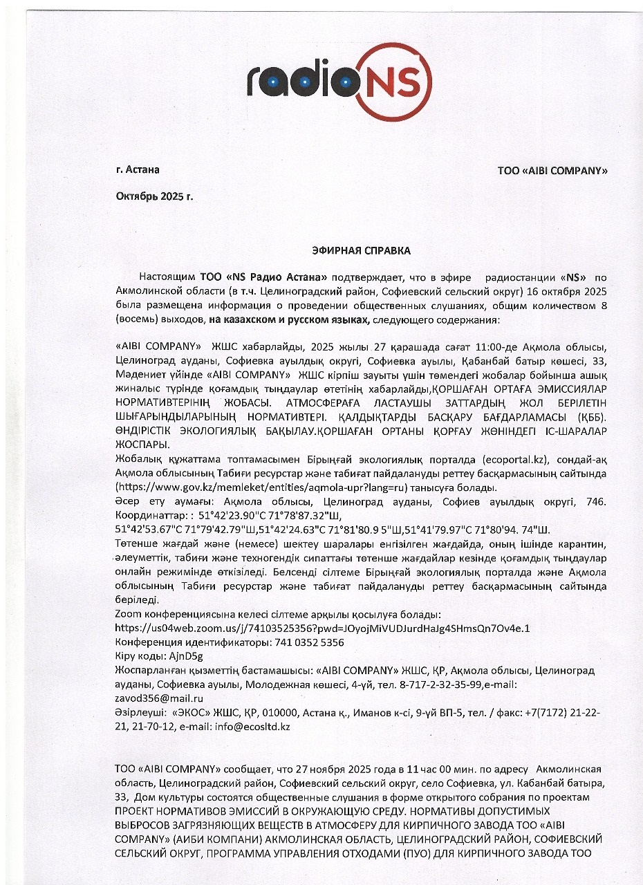 По проекту: ПРОЕКТ НОРМАТИВОВ ЭМИССИЙ В ОКРУЖАЮЩУЮ СРЕДУ. НОРМАТИВЫ ДОПУСТИМЫХ ВЫБРОСОВ ЗАГРЯЗНЯЮЩИХ ВЕЩЕСТВ В АТМОСФЕРУ ДЛЯ КИРПИЧНОГО ЗАВОДА ТОО «AIBI COMPANY» (АИБИ КОМПАНИ) АКМОЛИНСКАЯ ОБЛАСТЬ, ЦЕЛИНОГРАДСКИЙ РАЙОН, СОФИЕВСКИЙ СЕЛЬСКИЙ ОКРУГ, ПРОГРАММА УПРАВЛЕНИЯ ОТХОДАМИ (ПУО) ДЛЯ КИРПИЧНОГО ЗАВОДА ТОО «AIBI COMPANY» (АИБИ КОМПАНИ) АКМОЛИНСКАЯ ОБЛАСТЬ, ЦЕЛИНОГРАДСКИЙ РАЙОН, СОФИЕВСКИЙ СЕЛЬСКИЙ ОКРУГ. ПРОГРАММА ПРОИЗВОДСТВЕННОГО ЭКОЛОГИЧЕСКОГО КОНТРОЛЯ ДЛЯ КИРПИЧНОГО ЗАВОДА ТОО «AIBI COMPANY» (АИБИ КОМПАНИ) АКМОЛИНСКАЯ ОБЛАСТЬ, ЦЕЛИНОГРАДСКИЙ РАЙОН, СОФИЕВСКИЙ СЕЛЬСКИЙ ОКРУГ. ПЛАН МЕРОПРИЯТИЙ ПО ОХРАНЕ ОКРУЖАЮЩЕЙ СРЕДЫ ДЛЯ КИРПИЧНОГО ЗАВОДА ТОО «AIBI COMPANY» (АИБИ КОМПАНИ) АКМОЛИНСКАЯ ОБЛАСТЬ, ЦЕЛИНОГРАДСКИЙ РАЙОН, СОФИЕВСКИЙ СЕЛЬСКИЙ ОКРУГ