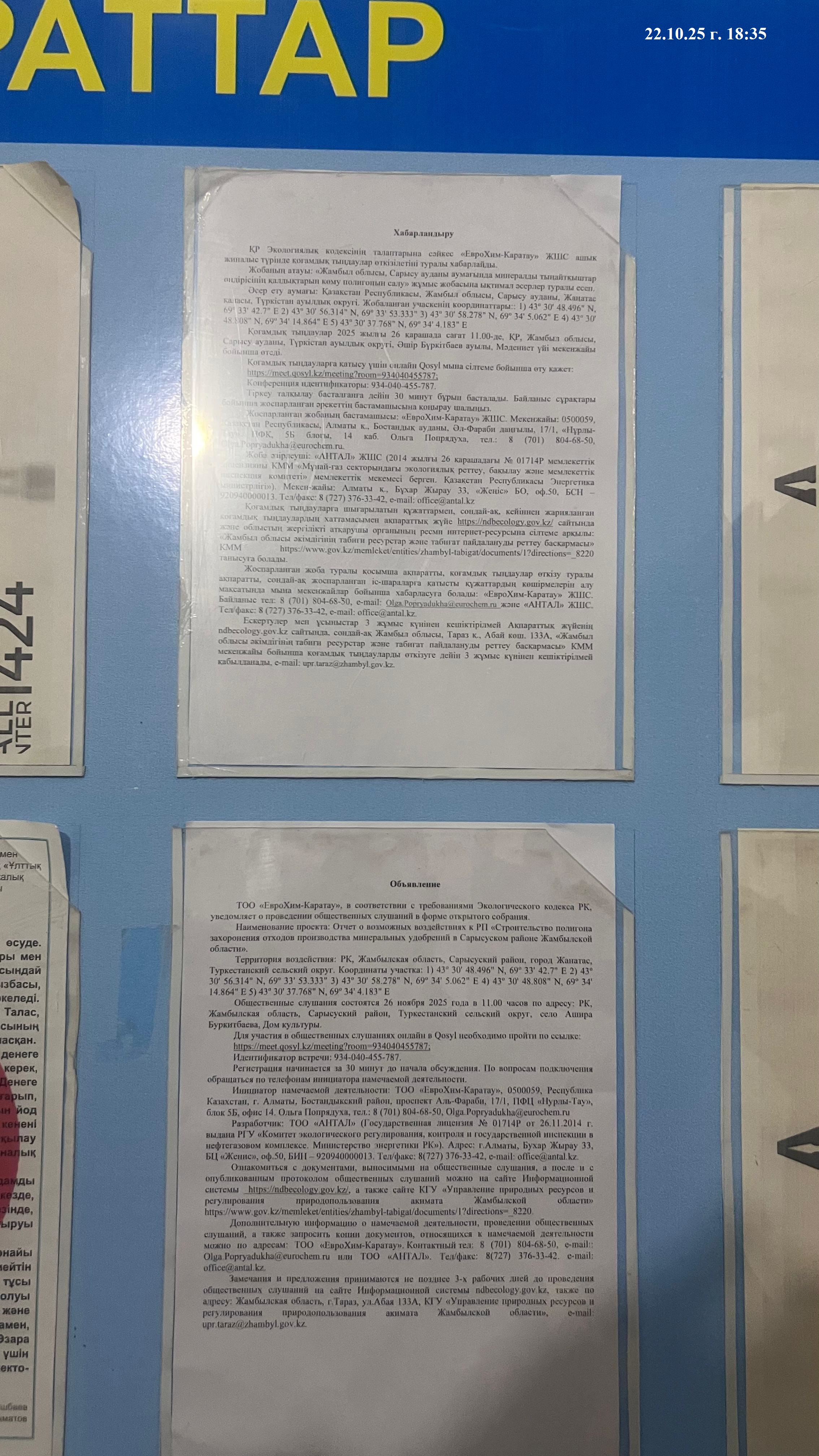 3. Общественные слушания организованны: Управление природных ресурсов и регулирования природопользования Жамбылской области, s.agabek@zhambyl.gov.kz,