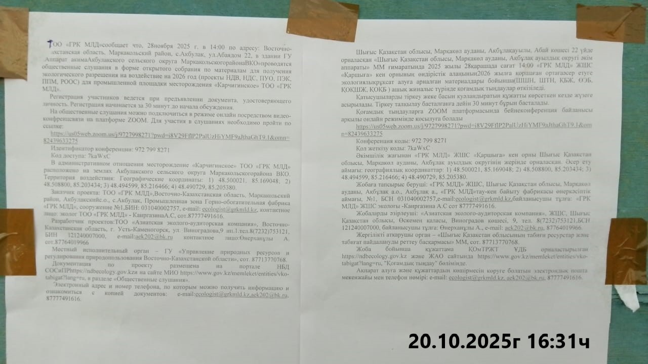 4. Повестка дня общественных слушаний: В административном отношении месторождение «Карчигинское» ТОО «ГРК МЛД» расположено на землях Акбулакского сельского округа Маркакольского района ВКО. Проект нормативов допустимых выбросов на 2026 год для промышленной площадки месторождения «Карчигинское» ТОО «ГРК МЛД». Проект нормативов допустимых сбросов на 2026 год для промышленной площадки месторождения «Карчигинское» ТОО «ГРК МЛД». Программа управления отходами на 2026 год для промышленной площадки месторождения «Карчигинское» ТОО «ГРК МЛД». Программа производственного экологического контроля на 2026 год для промышленной площадки месторождения «Карчигинское» ТОО «ГРК МЛД». План мероприятий по охране окружающей среды на 2026 год для промышленной площадки месторождения «Карчигинское» ТОО «ГРК МЛД». Раздел охраны окружающей среды «Реконструкция Обогатительной Фабрики по переработке руды месторождения Карчигинское производительностью 350 000 т в год» ТОО «ГРК МЛД»