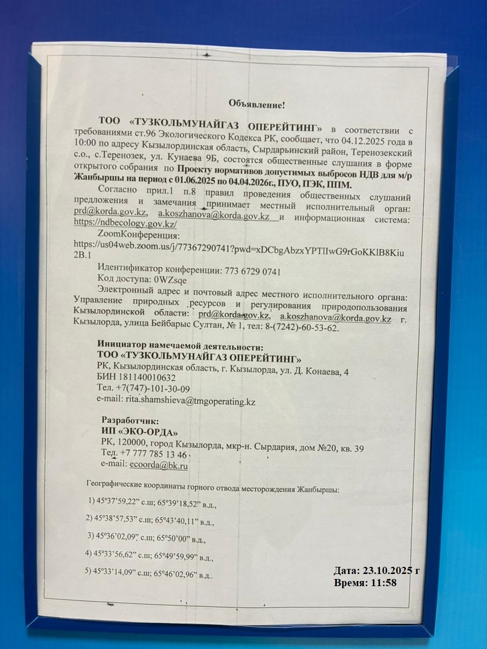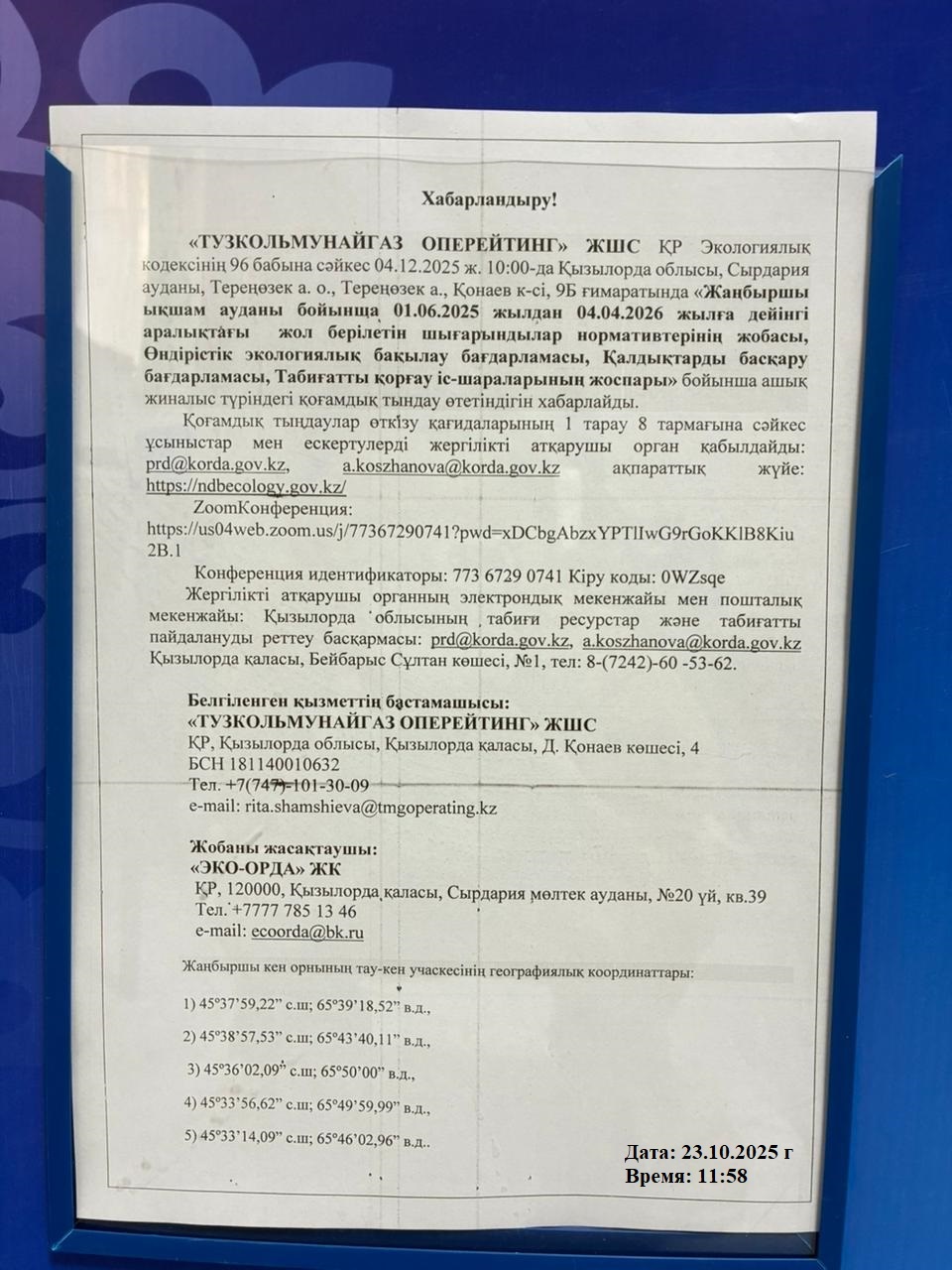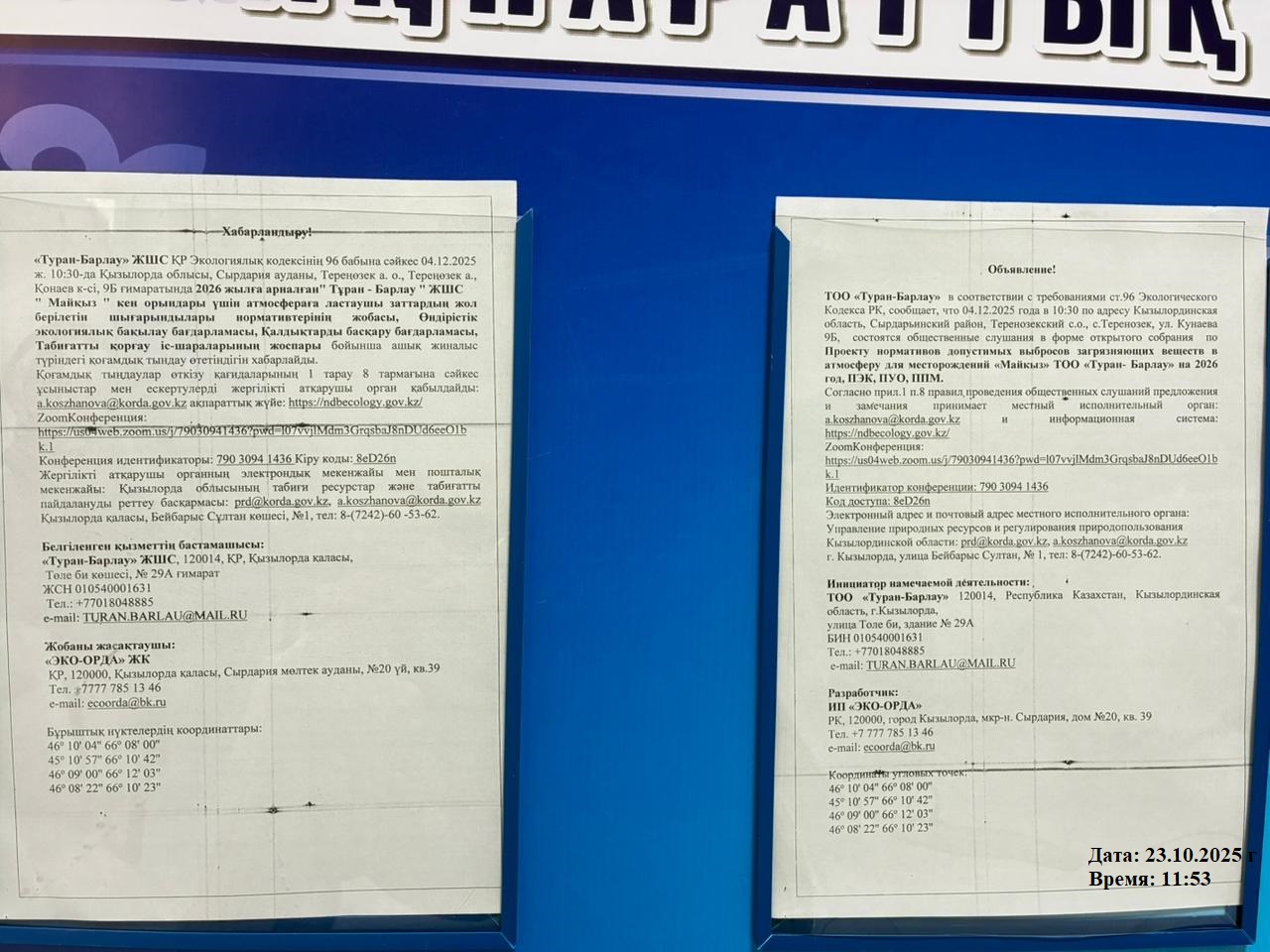 3. Общественные слушания организованны: Управление природных ресурсов и регулирования природопользования Кызылординской области, prd@korda.gov.kz 87242605362, 605369,