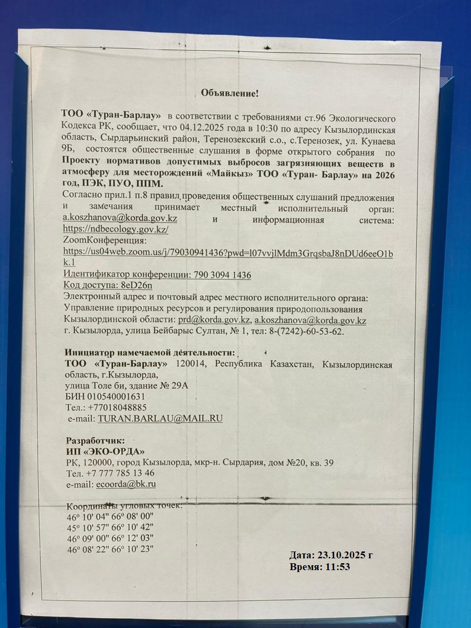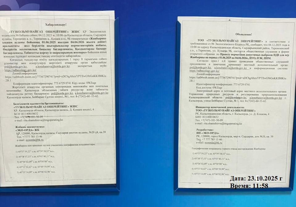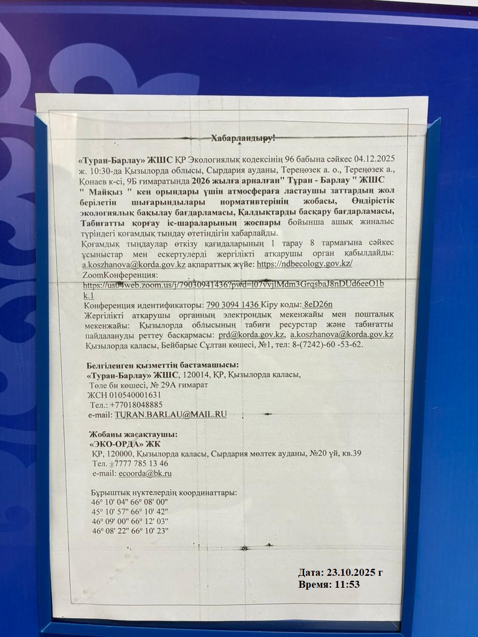 3. Общественные слушания организованны: Управление природных ресурсов и регулирования природопользования Кызылординской области, prd@korda.gov.kz 87242605362, 605369,