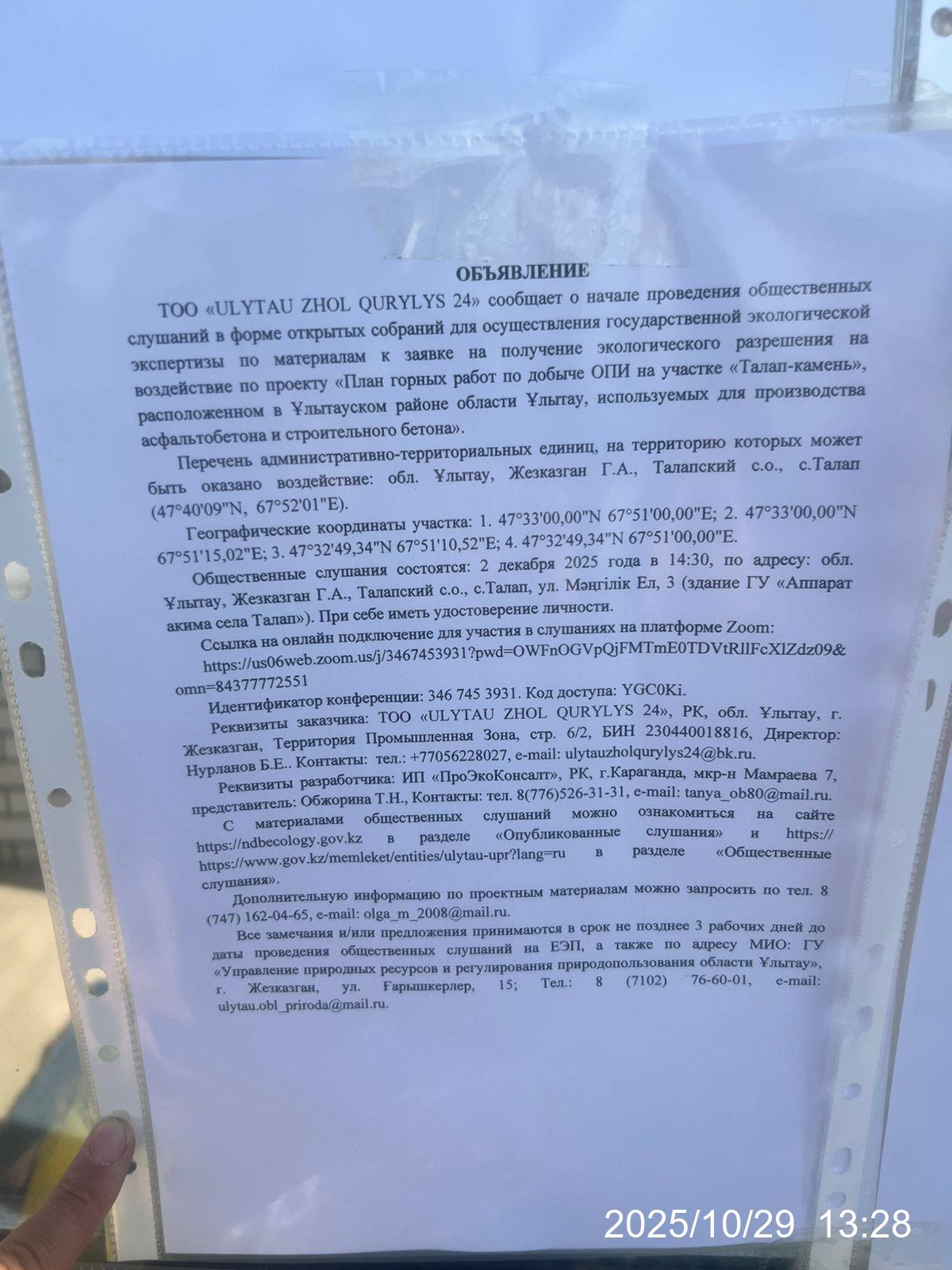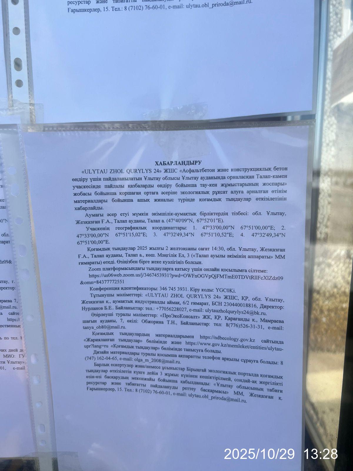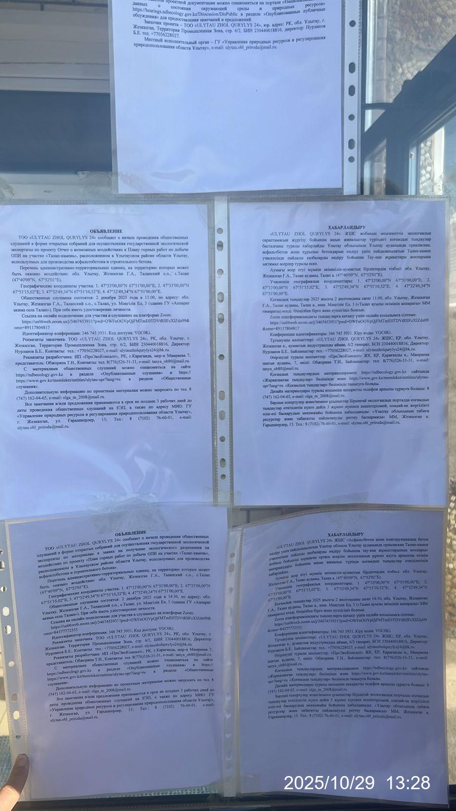 3. Общественные слушания организованны: Главный специалист УПР и ПР область Ұлытау, ulytau.obl_priroda@mail.ru,