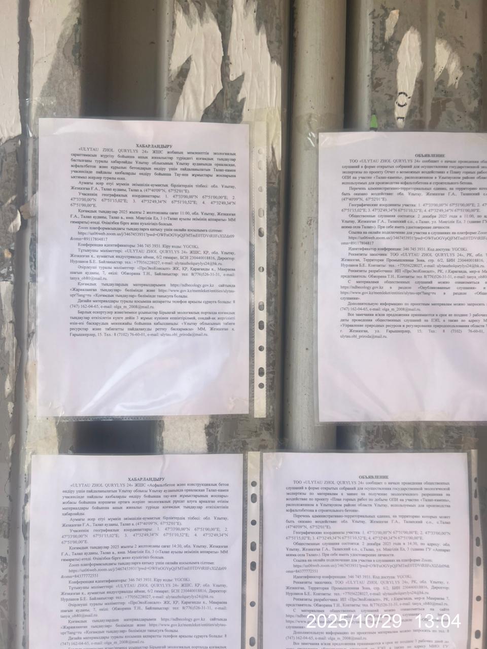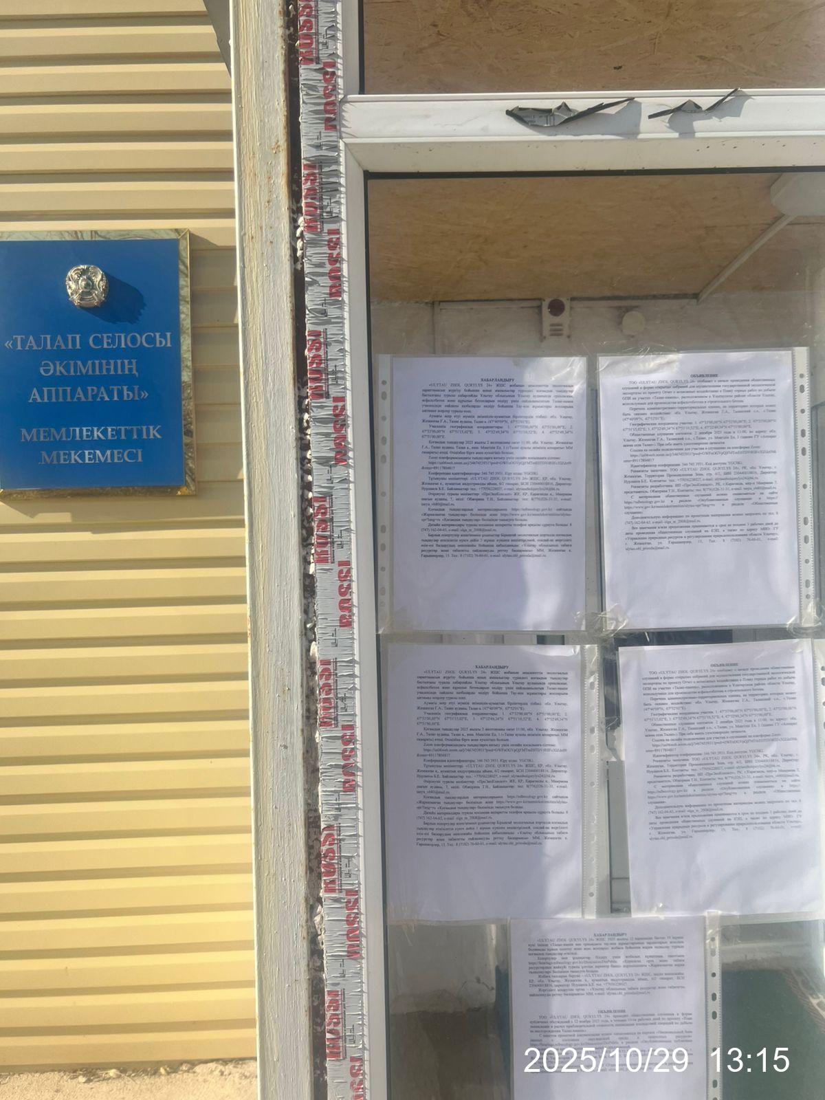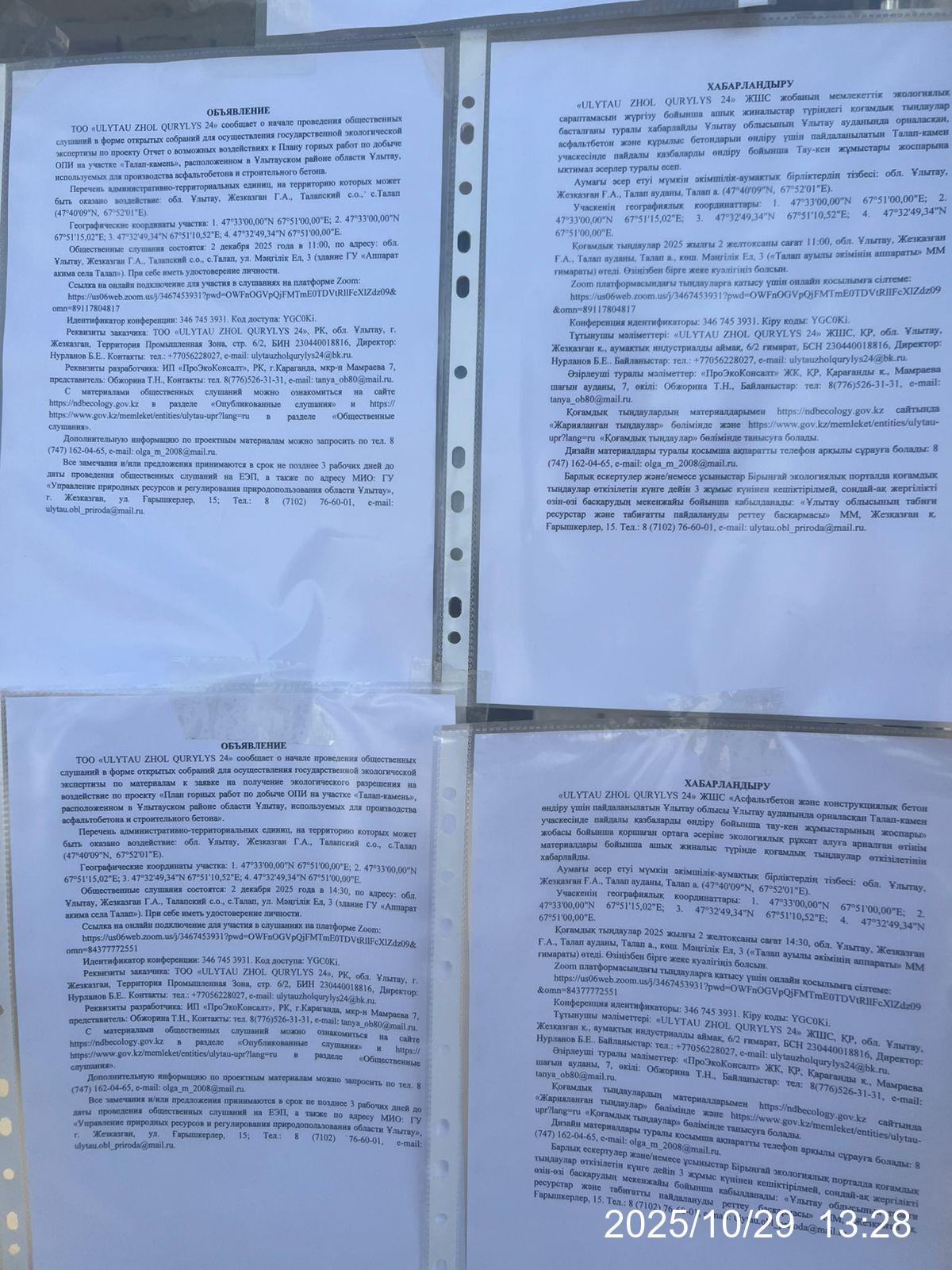 1.4. Описание для подключения к онлайн трансляции при прохождении общественного слушания: в соответствии с пп.4, п.11 прил. 3 Правил, информация о проведении общественных слушаний должна быть распространена на государственном и русском языках на досках объявлений местных исполнительных органов административно-территориальных единиц и в местах, специально предназначенных для размещения объявлений. В связи с чем необходимо дополнительно разместить печатные объявления на досках объявлений в акимате и в местах, специально предназначенных для размещения объявлений.