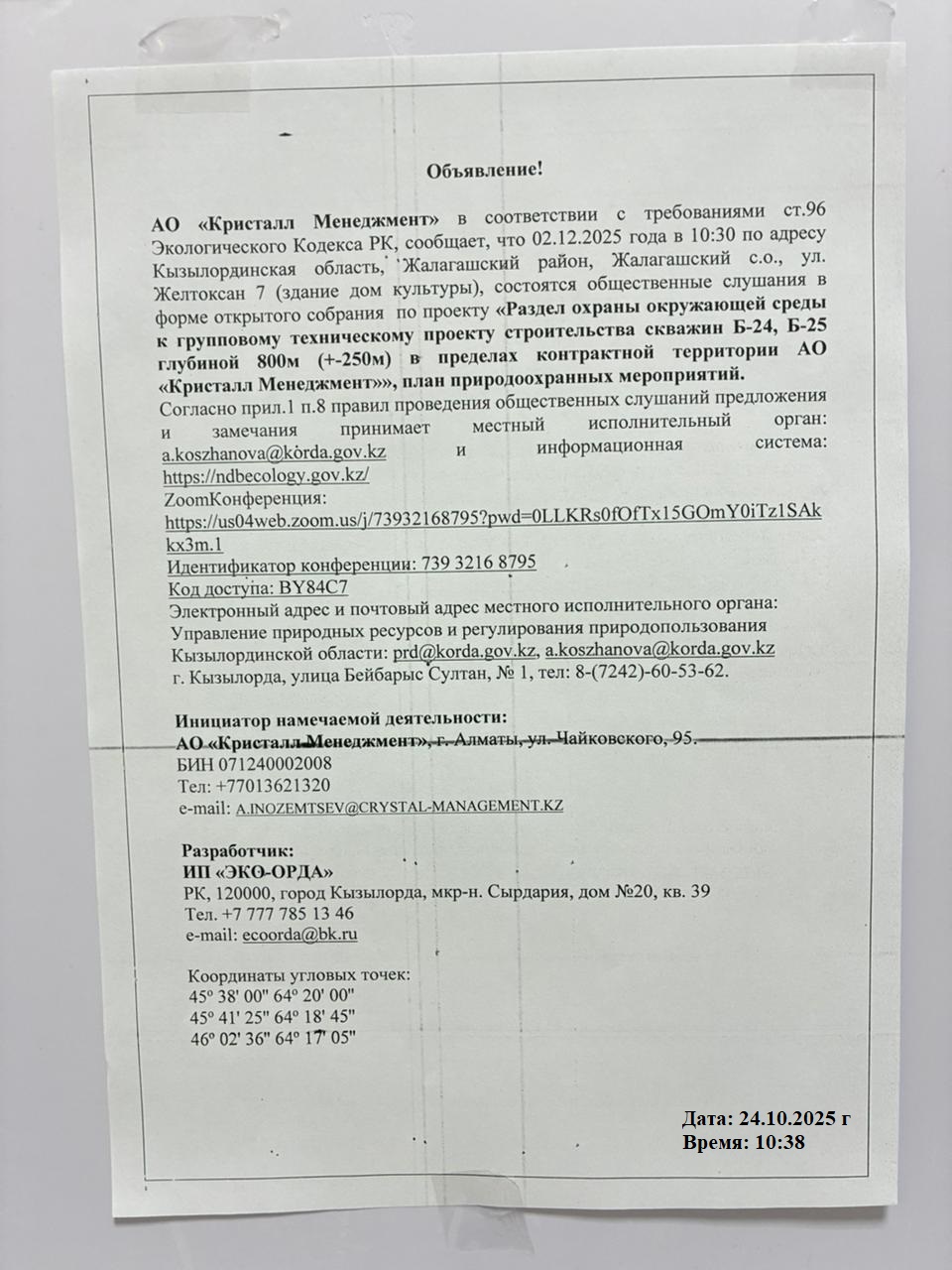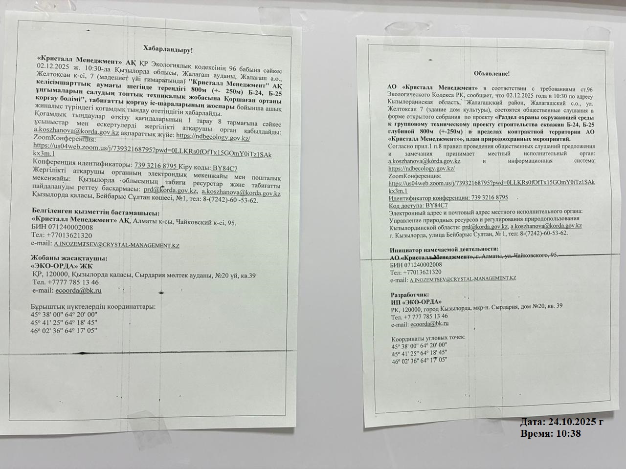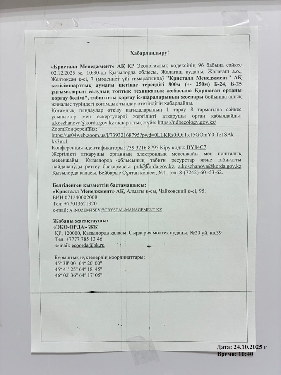 3. Общественные слушания организованны: Управление природных ресурсов и регулирования природопользования Кызылординской области, prd@korda.gov.kz 87242605362, 605369,