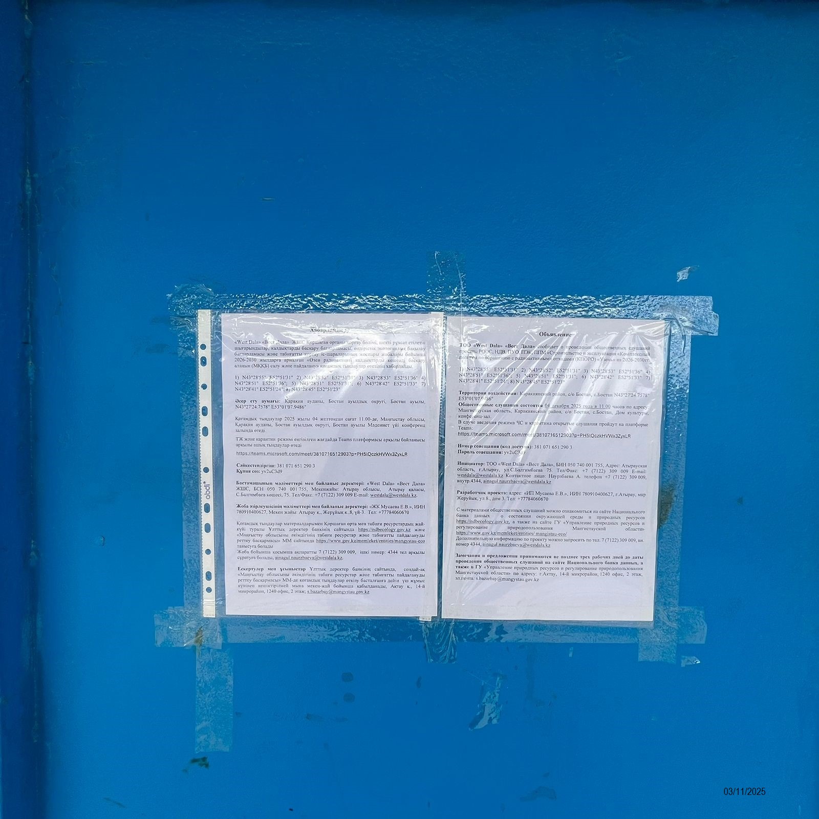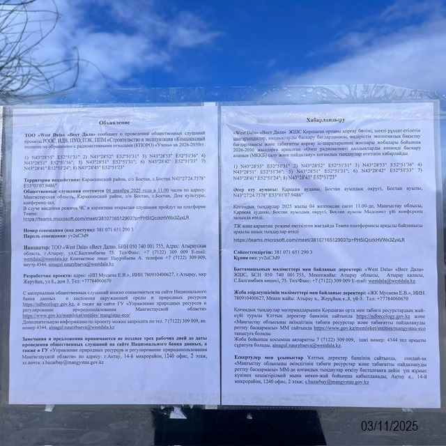3. Общественные слушания организованны: Управление природных ресурсов и регулирования природопользования Мангистауской области, s.bazarbay@mangystau.gov.kz,