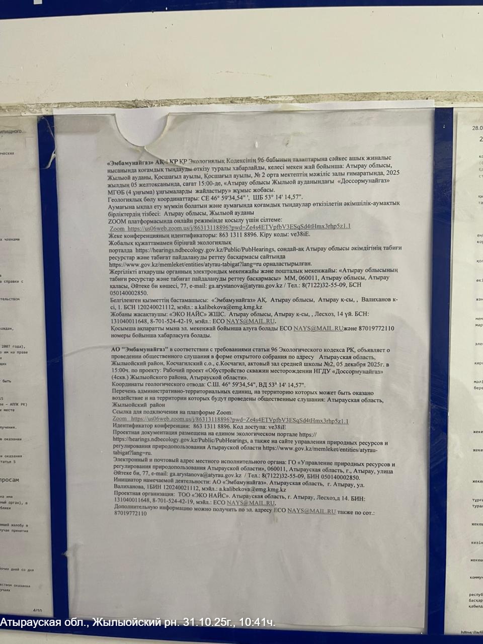 3. Общественные слушания организованны: Управление природных ресурсов и регулирования природопользования Атырауской области, atr.priroda@atyrau.gov.kz,