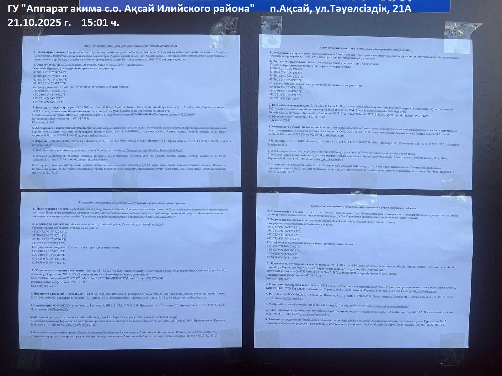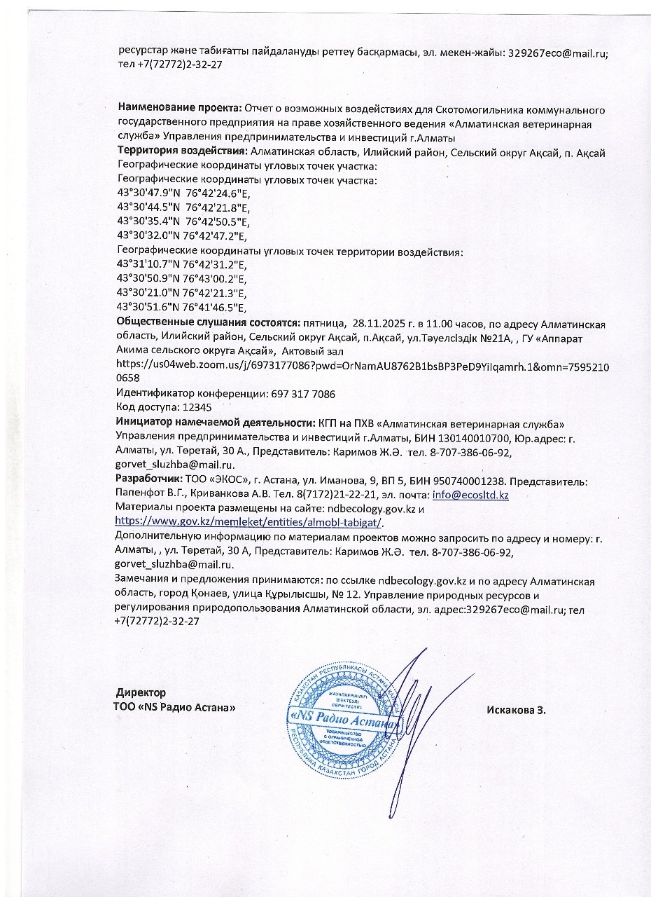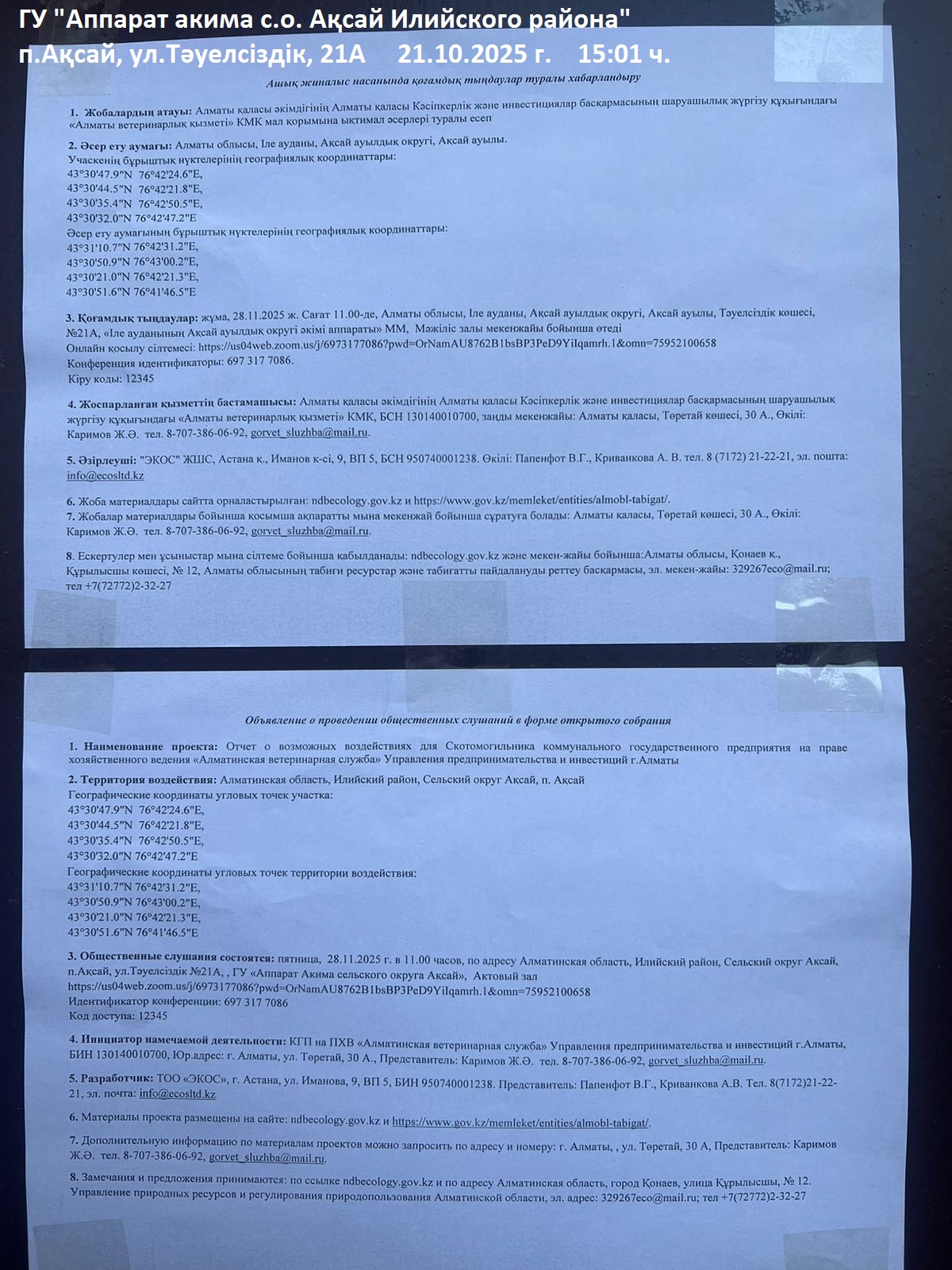 6. Объявление о проведении общественных слушаний на казахском и русском языках будет распространено следующими способами: