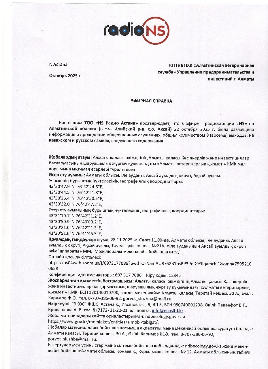 3. Общественные слушания организованны: Управление природных ресурсов и регулирования природопользования Алматинской области, 329267eco@mail.ru,