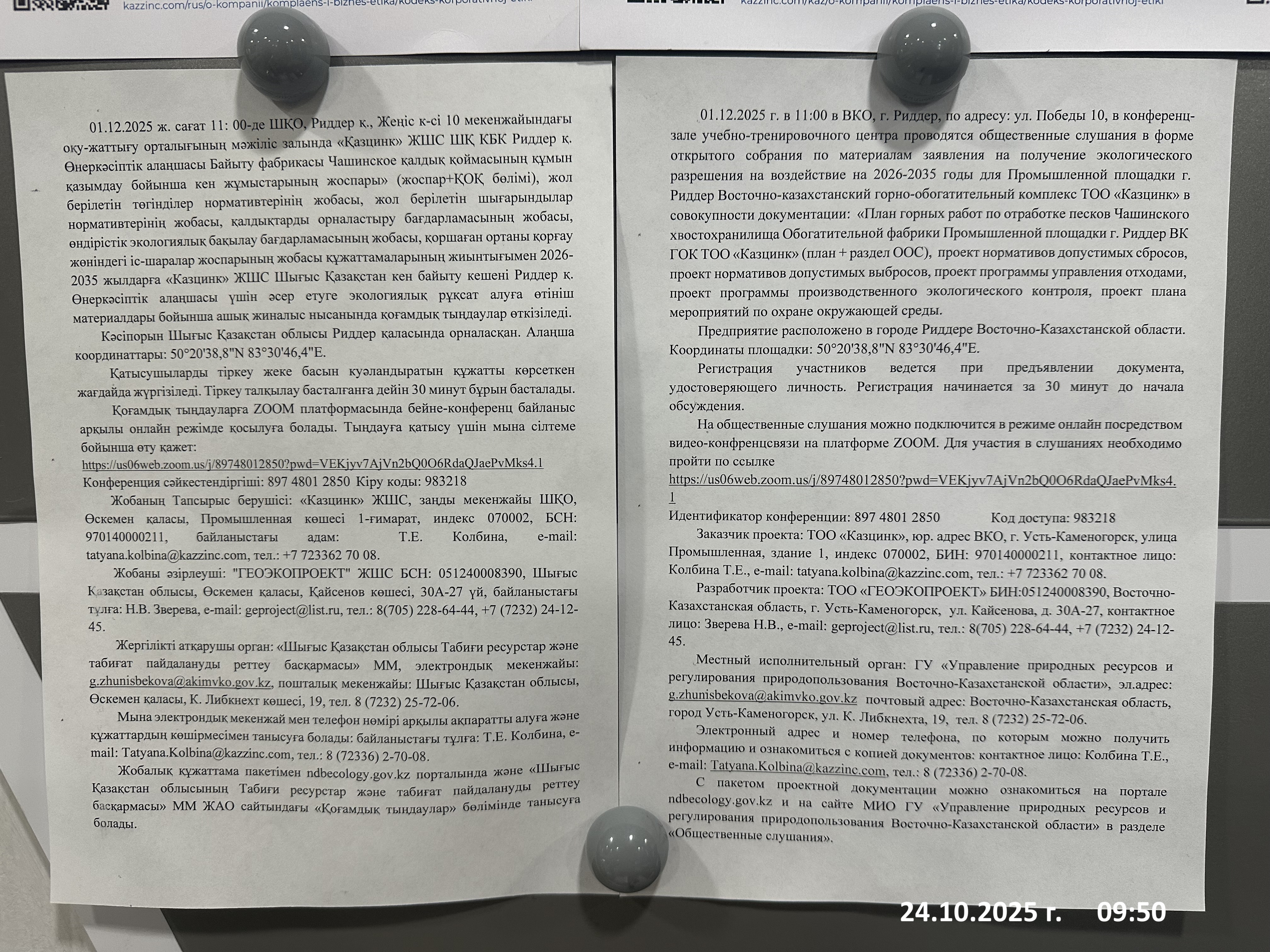 12. План мероприятий Промышленной площадки г.Риддер Восточно-Казахстанского горно-обогатительного комплекса ТОО «Казцинк» по сокращению выбросов загрязняющих веществ в атмосферу в периоды неблагоприятных метеорологических условий на 2026-2035 годы направлен в РГУ «Департамент экологии по Восточно-Казахстанской области КЭРК МЭПР РК» 19.11.2025, в настоящее время находится на согласовании.