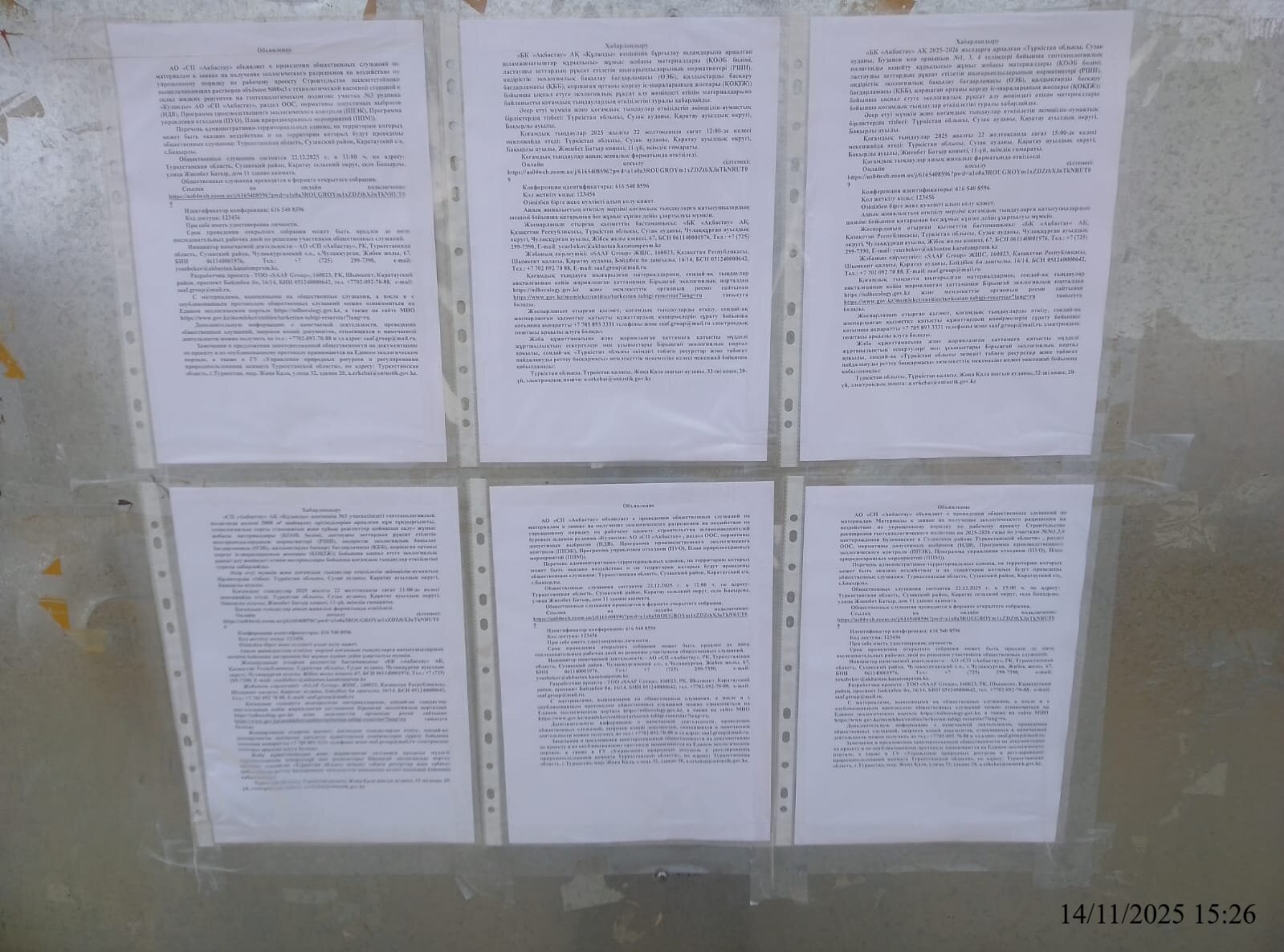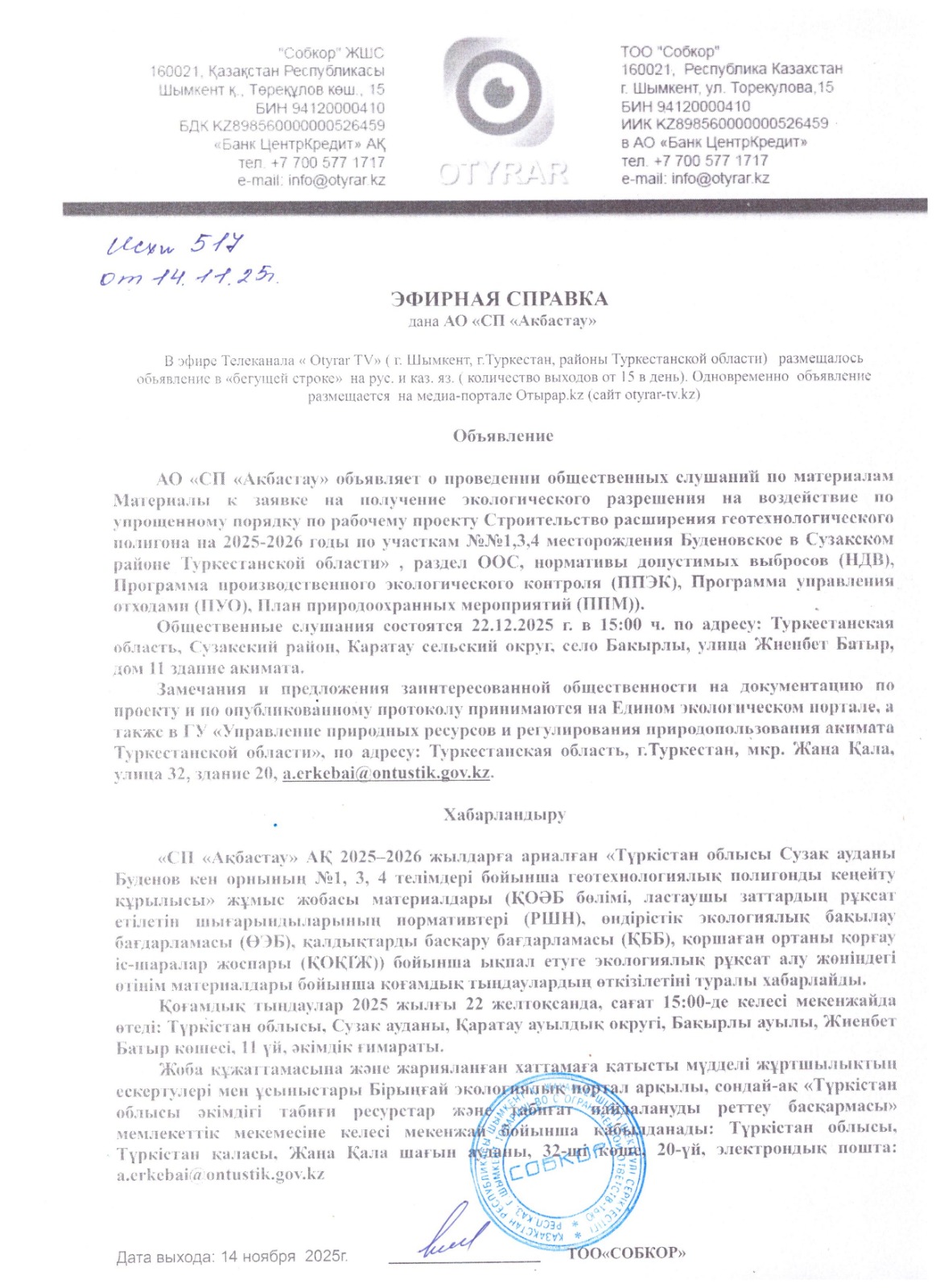 3. Общественные слушания организованны: Управление природных ресурсов и регулирования природопользования Туркестанской области, a.erkebai@ontustik.gov.kz,