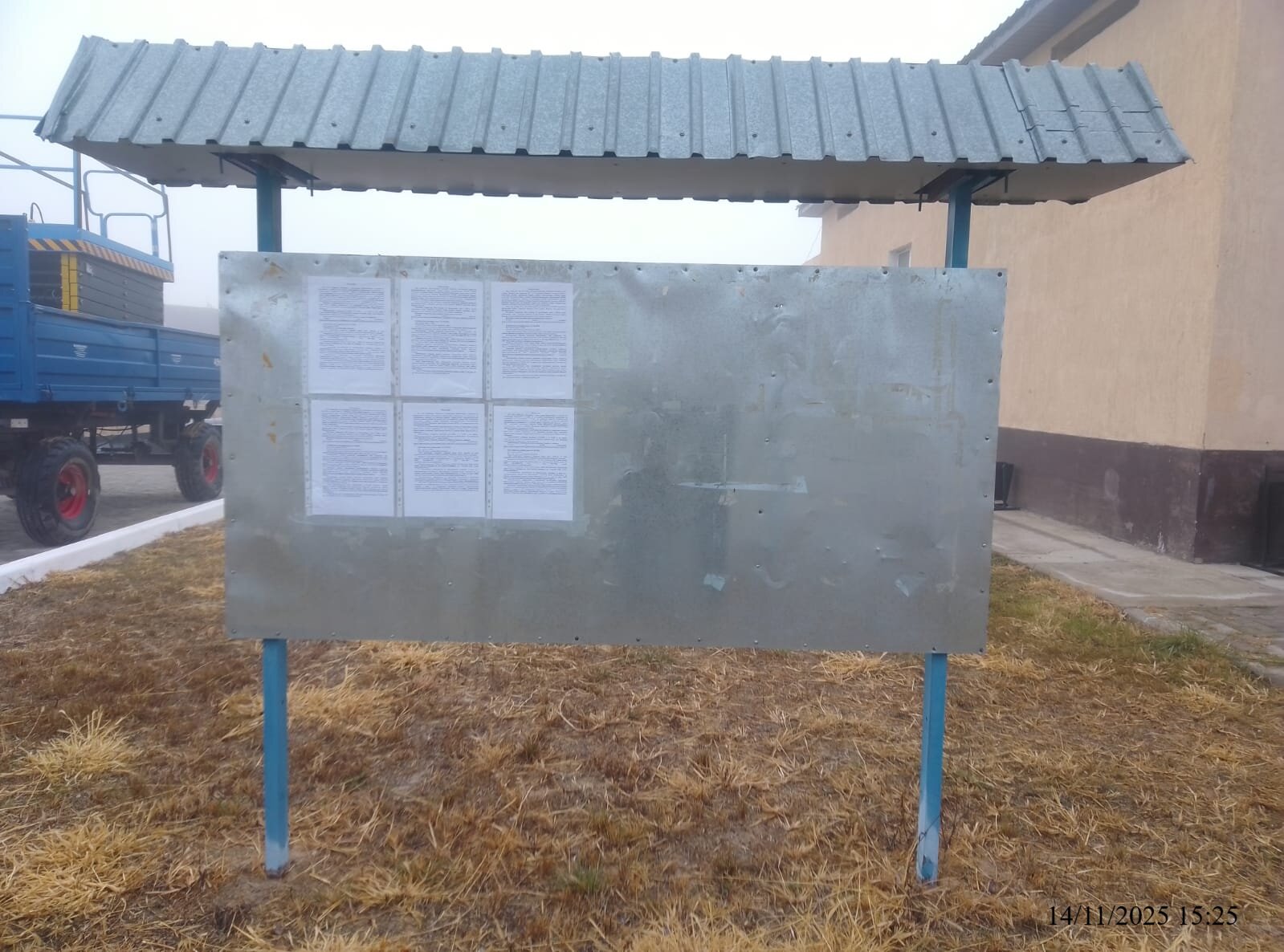 6.3. расположение мест, специально предназначенных для Размещения печатных объявлений (доски объявлений): 161001, Туркестанская область, Сузакский район, Каратау сельский округ, село Бакырлы, улица Жиенбет Батыр, дом 11 здание акимата
