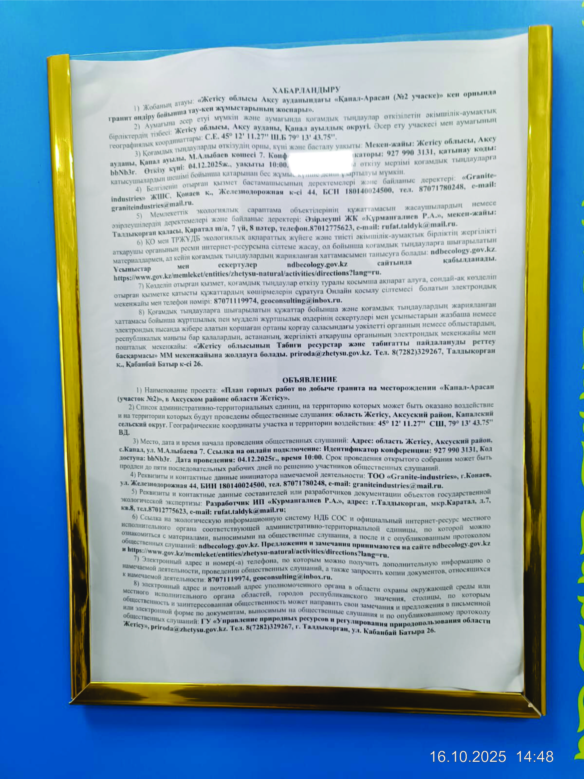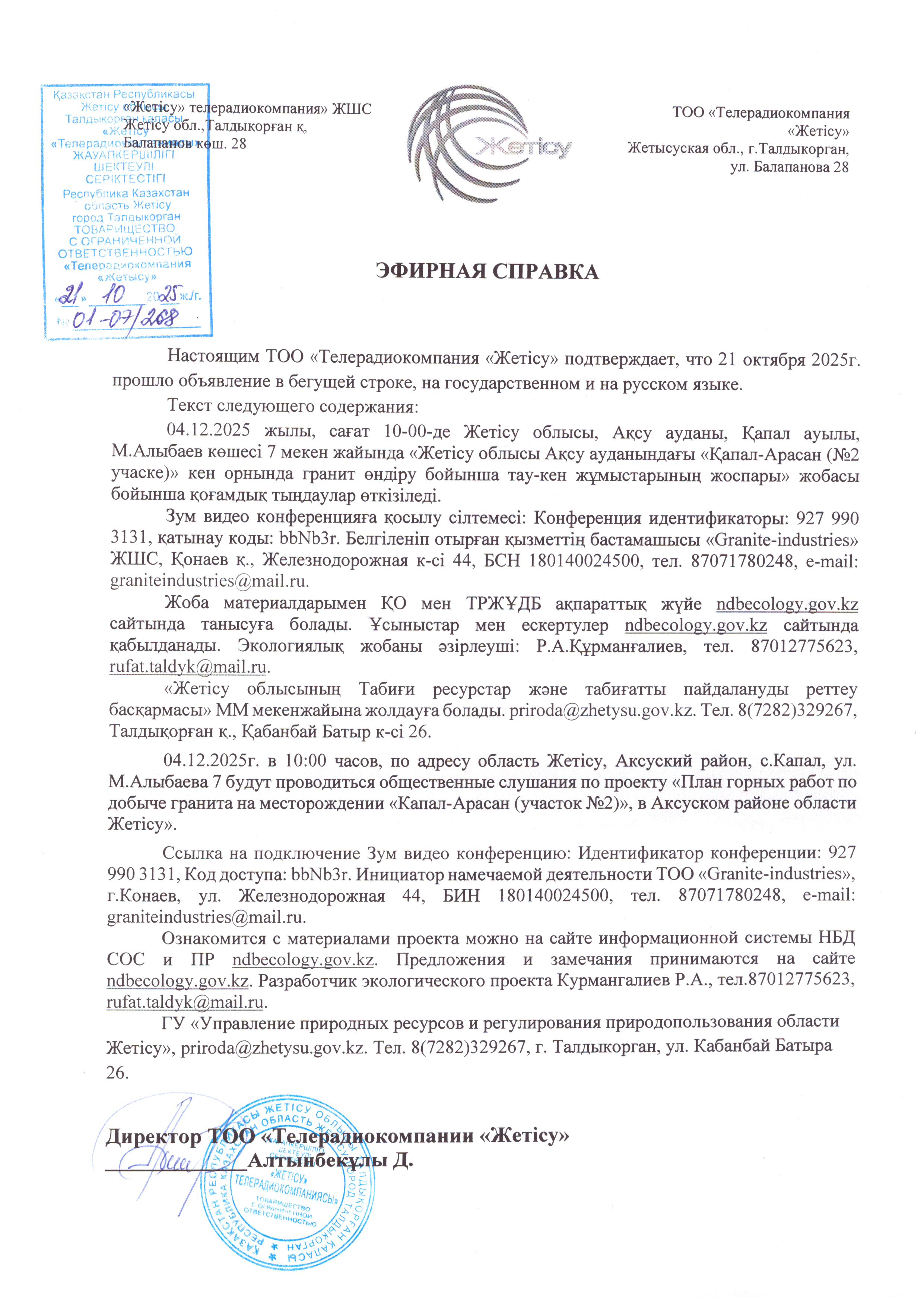 3. Общественные слушания организованны: Главный специалист УПР и ПР Жетысуйской области, priroda@zhetisu.gov.kz,