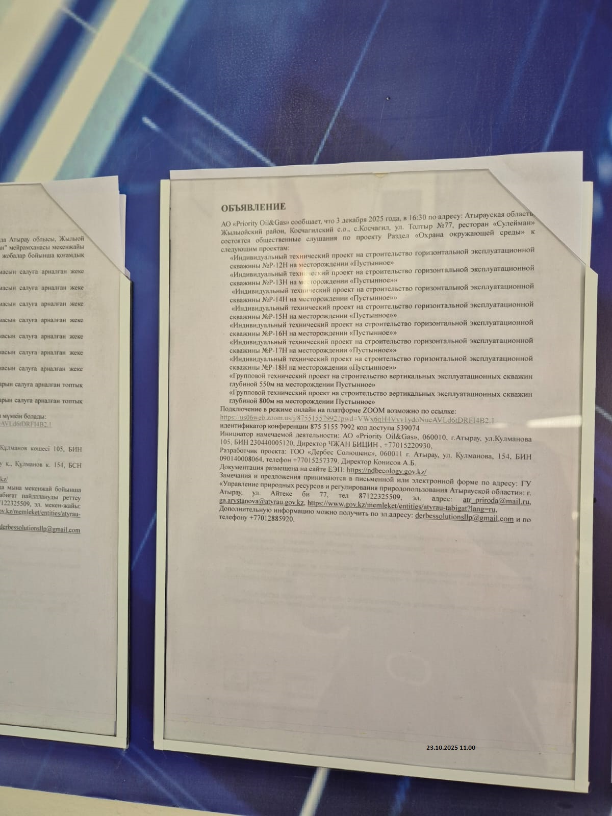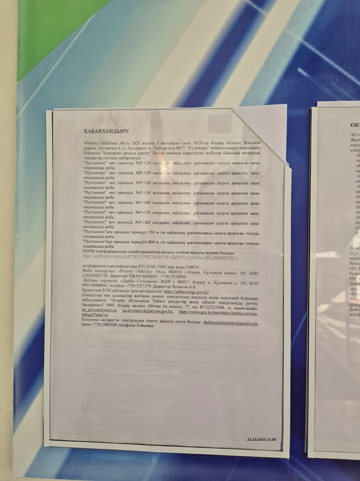3. Общественные слушания организованны: Управление природных ресурсов и регулирования природопользования Атырауской области, atr.priroda@atyrau.gov.kz,