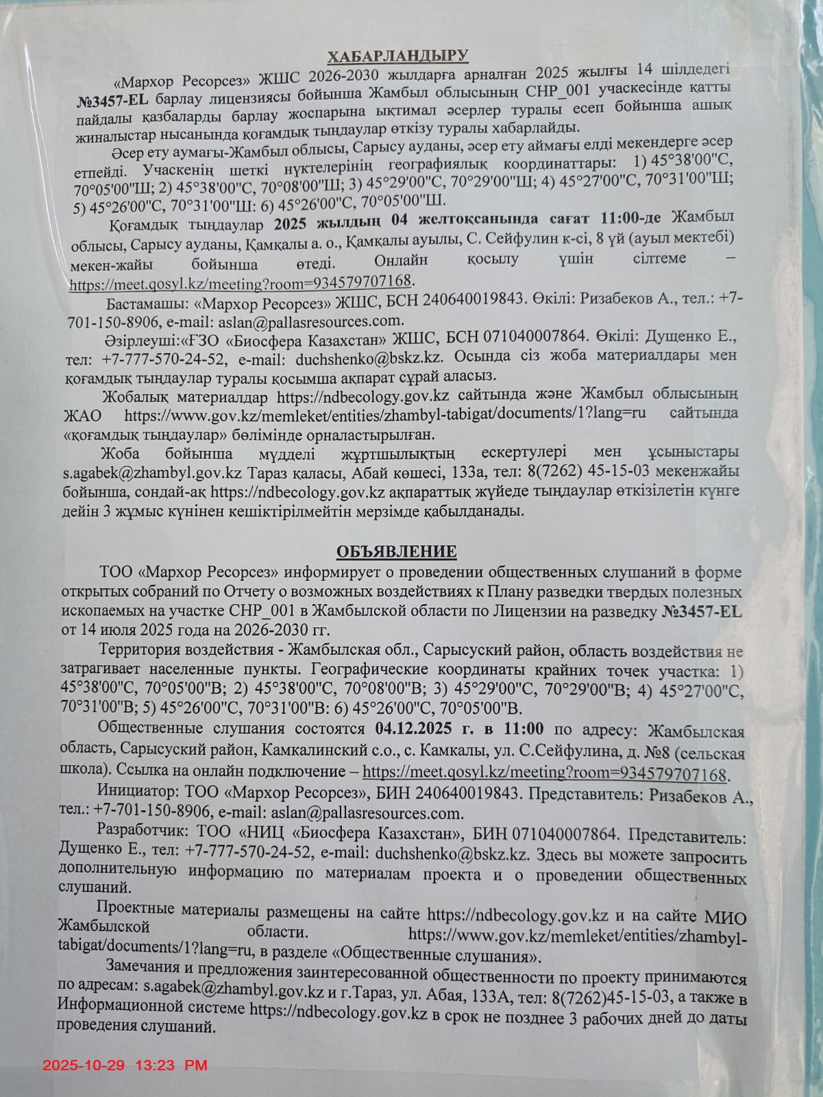 1.4. Описание для подключения к онлайн трансляции при прохождении общественного слушания: Приглашение на запланированную встречу в Qosyl Тема встречи: Товарищество с ограниченной ответственностью ""Мархор Ресорсез"" Время встречи: 04.12.2025 11:00 Длительность встречи: 01 час. Идентификатор встречи: 934-579-707-168 Подключиться к встрече в Qosyl: https://meet.qosyl.kz/meeting?room=934579707168