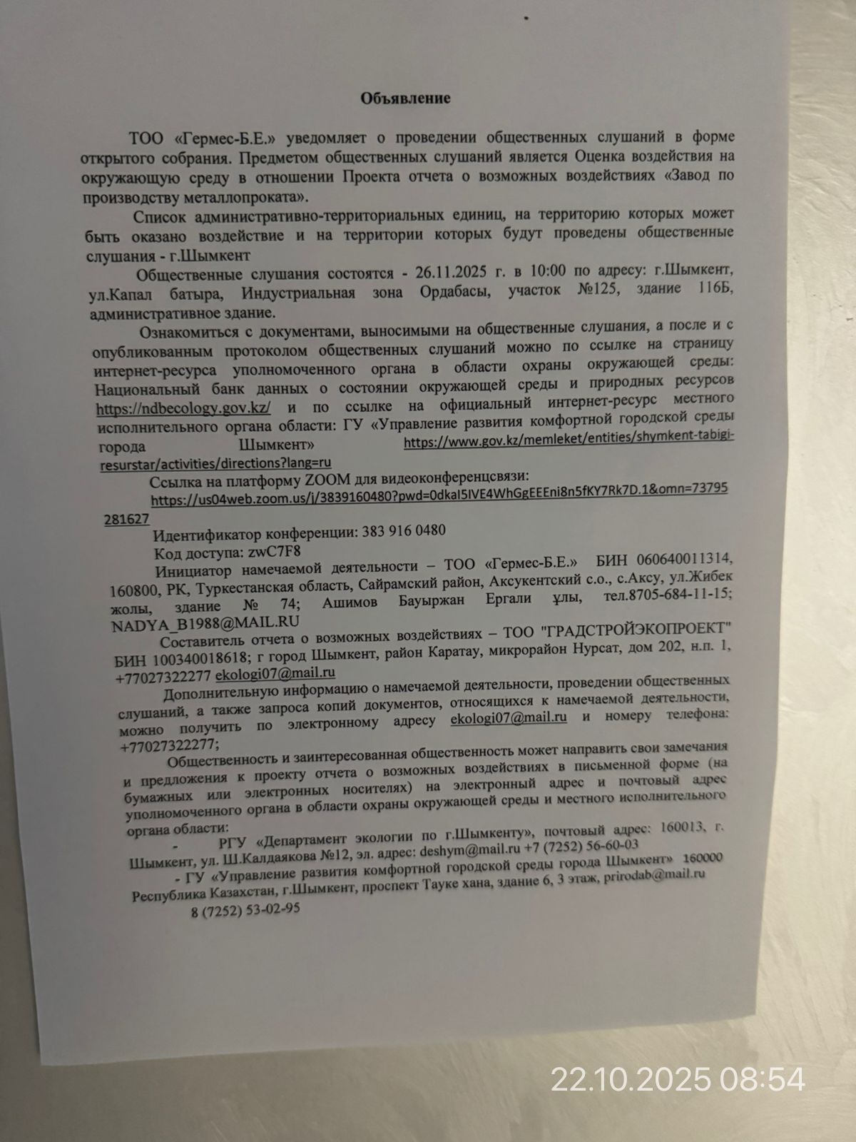 4. Повестка дня общественных слушаний: Предприятие предназначено для переработки вторичного металлического сырья с получением квадратных заготовок, последующей их прокаткой и выпуском готовой продукции: арматуры, уголка и катанки. Производственный процесс организован на основе работы электродуговых печей. Завод расположен по адресу: г.Шымкент, ул.Капал батыра, территория Ондиристик, 116Б