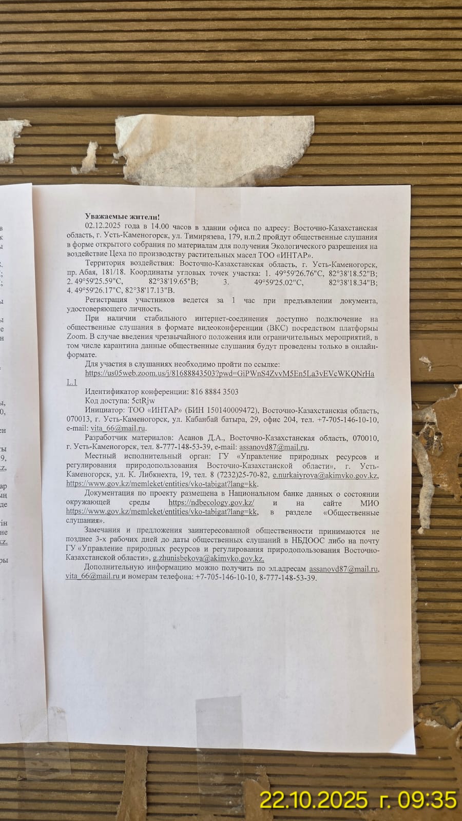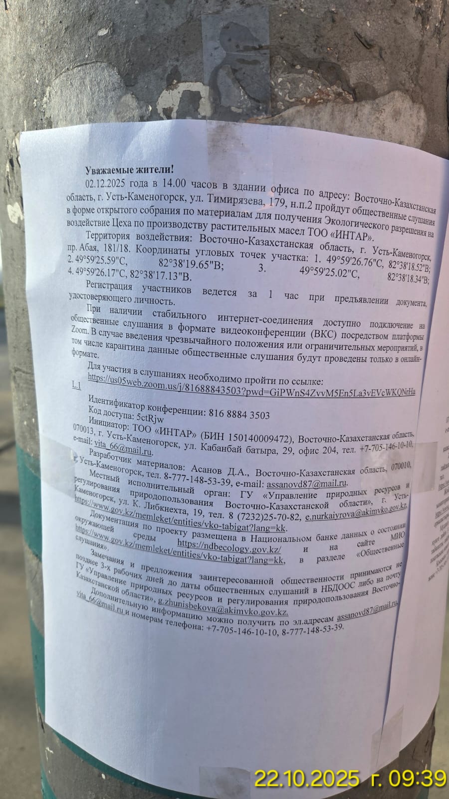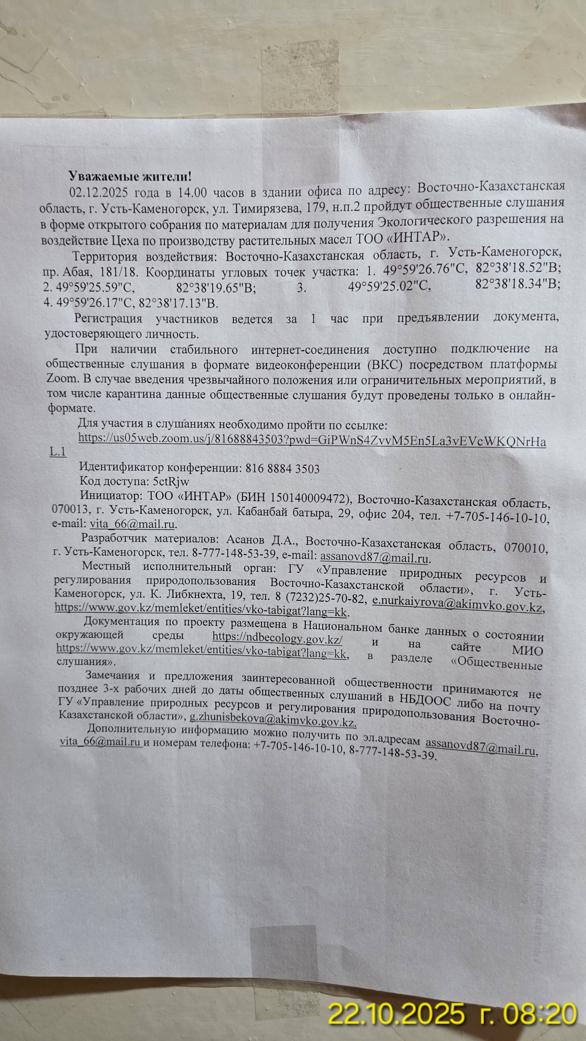 4. Повестка дня общественных слушаний: Целью работы является получение Экологического разрешения на воздействие для цеха по производству растительных масел ТОО «ИНТАР» на срок с 2026 по 2034 г.г. Цех расположен по адресу: Восточно-Казахстанская область, г. Усть-Каменогорск, пр. Абая, 181/18. В настоящее время предприятие эксплуатируемое, работает в рамках действующего разрешения на эмиссии в окружающую среду № KZ15VDD00102734 от 26.10.2018 года. Основным сырьем для данного производства являются семена подсолнечника, закупаемые у местных крестьянских хозяйств. Объем перерабатываемых семян подсолнечника изменению не подлежит и составляет 8000 т/год. Решением РГУ «Департамент экологии по Восточно-Казахстанской области» от 28.09.2021 года об определении категории объекта, оказывающего негативное воздействие на окружающую среду для ТОО «ИНТАР» определена II категория. В состав цеха входя следующие объекты: склад семян подсолнечника, нория №1, очистительная машина Петкус, камнеуловитель, рушилка и веялка, отделение теплогенератора. Для снабжения теплом технологического оборудования (жаровен) и отопления помещений в цехе установлен теплогенератор на твердом топливе. Годовой расход лузги подсолнечника составляет 418 т, сора семян подсолнечника 50 т, угля месторождения Каражыра – 5 т (резервное топливо на случай отсутствия лузги в зимнее время). Все отходы передаются на утилизацию и захоронение по договору, собственные накопители отходов отсутствуют.
