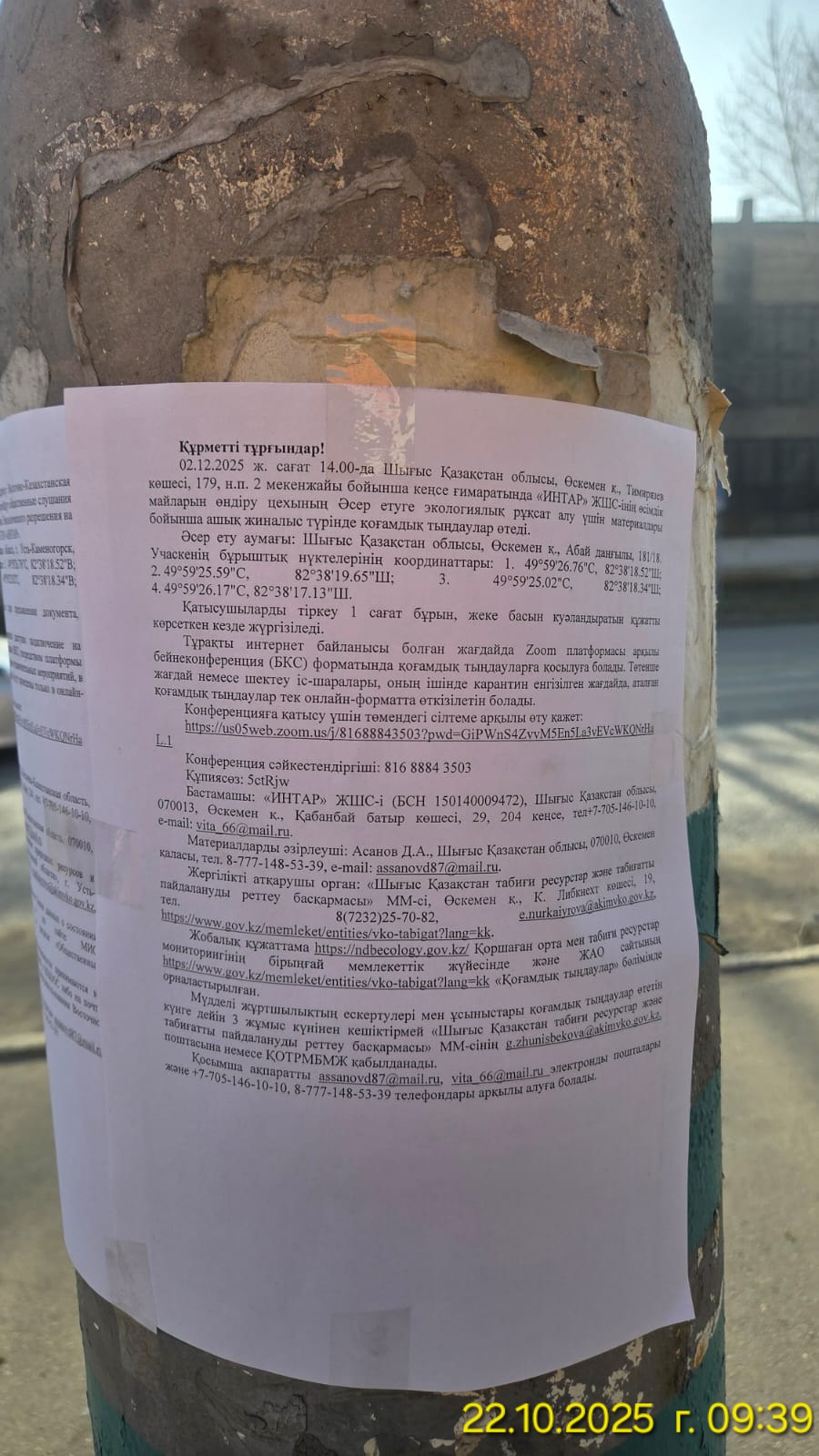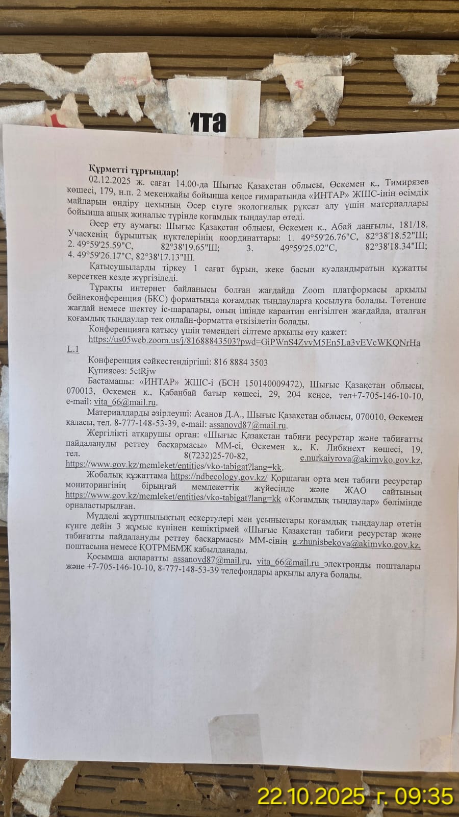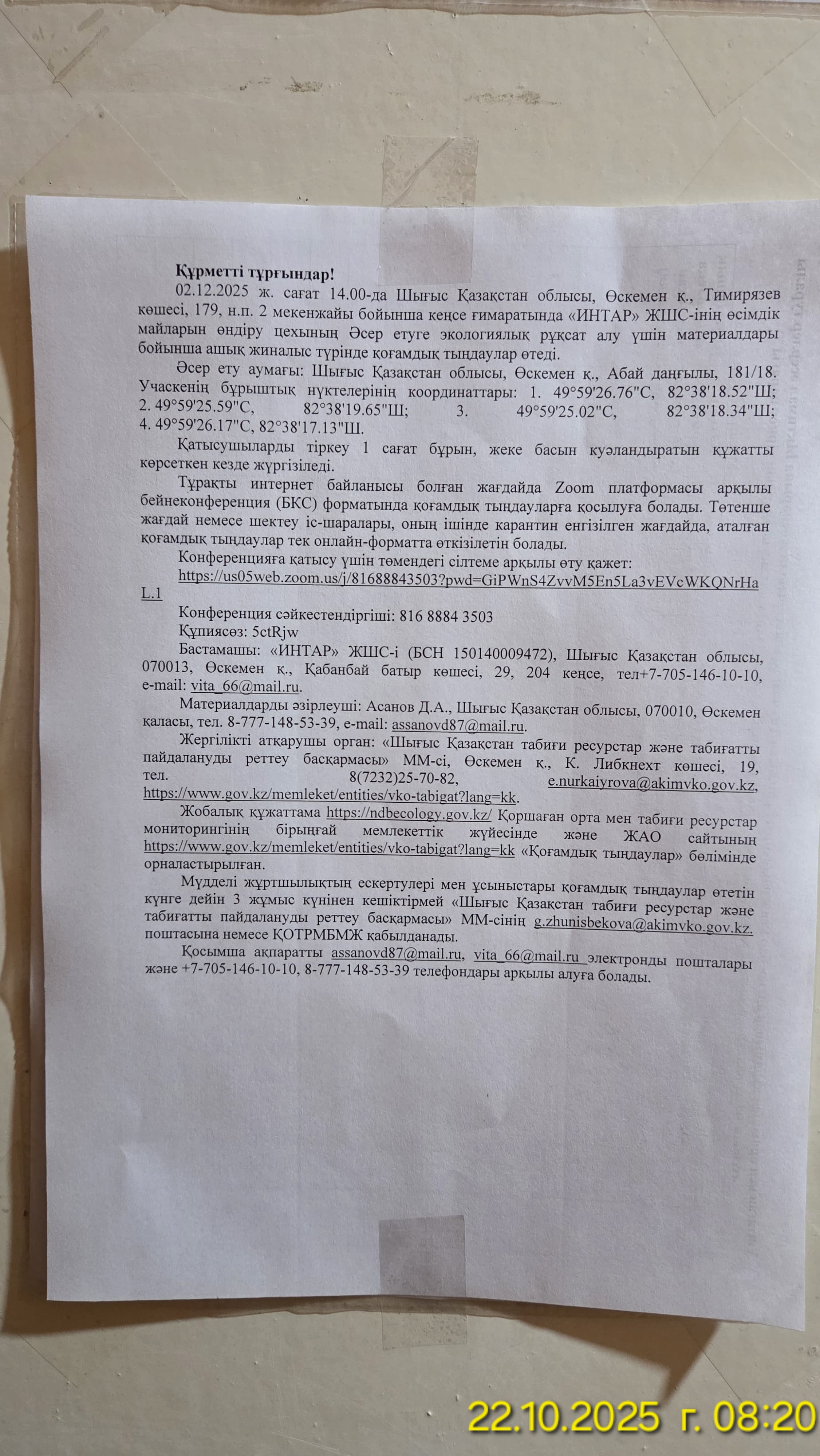 3. Общественные слушания организованны: Управление природных ресурсов и регулирования природопользования Восточно-Казахстанской области, g.zhunisbekova@akimvko.gov.kz,