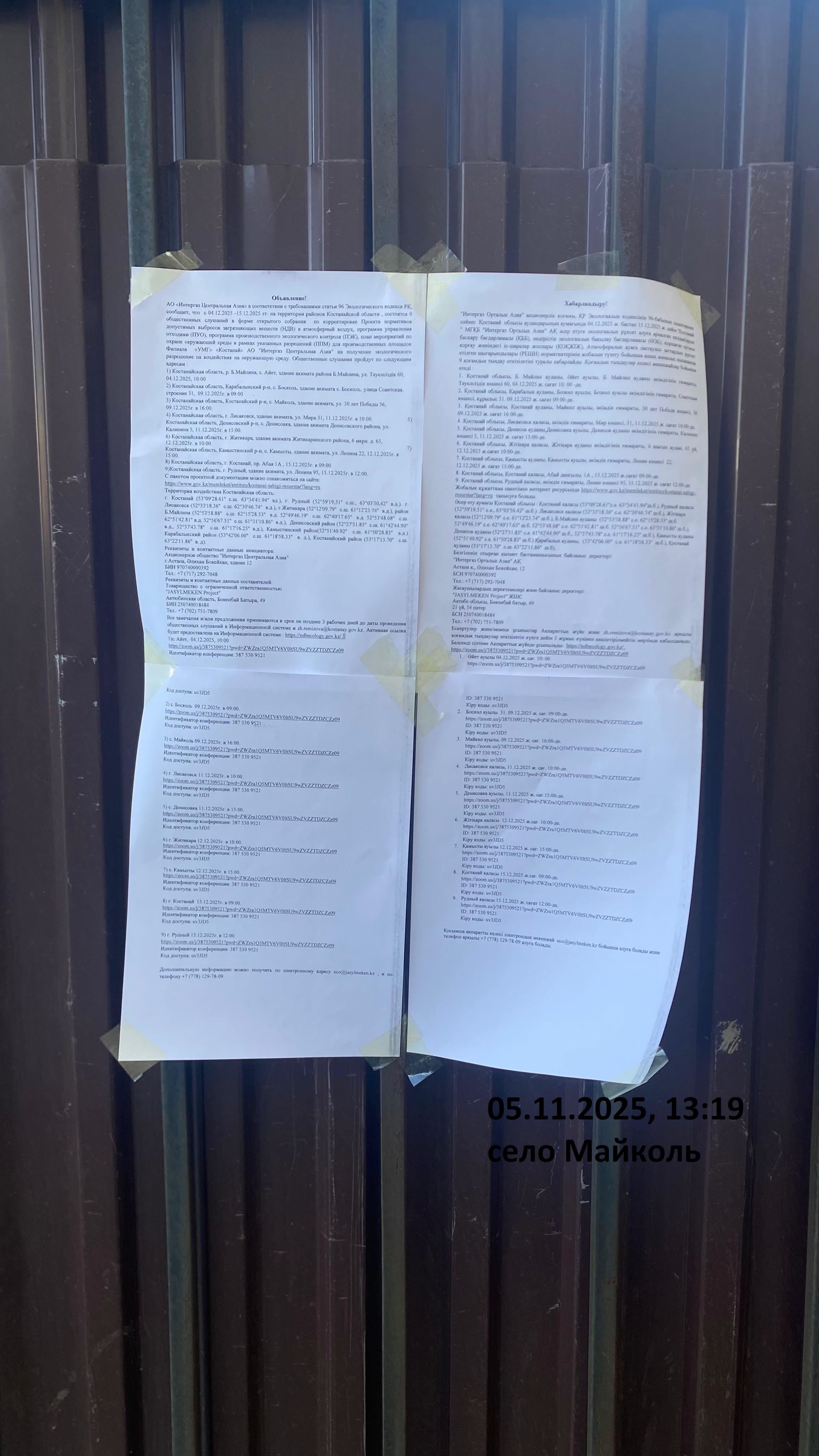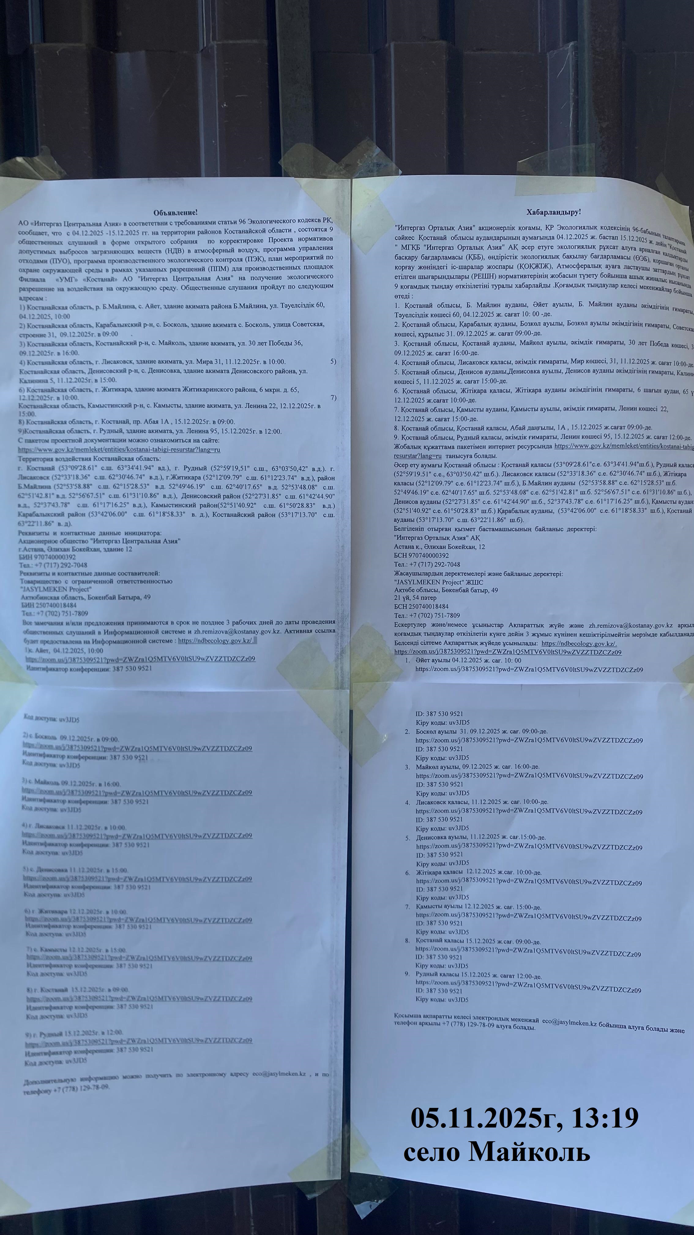 4. Повестка дня общественных слушаний: Хабарландыру! "Интергаз Орталық Азия" акционерлік қоғамы, ҚР Экологиялық кодексінің 96-бабының талаптарына сәйкес Қостанай облысы аудандарының аумағында 09.12.2025 ж. бастап 15.12.2025 ж. дейін "Қостанай " МГҚБ "Интергаз Орталық Азия" АҚ әсер етуге экологиялық рұқсат алуға арналған Атмосфералық ауаға ластаушы заттардың рұқсат етілген шығарындылары (РЕШН) нормативтерінің жобасы,қалдықтарды басқару бағдарламасы (ҚББ), өндірістік экологиялық бақылау бағдарламасы (ӨЭБ), қоршаған ортаны қорғау жөніндегі іс-шаралар жоспары (ҚОҚЖІЖ), жобасын түзету бойынша ашық жиналыс нысанында 9 қоғамдық тыңдау өткізілетіні туралы хабарлайды .Қоғамдық тыңдаулар келесі мекенжайлар бойынша өтеді : 1. Қостанай облысы, Қарабалық ауданы, Боскөл ауылы, Боскөл ауылы әкімі аппаратының ғимараты, Советская көшесі, құрылыс 31. 09.12.2025 ж. сағат 09:00-де. 2. Қостанай облысы, Қостанай ауданы, Майкөл ауылы, әкімдік ғимараты, 30 лет Победа көшесі, 36 09.12.2025 ж. сағат 16:00-де. 3. Қостанай облысы, Лисаковск қаласы, әкімдік ғимараты, Мир көшесі, 31 11.12.2025 ж. сағат 10:00-де. 4. Қостанай облысы, Денисов ауданы,Денисовка ауылы, Денисов ауданы әкімдігінің ғимараты, Калинин көшесі 5, 11.12.2025 ж. сағат 14:00-де. 5. Қостанай облысы, Жітіқара қаласы, Жітіқара ауданы әкімдігінің ғимараты, 6 шағын аудан, 65 үй, 12.12.2025 ж.сағат 10:00-де. 6. Қостанай облысы, Қамысты ауданы, Қамысты ауылы, әкімдік ғимараты, Ленин көшесі, 22, 12.12.2025 ж. сағат 14:00-де. 7. Қостанай облысы, Қостанай қаласы, Абай даңғылы, 1А , 15.12.2025 ж.сағат 09:00-де. 8. Қостанай облысы, Рудный қаласы, әкімдік ғимараты, Ленин көшесі 95, 15.12.2025 ж. сағат 12:00-де. 9. Қостанай облысы, Б. Майлин ауданы, Әйет ауылы, Б. Майлин ауданы әкімдігінің ғимараты, Тәуелсіздік көшесі 60, 15.12.2025 ж. сағат 16: 00 -де. Жобалық құжаттама пакетімен интернет ресурсында https://www.gov.kz/memleket/entities/kostanai-tabigi-resurstar?lang=ru танысуға болады. Әсер ету аумағы Қостанай облысы : Қостанай қаласы (53°09'28.61°с.е. 63°34'41.94°ш.б.), Рудный қаласы (52°59'19,51' с.е., 63°03'50,42 ш.б.). Лисаковск қаласы (52°33'18.36° с.е. 62°30'46.74° ш.б.), Жітіқара қаласы (52°12'09.79' с.е. 61°12'23.74° ш.б.), Б.Майлин ауданы (52°53'58.88 с.е. 62°15'28.53 ш.б. 52°49'46.19 с.е. 62°40'17.65 ш.б. 52°53'48.08 с.е. 62°51'42.81 ш.б. 52°56'67.51 с.е. 61°31'10.86 ш.б.), Денисов ауданы (52°27'31.85' с.е. 61°42'44.90 ш.б., 52°37'43.78 с.е. 61°17'16,25 ш.б.), Қамысты ауданы (52°51'40.92 с.е. 61°50'28.83 ш.б.) Қарабалық ауданы, (53°42'06.00 с.е. 61°18'58.33 ш.б.), Қостанай ауданы (53°17'13.70 с.ш. 63°22'11.86 ш.б). Белгіленіп отырған қызмет бастамашысының байланыс деректері: "Интергаз Орталық Азия" АҚ Астана қ., Әлихан Бокейхан, 12 БСН 970740000392 Тел.: +7 (717) 292-7048 Жасаушылардың деректемелері және байланыс деректері: "JASYLMEKEN Project" ЖШС Ақтөбе облысы, Бөкенбай батыр, 49 21 үй, 54 пәтер БСН 250740018484 Тел.: +7 (702) 751-7809 Ескертулер және/немесе ұсыныстар Ақпараттық жүйе және zh.remizova@kostanay.gov.kz арқылы қоғамдық тыңдаулар өткізілетін күнге дейін 3 жұмыс күнінен кешіктірілмейтін мерзімде қабылданады. Белсенді сілтеме Ақпараттық жүйеде ұсынылады: https://ndbecology.gov.kz/. Қосымша ақпаратты келесі электрондық мекенжай eco@jasylmeken.kz бойынша алуға болады және телефон арқылы +7 (778) 129-78-09 алуға болады. Объявление! АО «Интергаз Центральная Азия» в соответетвни с требованиями статьи 96 Экологического кодексв РК, сообщает, что с 09.12.2025 -15.12.2025 гг. на территории районов Костанайской области , состоятся 9 общественных слушаний в форме открытого собрания по корректировке Проекта нормативов допустимых выбросов загрязняющих веществ (НДВ) в атмосферный воздух, п