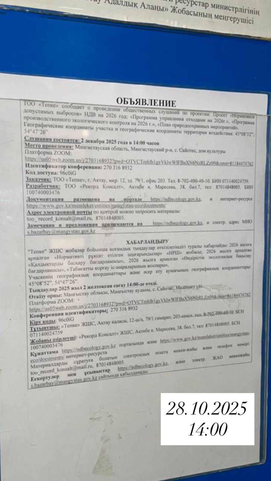 3. Общественные слушания организованны: Управление природных ресурсов и регулирования природопользования Мангистауской области, s.bazarbay@mangystau.gov.kz,