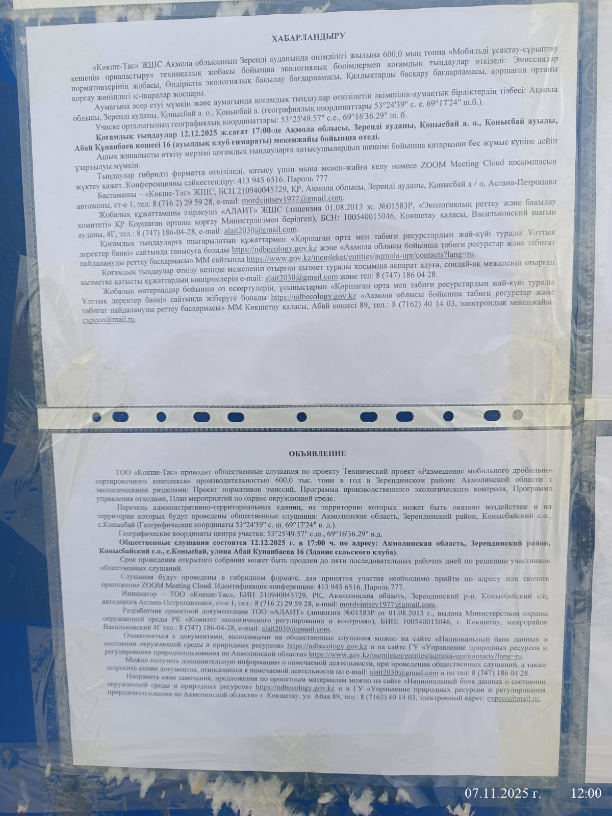 3. Общественные слушания организованны: Управление природных ресурсов и регулирования природопользования Акмолинской области, expeco@mail.ru,