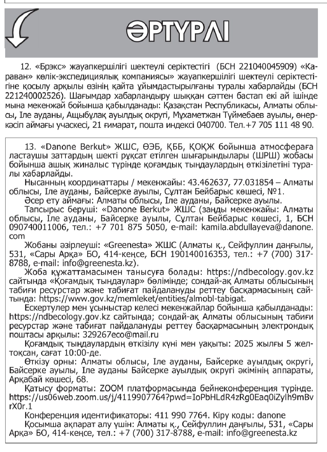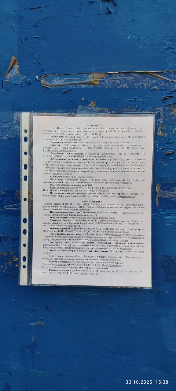 3. Общественные слушания организованны: Управление природных ресурсов и регулирования природопользования Алматинской области, 329267eco@mail.ru,
