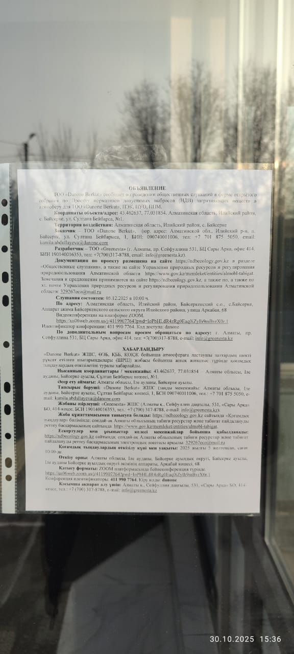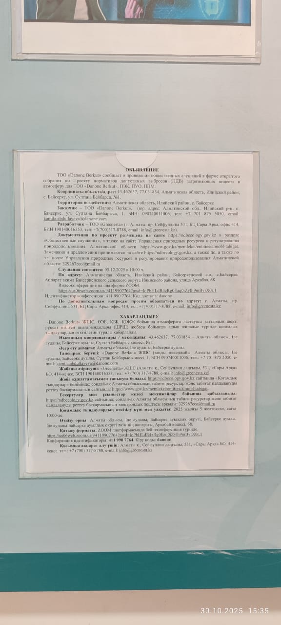 6.3. расположение мест, специально предназначенных для Размещения печатных объявлений (доски объявлений): Аппарат акима Байсеркенского сельского округа Илийского районаОсновным видом деятельности завода ТОО «Danone Berkut» является переработка молока, выработка широкого ассортимента йогуртов питьевых в бутылках и стаканчиках. Мощность завода по переработке молока – более 200 тонн в сутки. Адрес места нахождения ЮЛ: Республика Казахстан, Алматинская область, Илийский район, Байсеркинский сельский округ, улица Султан Бейбарыс, дом №1.