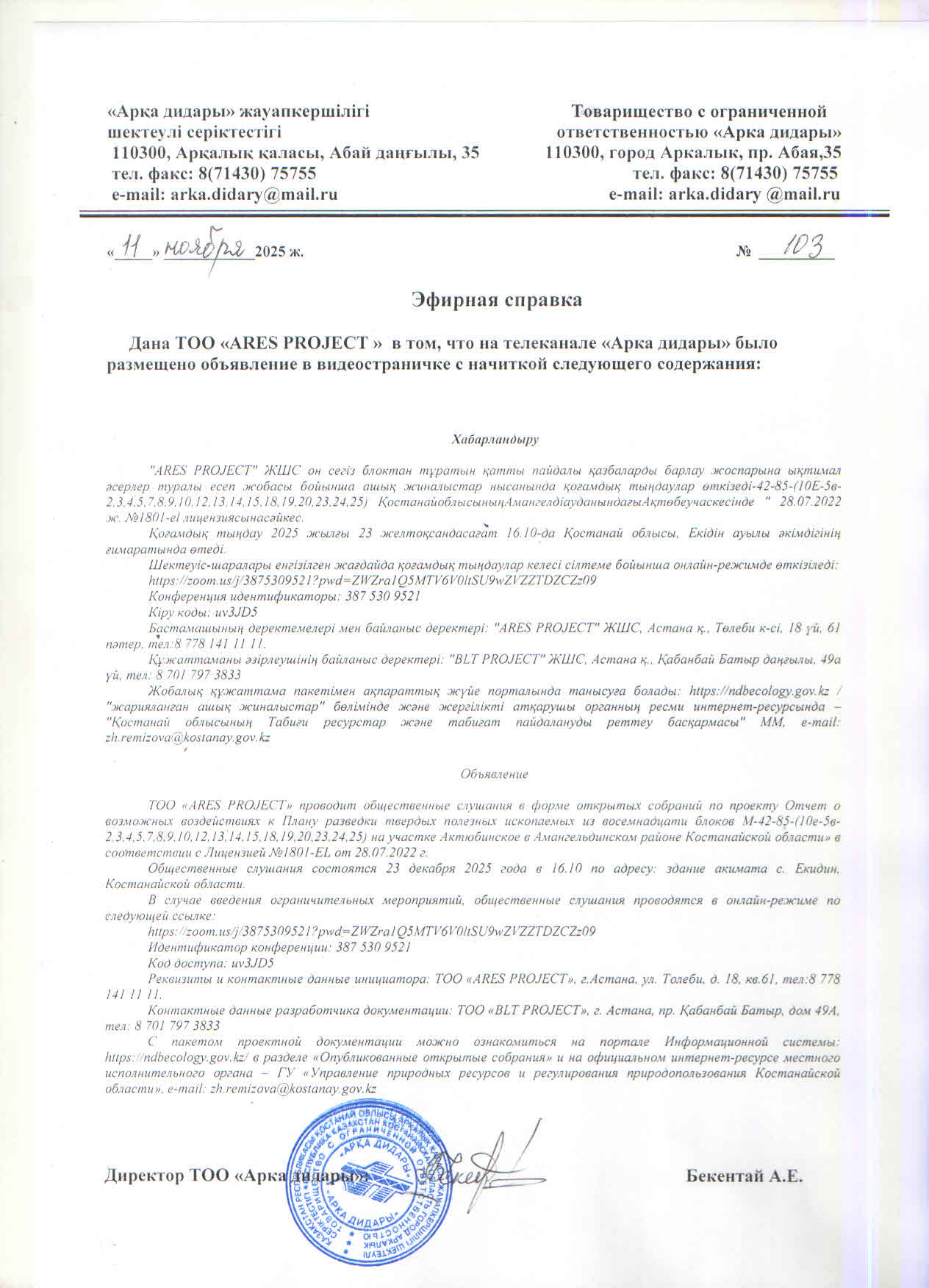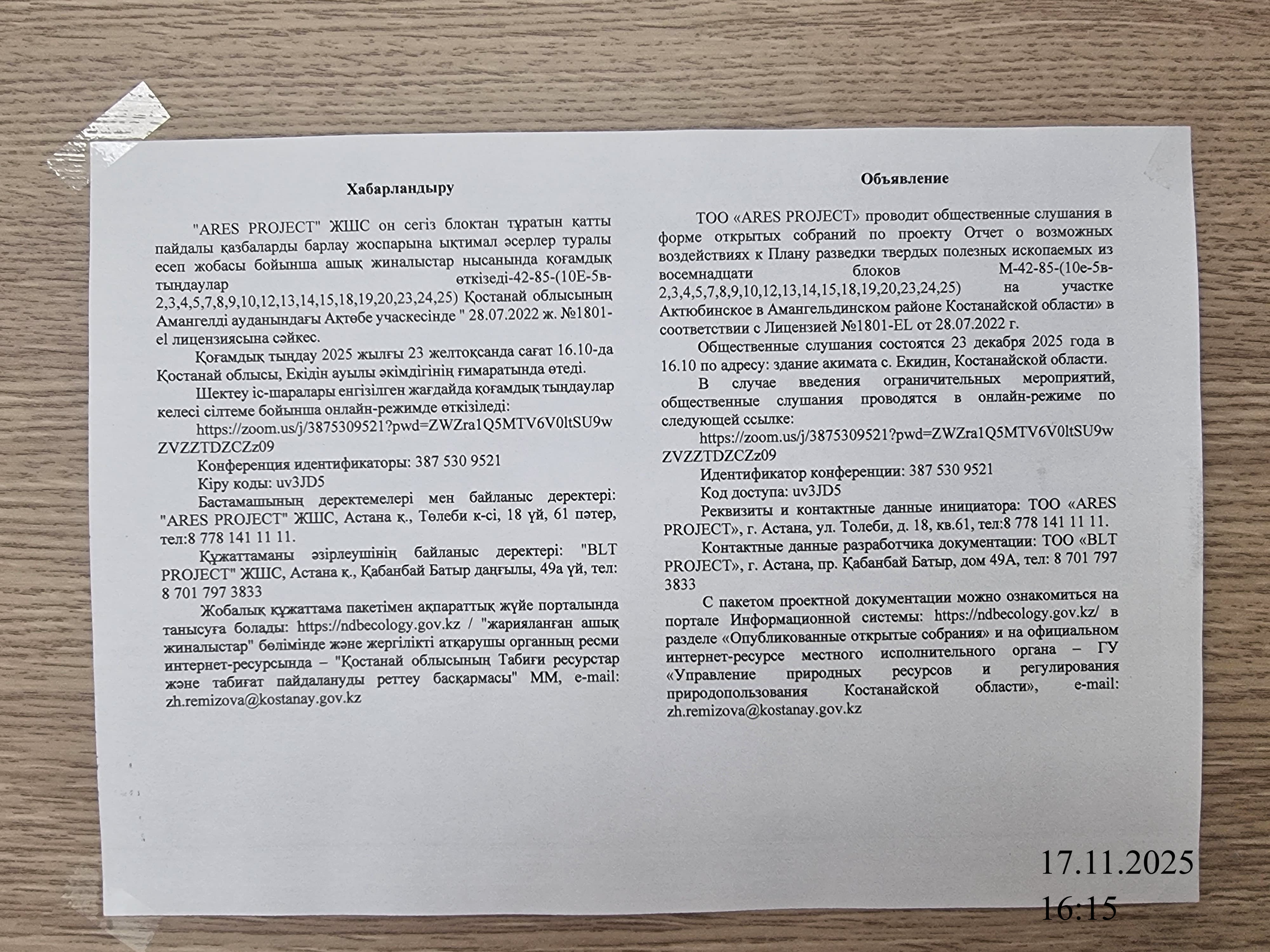 3. Общественные слушания организованны: Управление природных ресурсов и регулирования природопользования Костанайской области, zh.remizova@kostanay.gov.kz, 87142 546166,